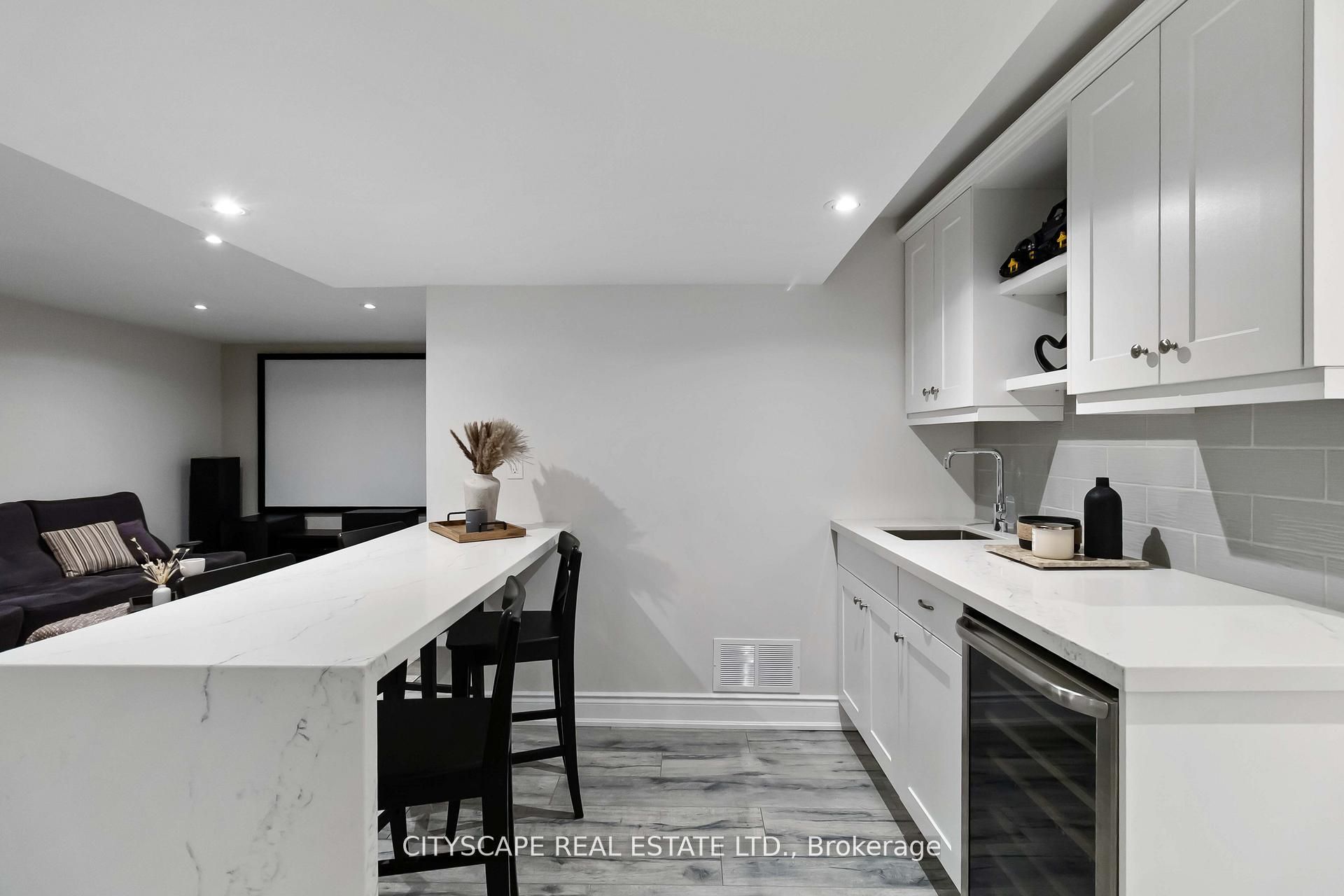 • Finished basement includes a wet bar and built-in speakers for entertainment.
