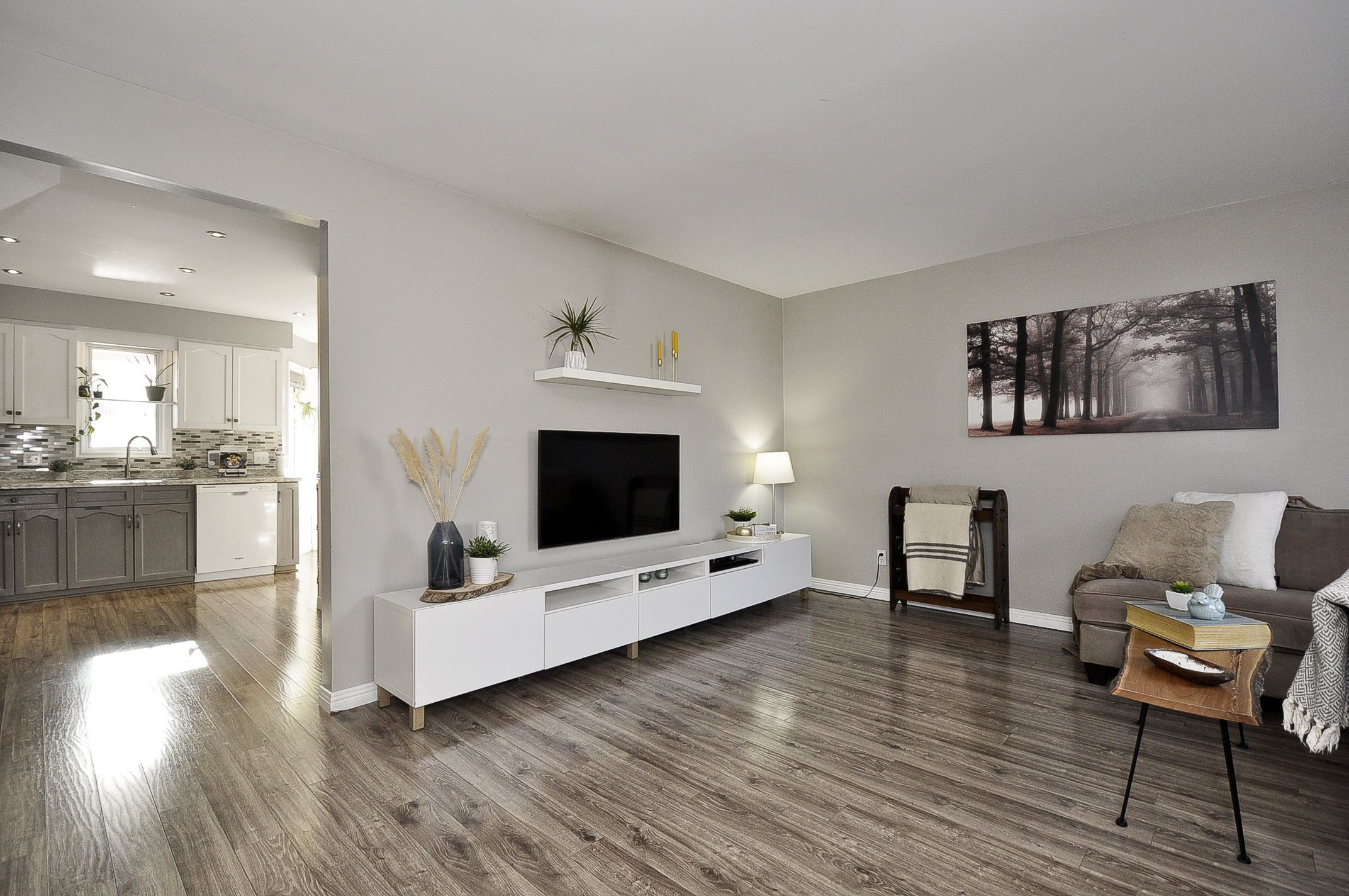 • Open eat-in kitchen with modern cabinets and ample counter space.