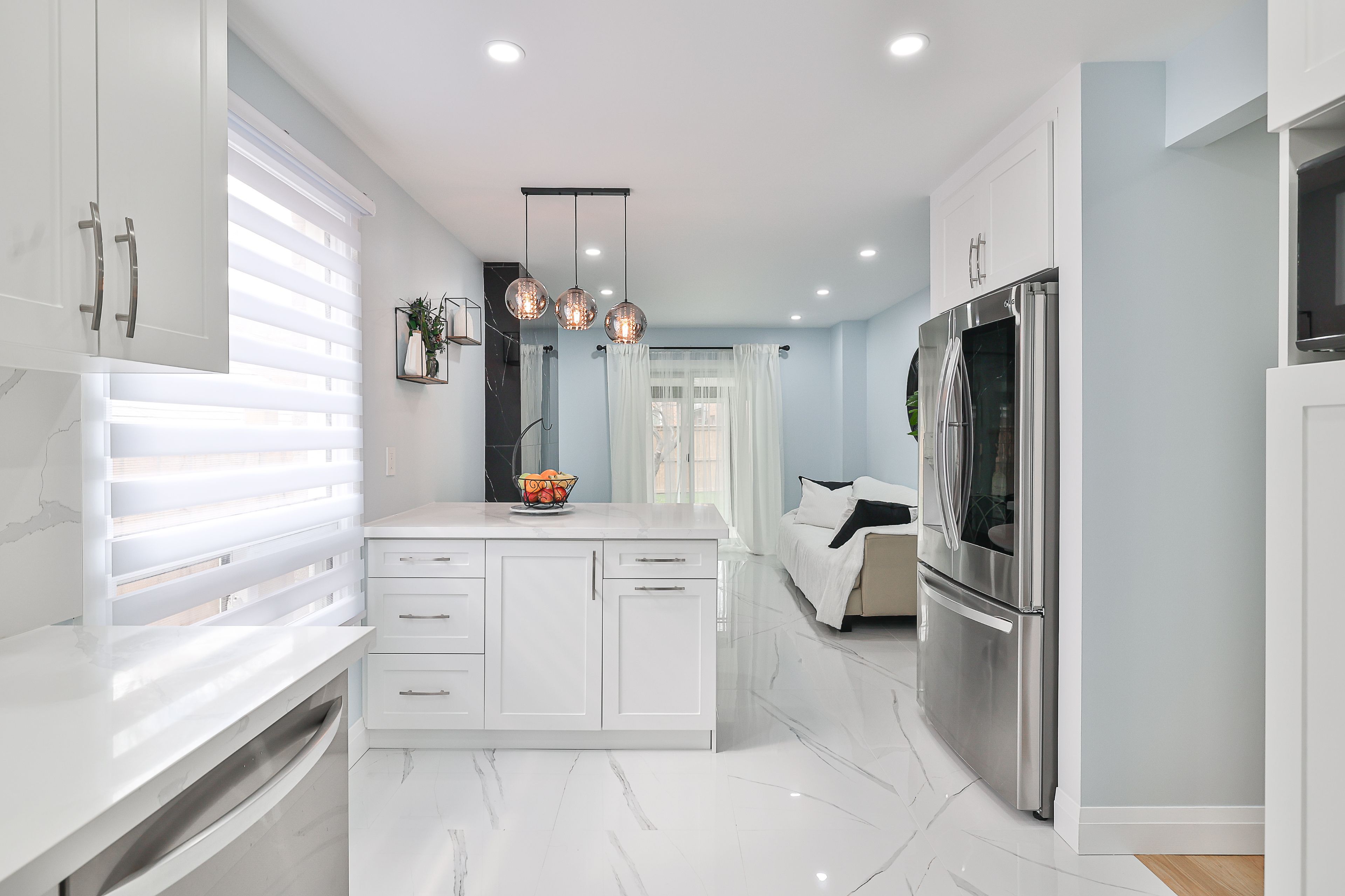 • Open-concept kitchen features quartz countertops and smart appliances.