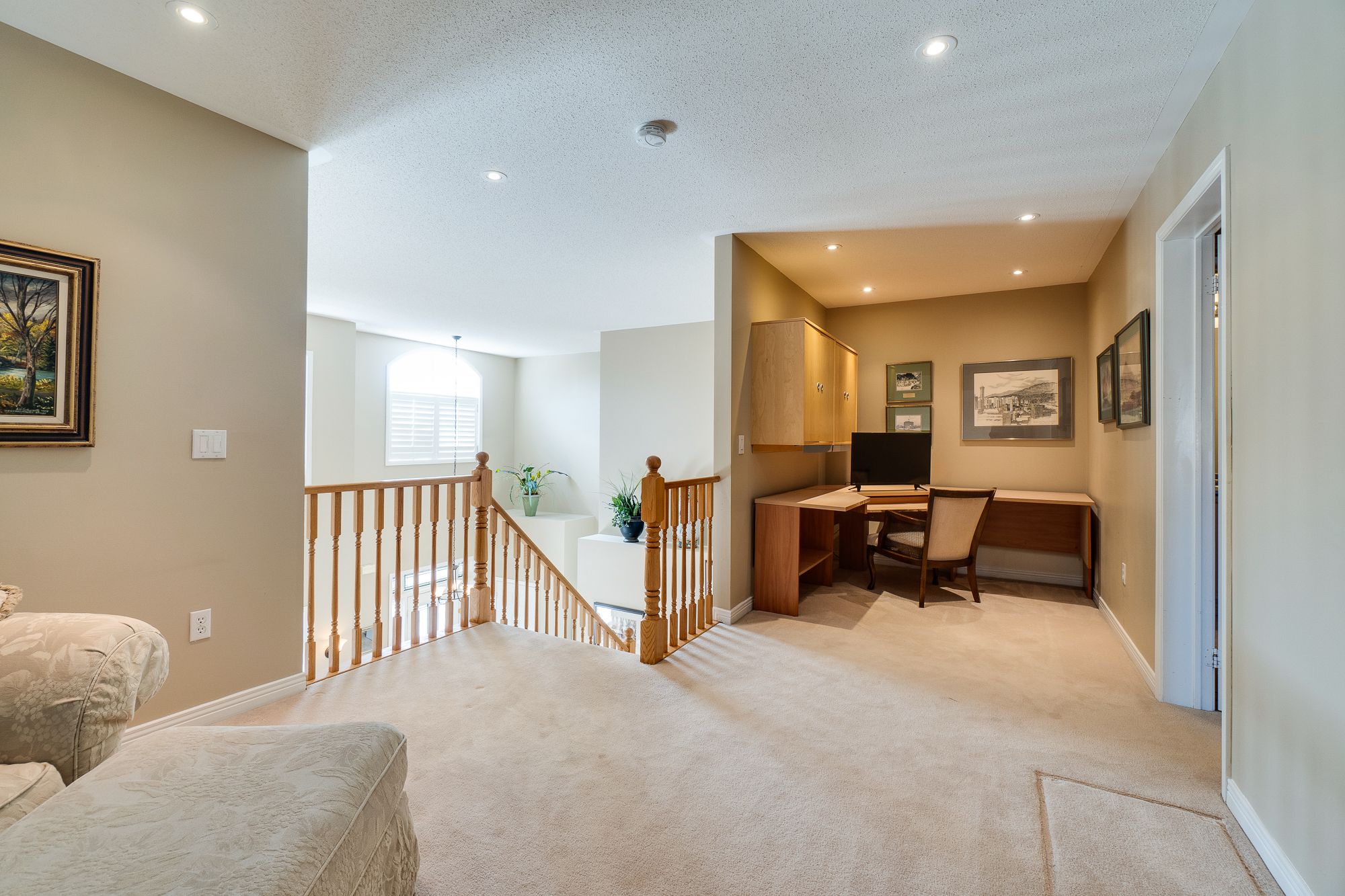Stunning and exceptionally well laid out end-unit bungaloft in highly sought-after millcroft community with nearly 3500 sq ft of total living space! Tucked away at the back of a quiet, mature and exclusive community sits this 2200+ sq ft home with 3 + 2 beds and 4 baths which has been meticulously maintained by the original owners. This thoughtfully laid out home features an open concept living and dining area with soaring vaulted ceilings, a cozy gas fireplace, hardwood floors and floor to ceiling windows which flood the home with natural light. The main floor primary suite offers a spacious walk-in closet and a well-appointed ensuite bathroom, while main-level laundry and direct access to the double garage add everyday convenience. The main floor includes a second bedroom (which can function well as a study/office) with access to a full 4-piece bath. The second-floor family room loft provides a versatile space which can be used as a cozy tv area, home office or separate guest area, complete with a large third bedroom with walk-in closet and full ensuite bath. The lower level provides expanded living space with a welcoming rec room with cozy gas fireplace ideal for movie nights, watching sports, entertaining or games. Basement has a walk-in cold cellar/wine cellar (rare original builder upgrade). The lower level also features two additional bedrooms (with plenty of storage and one with a cedar lined closet) which can function as a hobby room, office/study or gym and includes another full bathroom. The large utility room also includes a large workshop. This rarely offered end-unit offers privacy, functionality and flexibility/opportunity for customization in the heart of prestigious millcroft.