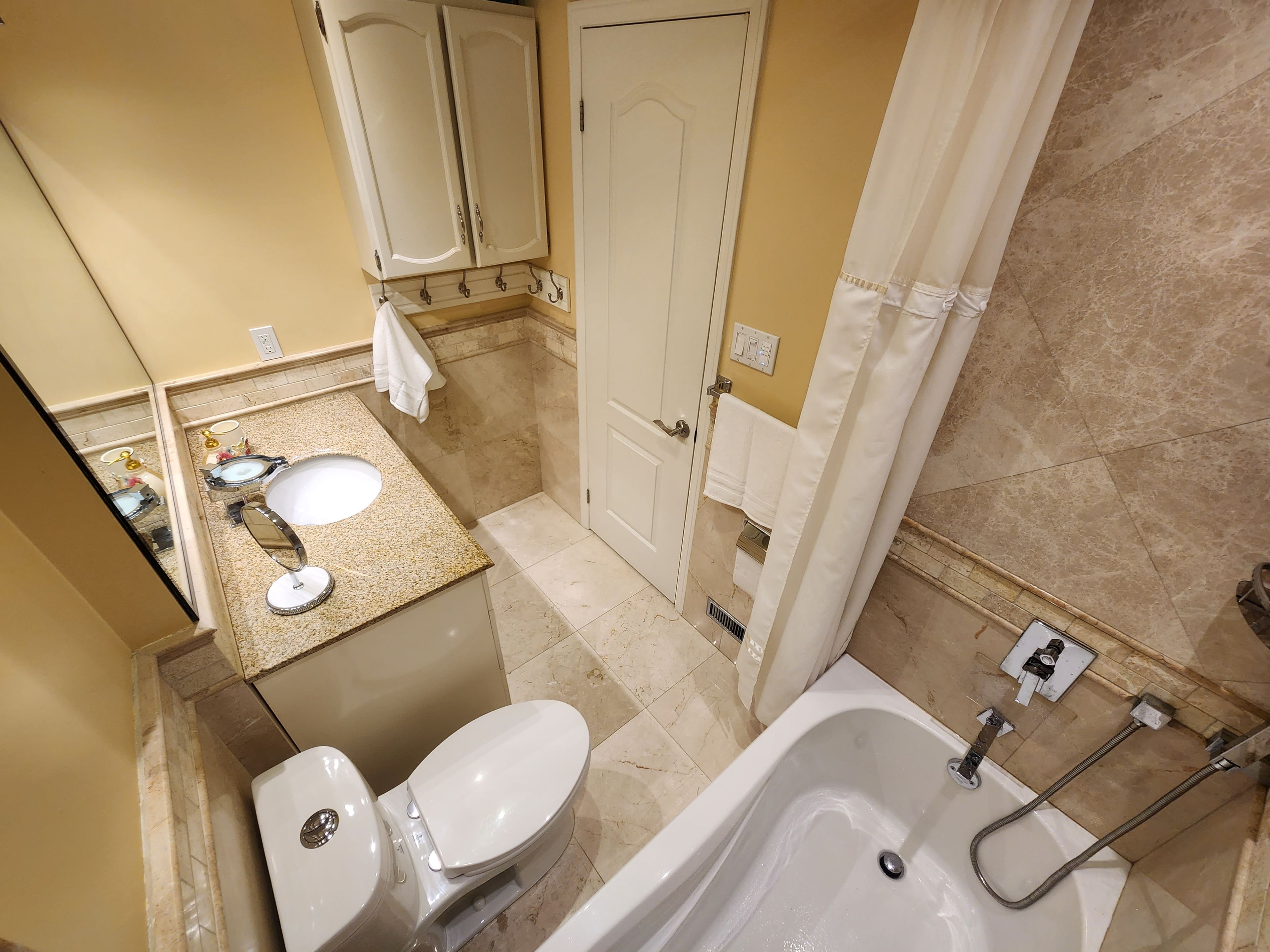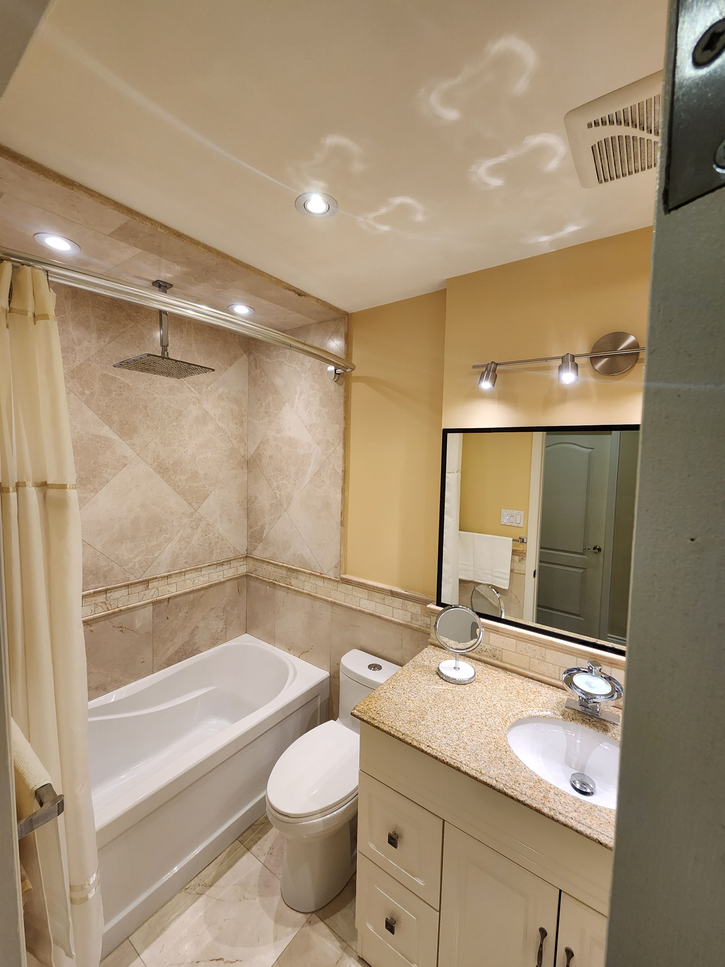 • Renovated bathrooms with natural limestone tiles and rain shower heads.