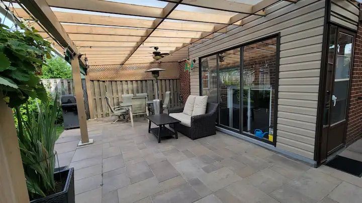 • Beautifully landscaped backyard with a wood pergola and patio speakers.
