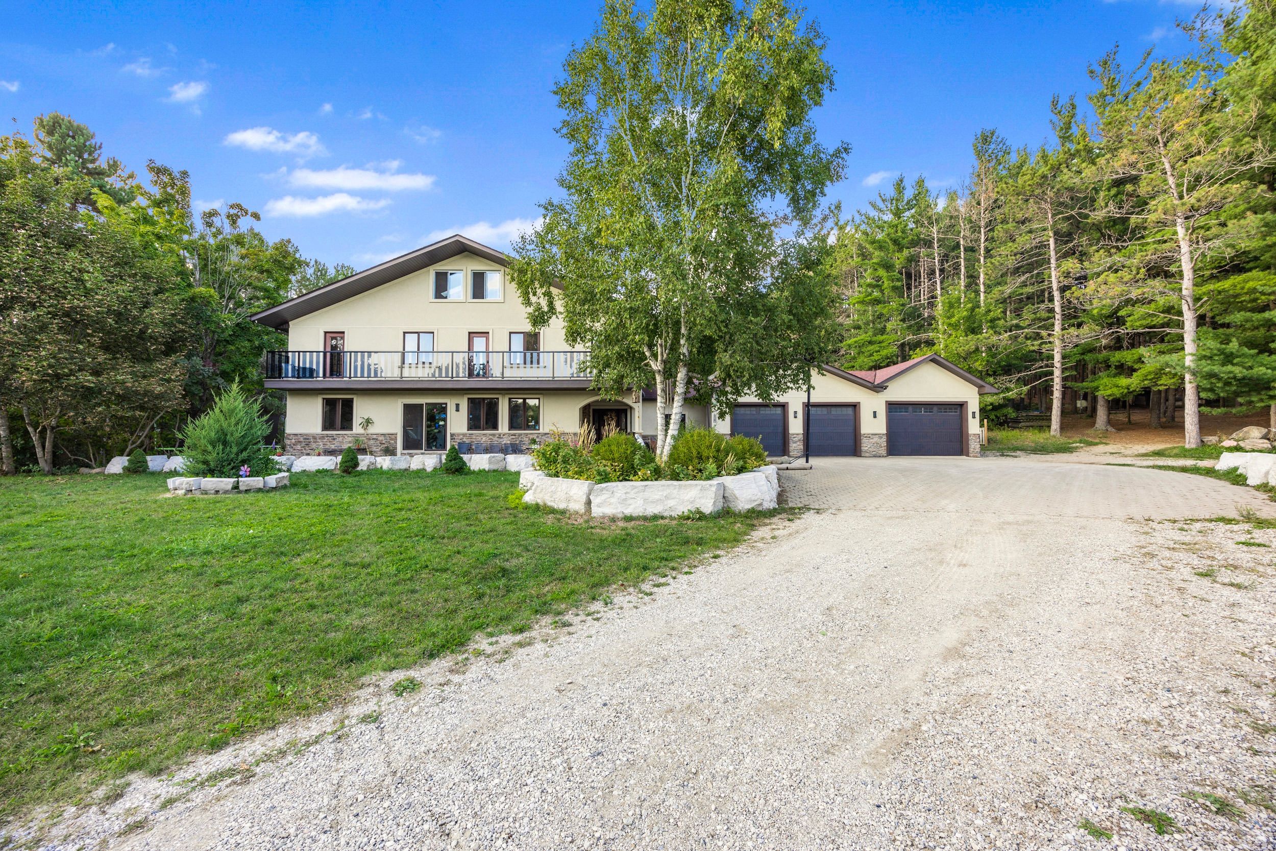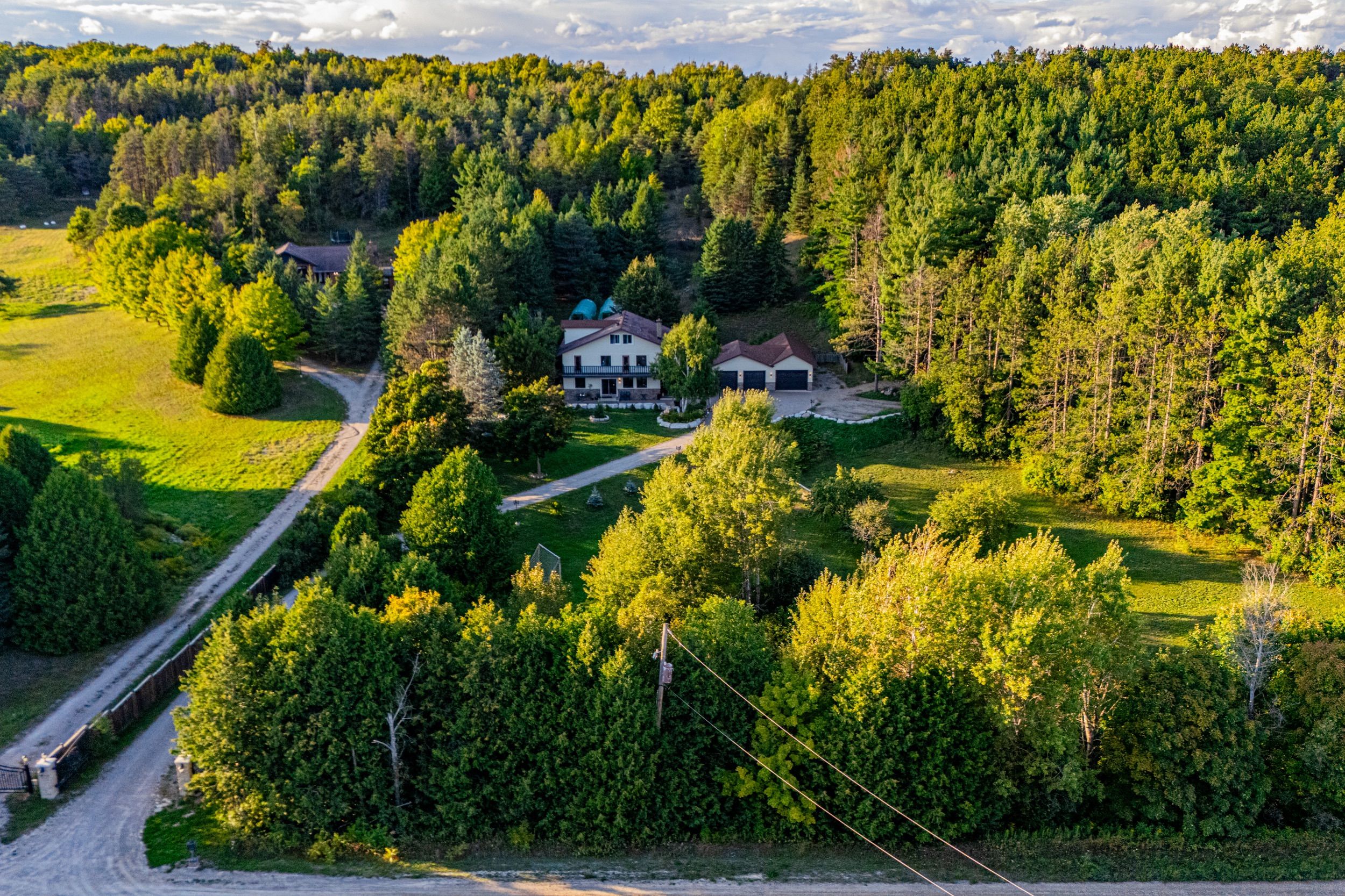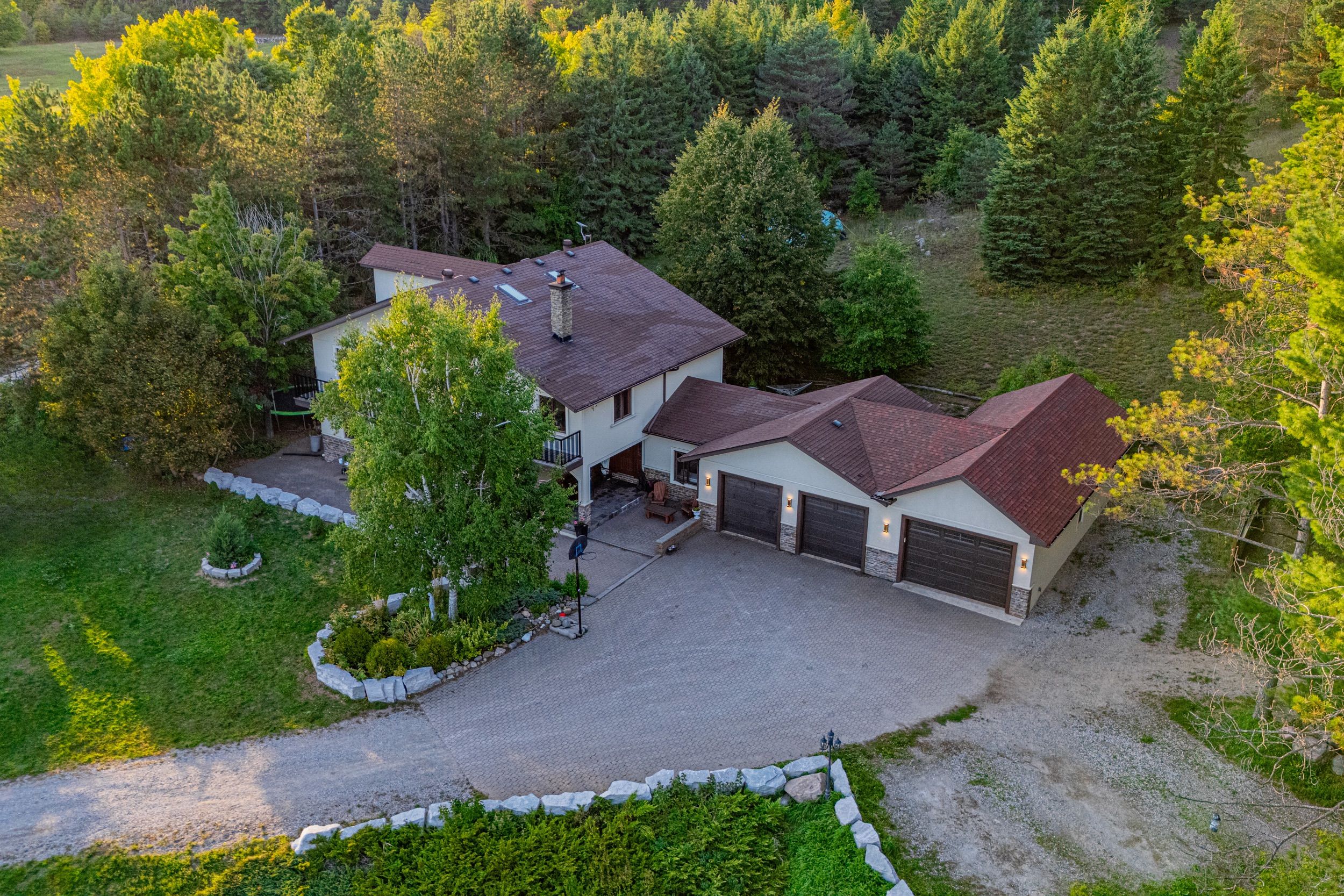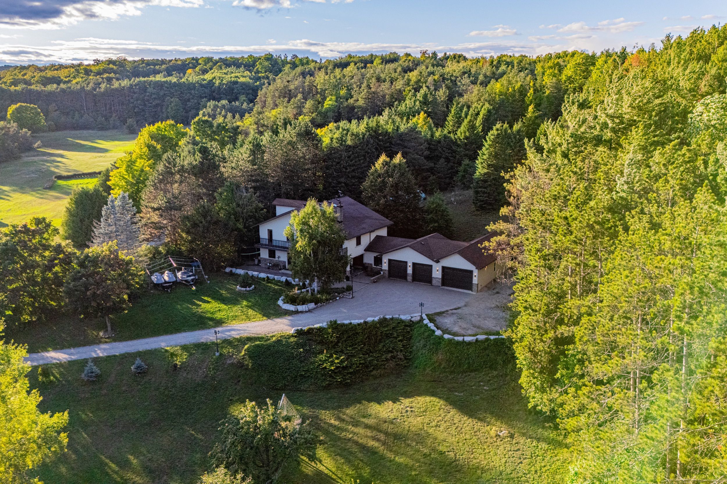 Magnificent estate-style home on over 17 acres of land, offering the perfect blend of luxury, nature and convenience. Meandering private trails, lush landscapes and stunning views create a year-round vacation retreat. A custom gate leads to an interlock driveway and parking area for 8+ vehicles and a 3-car garage with drive-through access. The main floor features a bright living room with wood-burning ceramic stove, formal dining, laundry, office and stylish 3-pc semi-ensuite. The kitchen boasts stainless steel appliances, granite countertops, backsplash, a breakfast bar and walkout to a deck. The second level offers 3 spacious bedrooms, office/study, two elegant bathrooms and a balcony with scenic views. The top-floor oversized primary suite includes skylights and a private 4-pc ensuite. The finished basement expands the living space with a great size recreation room. Enjoy an outdoor paradise just minutes from mono cliffs park, hockley valley resort, mansfield ski club, bruce trail, fine dining, craft brewery and winery. Within 30 minutes you can enjoy skiing at blue mountain or relax at wasaga beach. Vacation living year-round with quick access to airport road, combining privacy with effortless travel. A perfect place to call home!