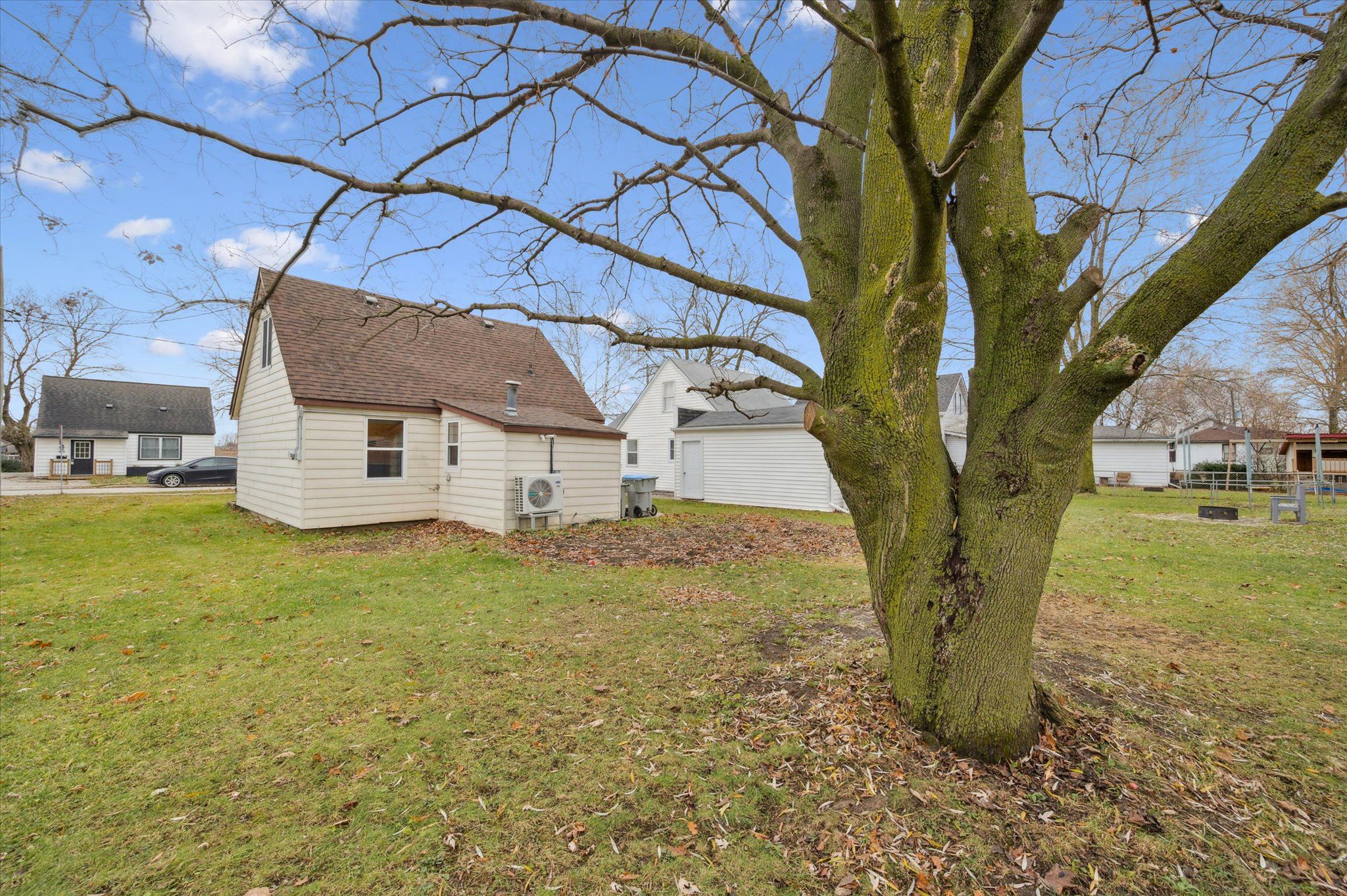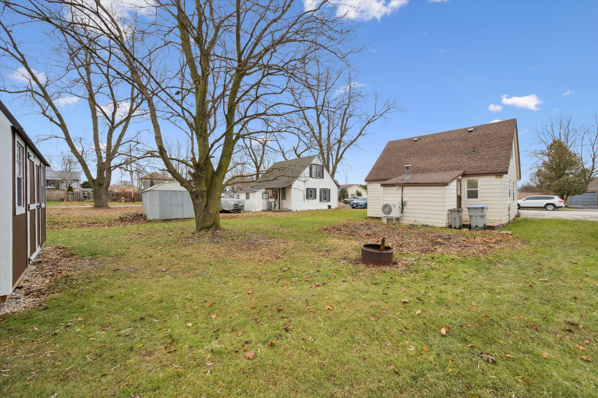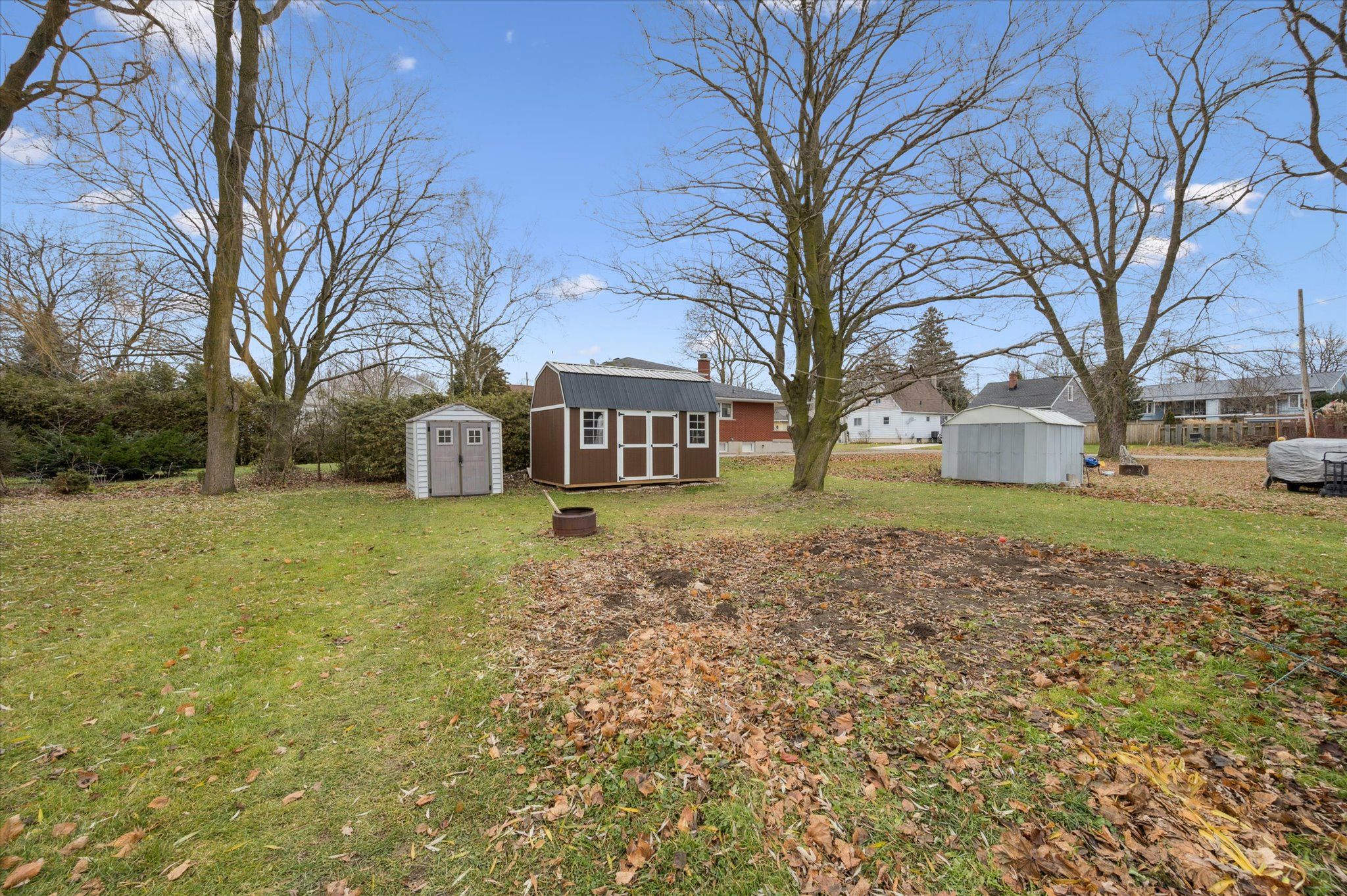 • Large backyard with space for gardening, relaxation, and storage sheds.