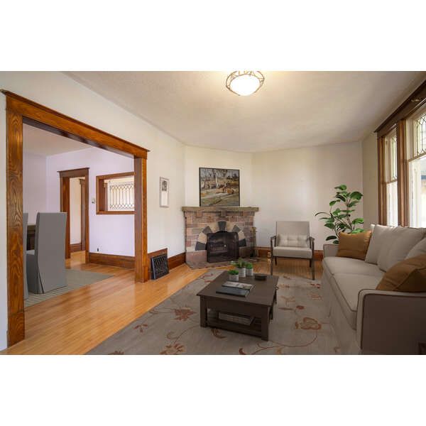 • Inviting living room with original hardwood floors and hand-cut stone fireplace.