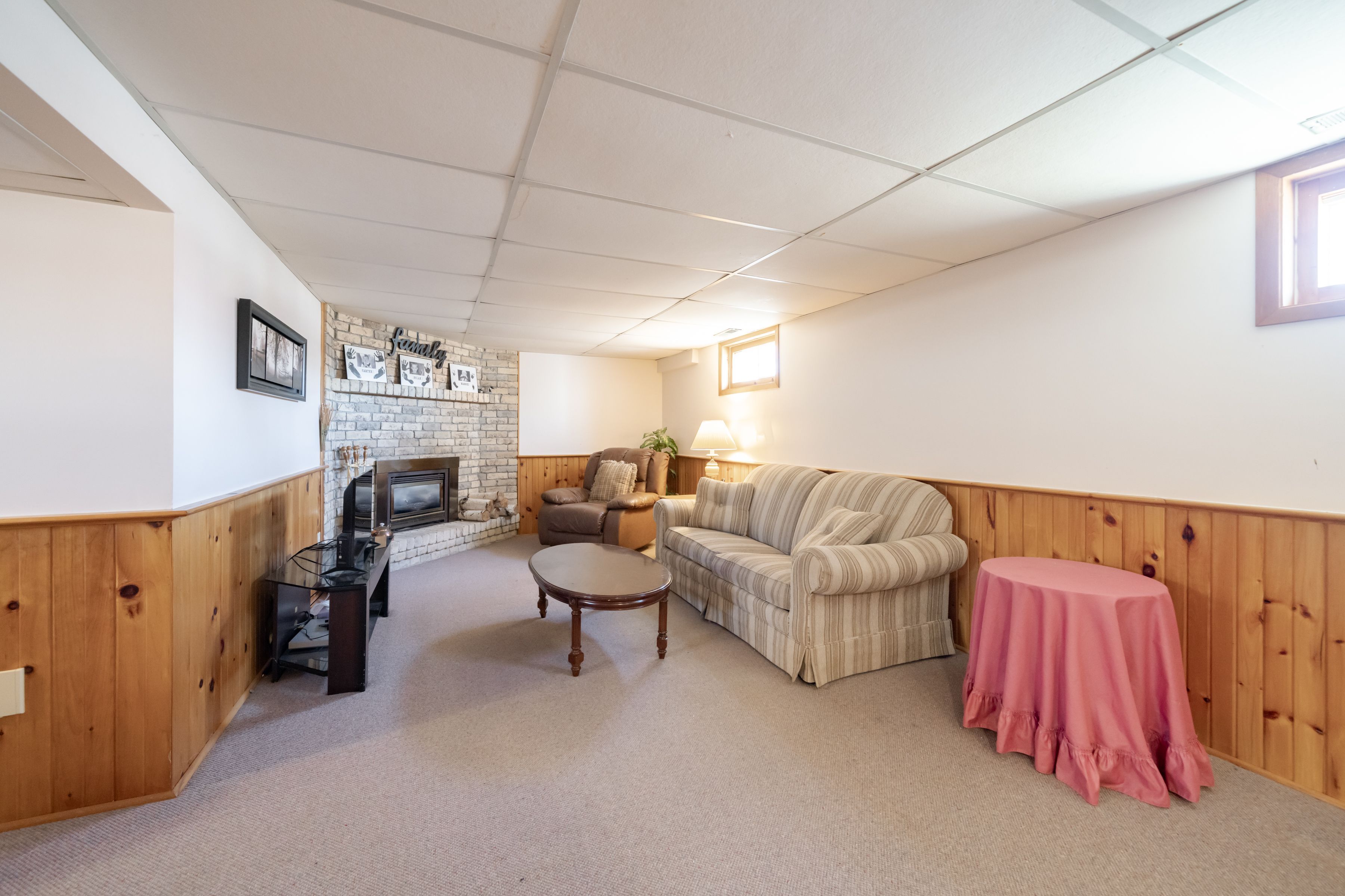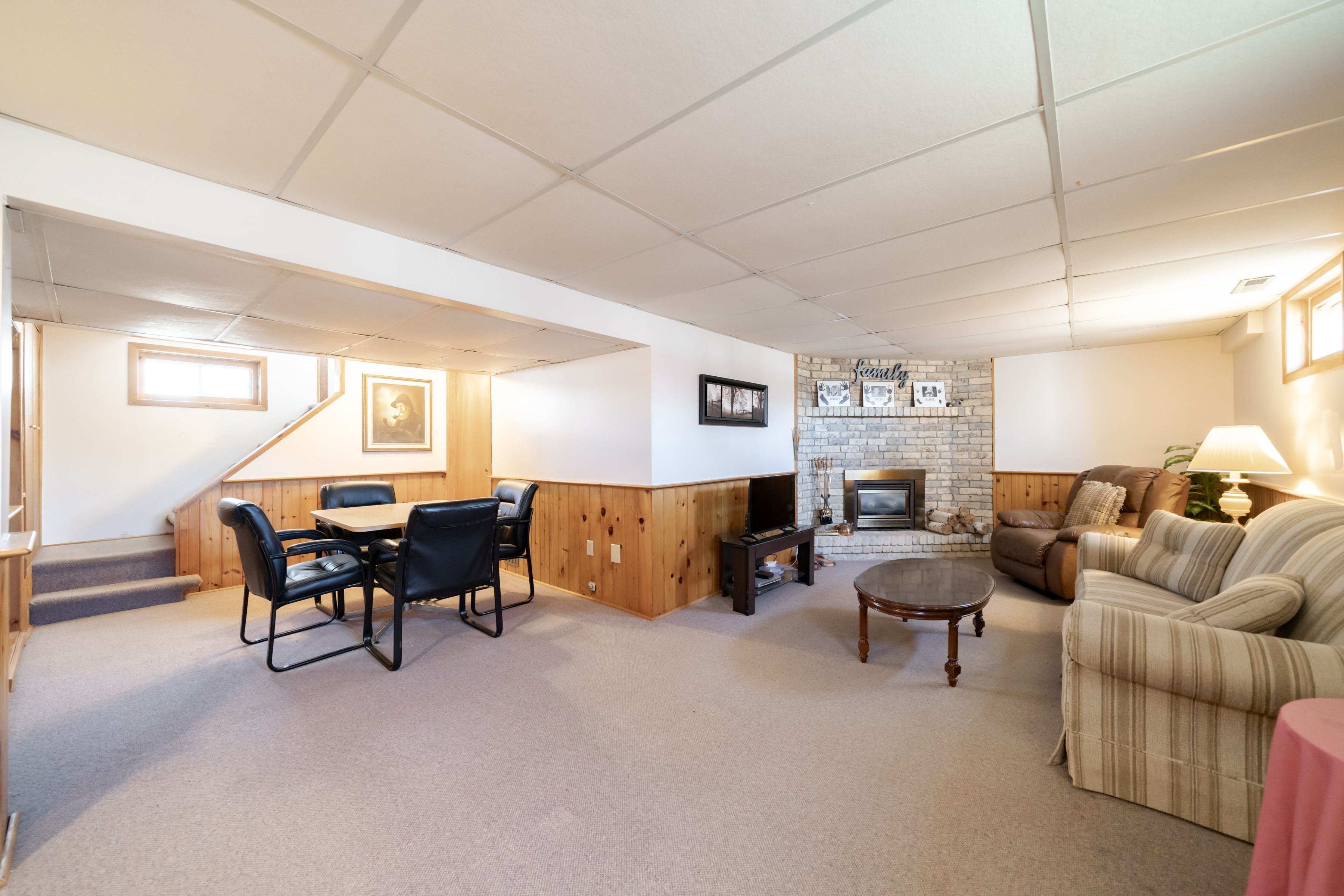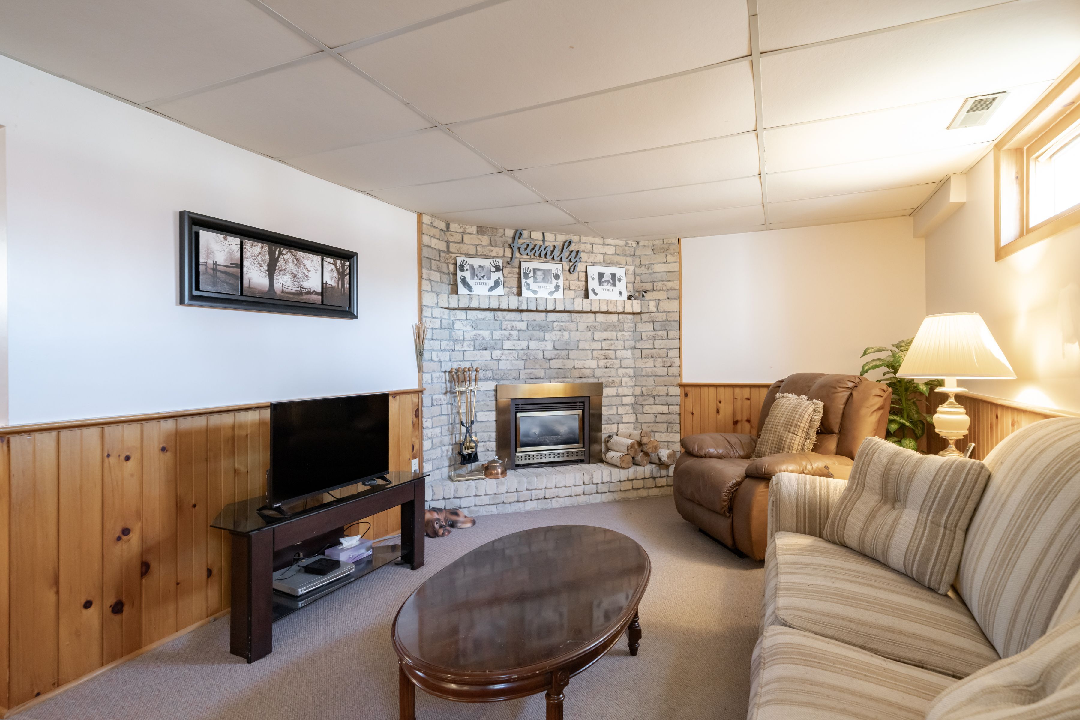 • Open-concept basement recreation room featuring a gas fireplace.