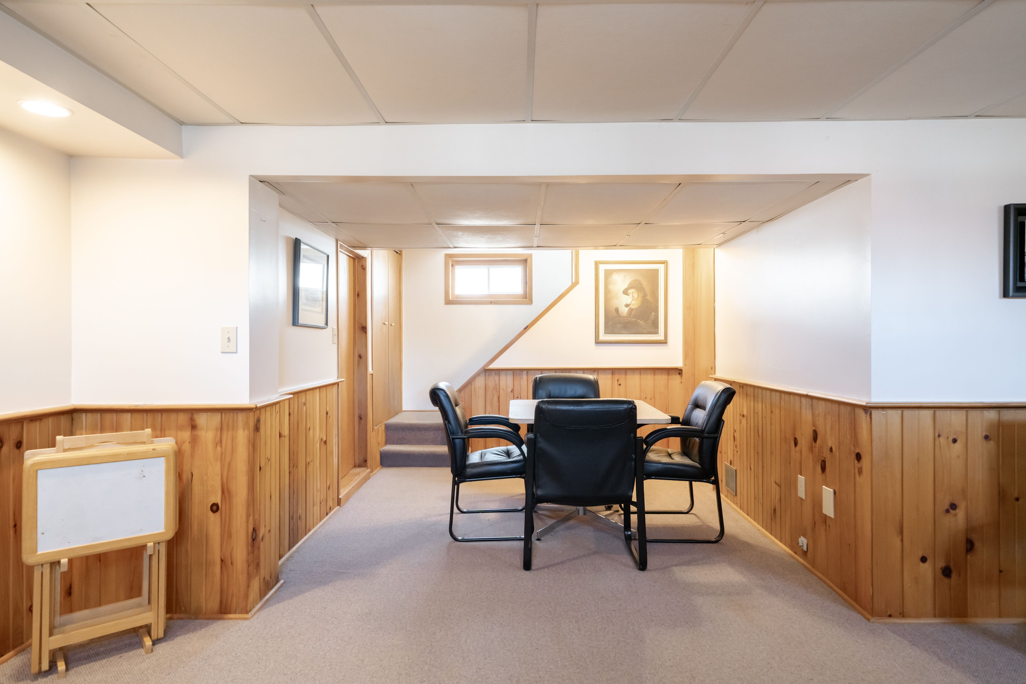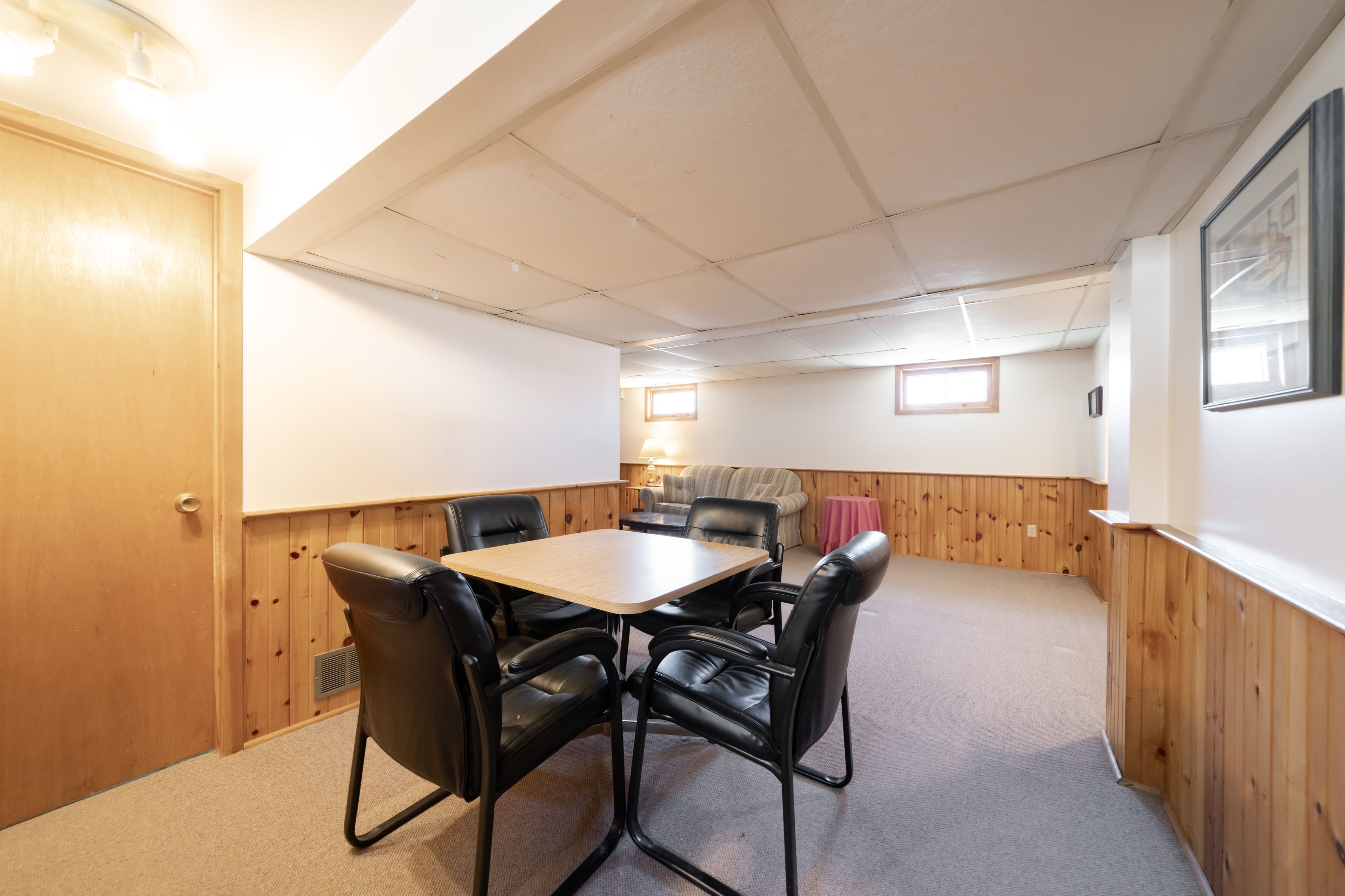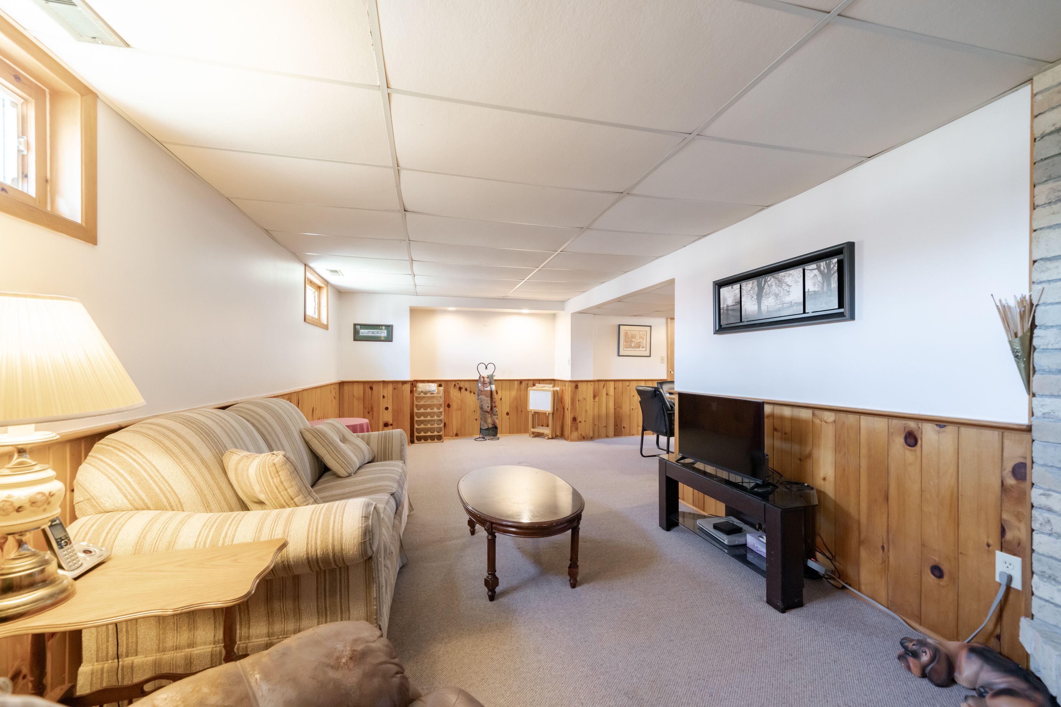 • Open-concept basement recreation room featuring a gas fireplace.