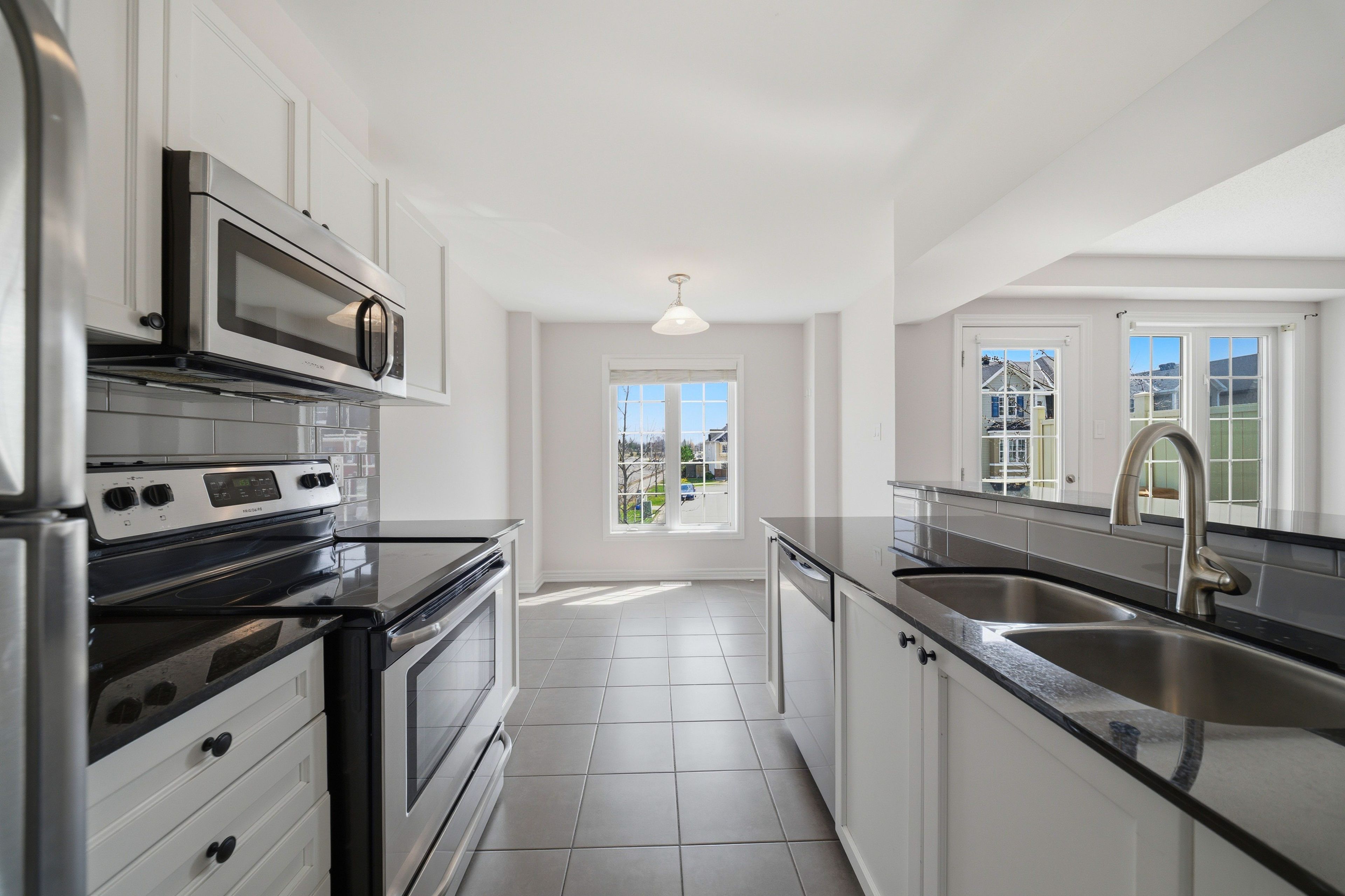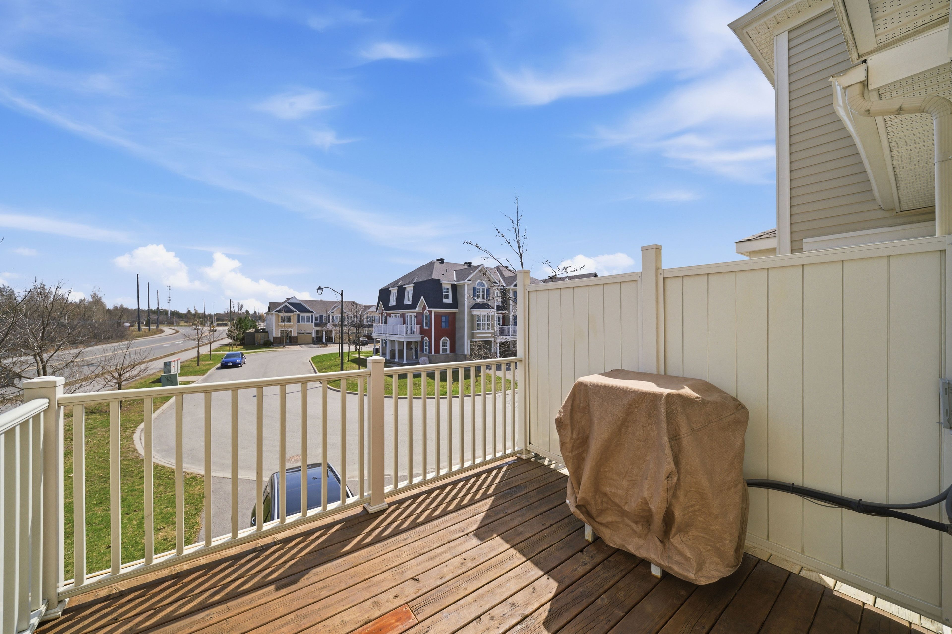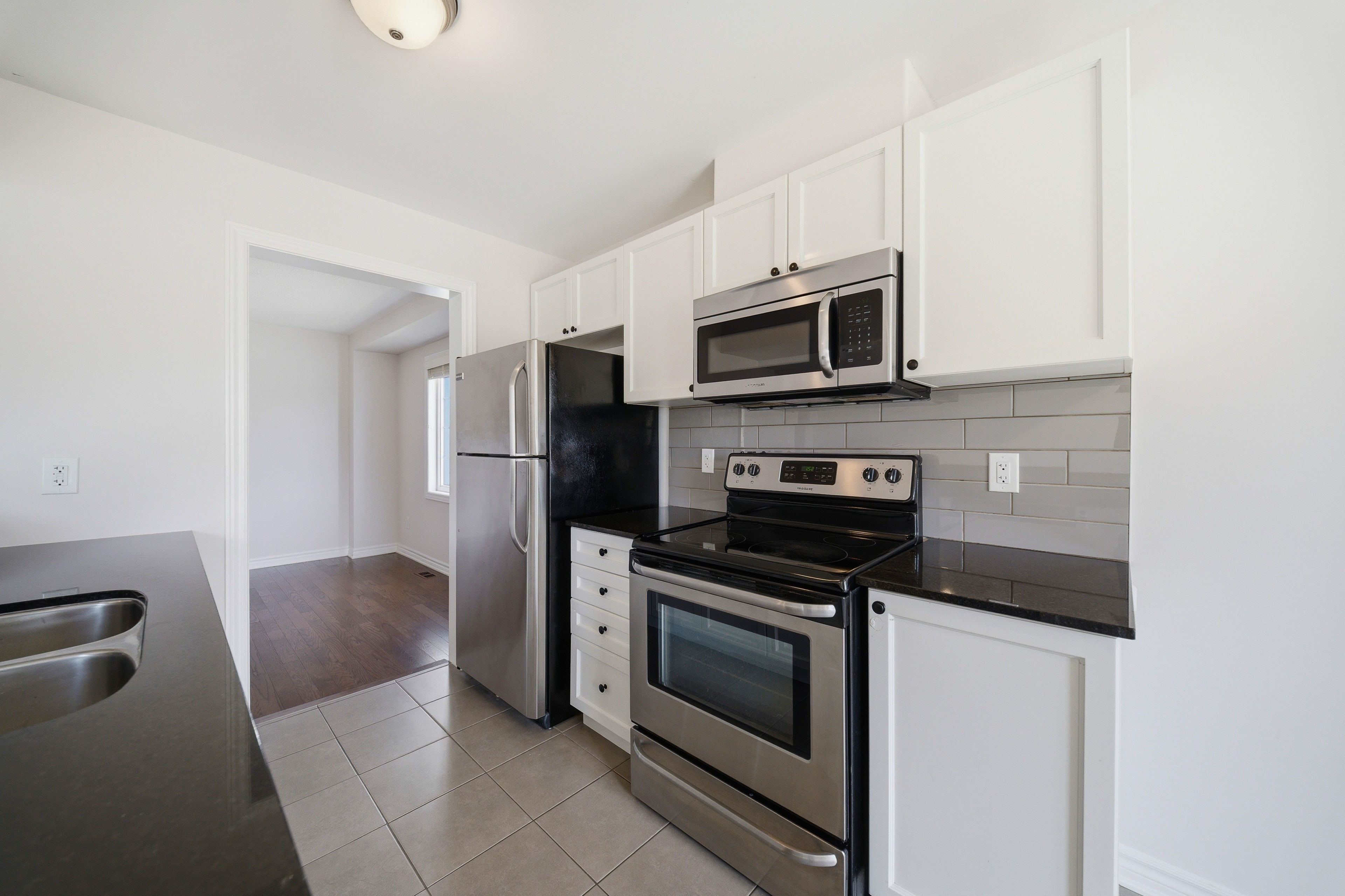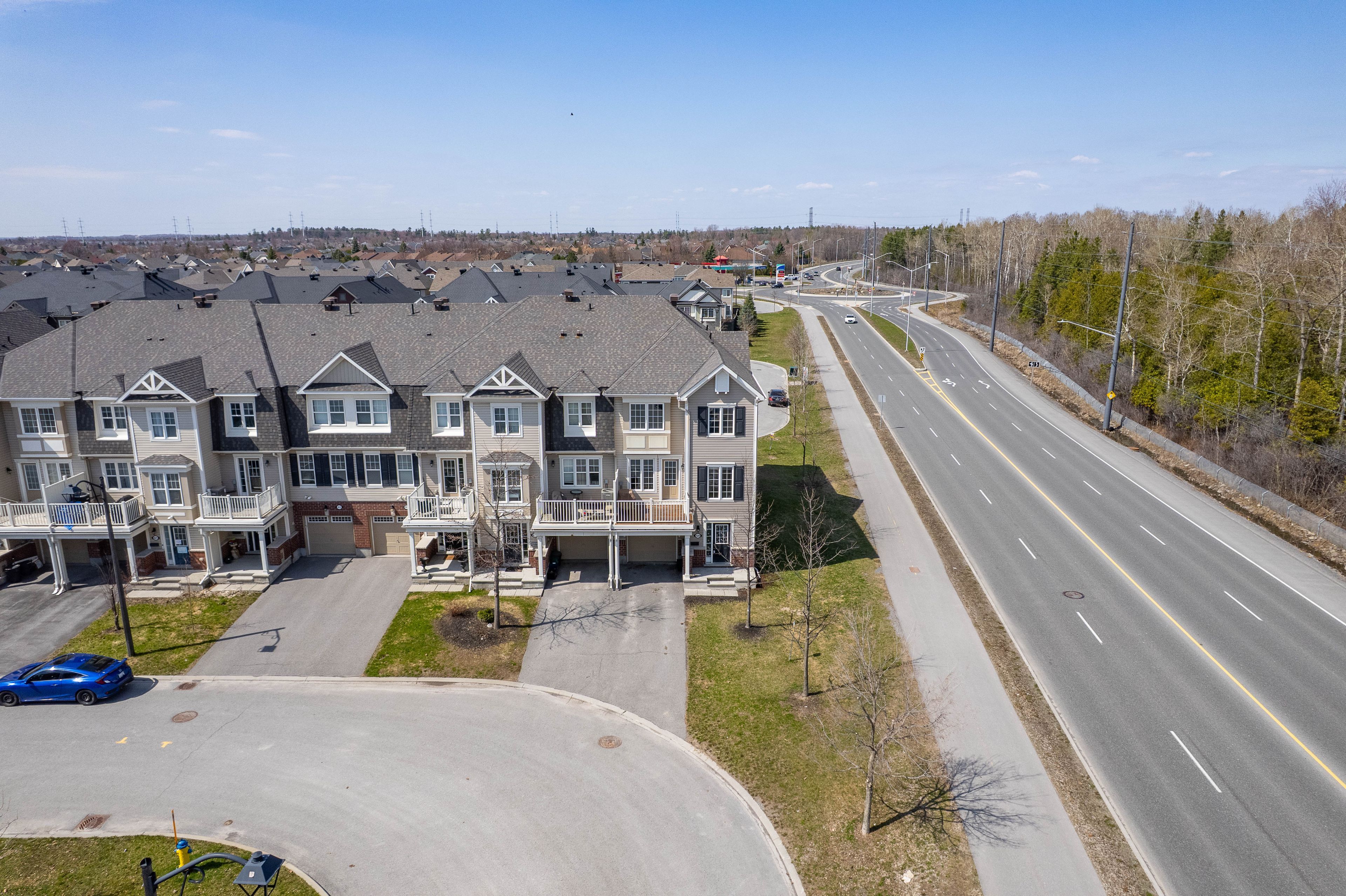 Welcome to 429 rosingdale street, an end-unit freehold townhouse set apart by its position at the very end of the street with a private side yard you simply do not get with the rest of the row. Step inside to a tiled foyer with interior access from the attached garage, leading to a dedicated laundry room with a window and front-load washer and dryer, plus a utility room that keeps everyday living organized. The main level is finished with rich dark hardwood and an open-concept layout that brings the living room, dining area, and kitchen together without losing distinct zones for each. The kitchen anchors the floor with white shaker cabinetry, dark granite counters, a grey subway tile backsplash, stainless appliances, and a peninsula breakfast bar that doubles as a casual eat-in spot, while the dining area sits bright and open under a chandelier with room for a full table. Patio doors off the living room lead to a private wood-deck balcony with white railings, the perfect place for morning coffee or weeknight grilling. A powder room on this level keeps things practical for guests. Upstairs, the primary suite features a walk-in closet and a private ensuite with a double-sink vanity, a setup you rarely see in a townhouse. A second well-sized bedroom and a full bathroom with a soaker tub round out the level. Outside, the end-of-street location, side yard, attached garage, and private driveway give you parking and elbow room you would expect in a much larger property. Steps from parks, walking trails, schools, the community campus, and a shopping plaza with everyday essentials, this is kanata living done right