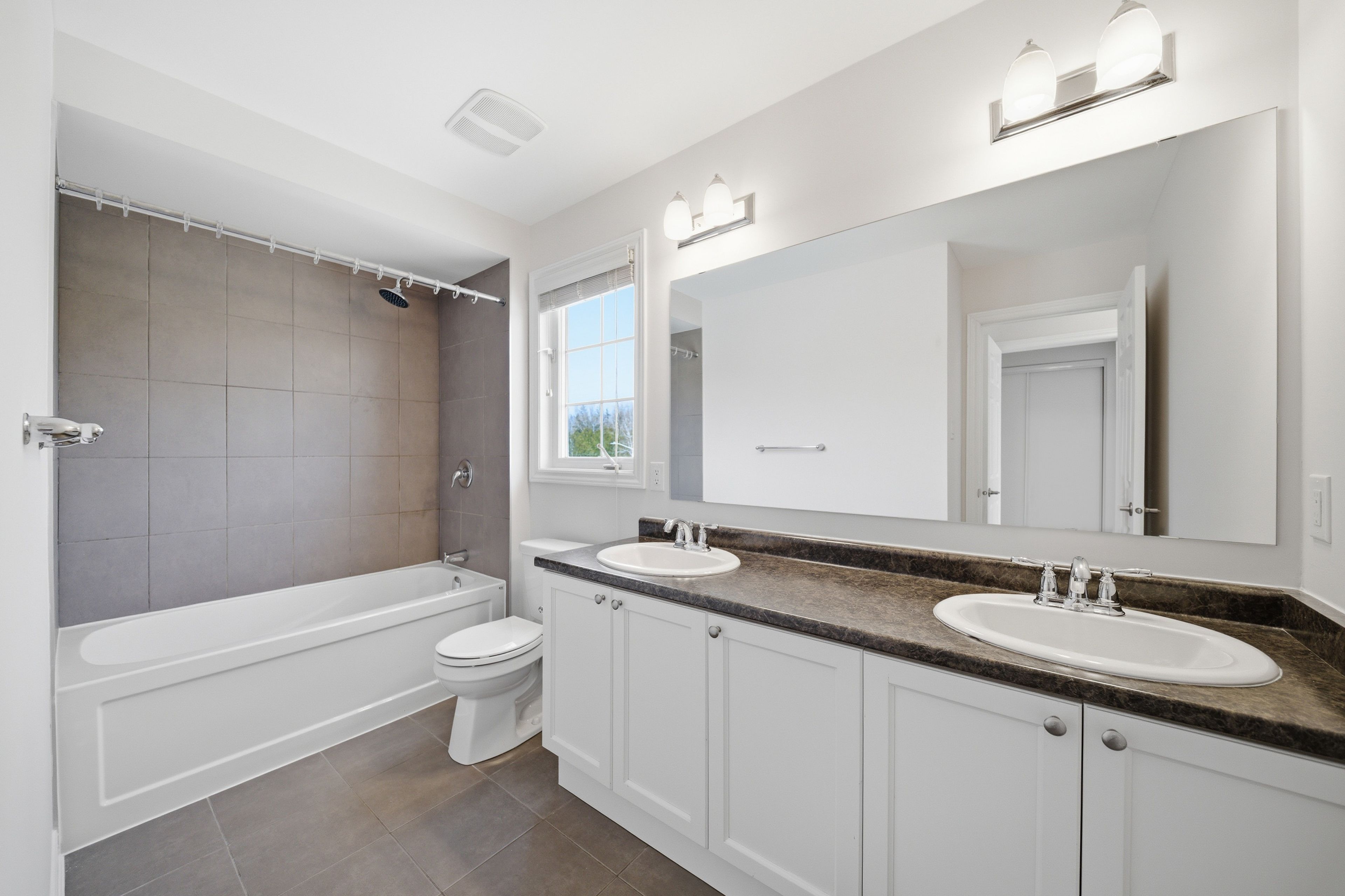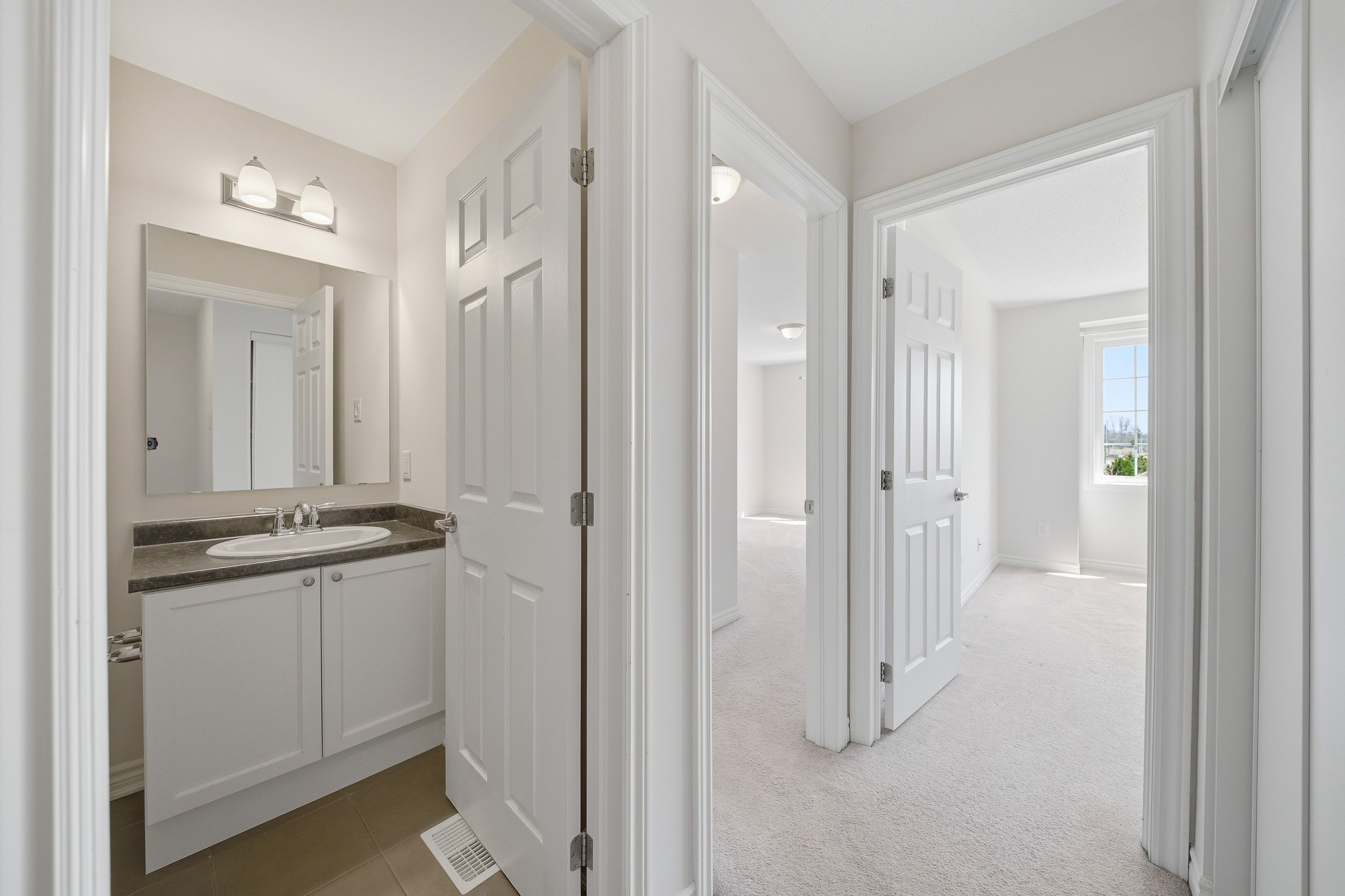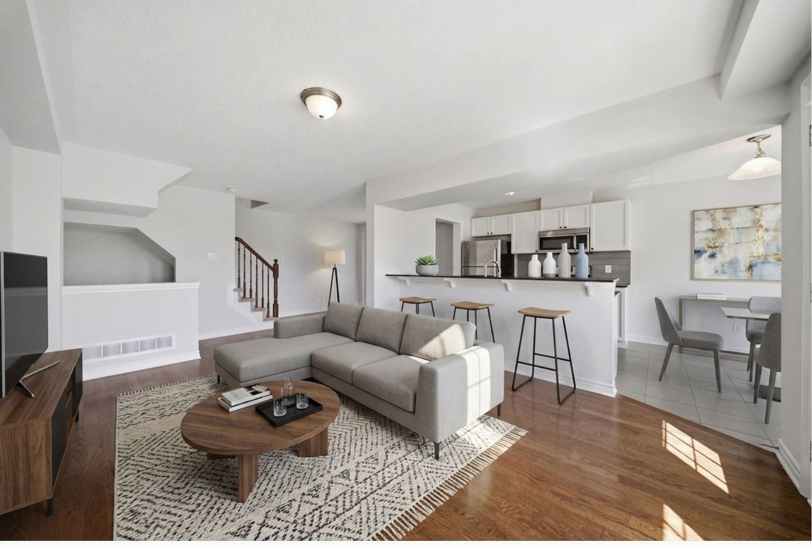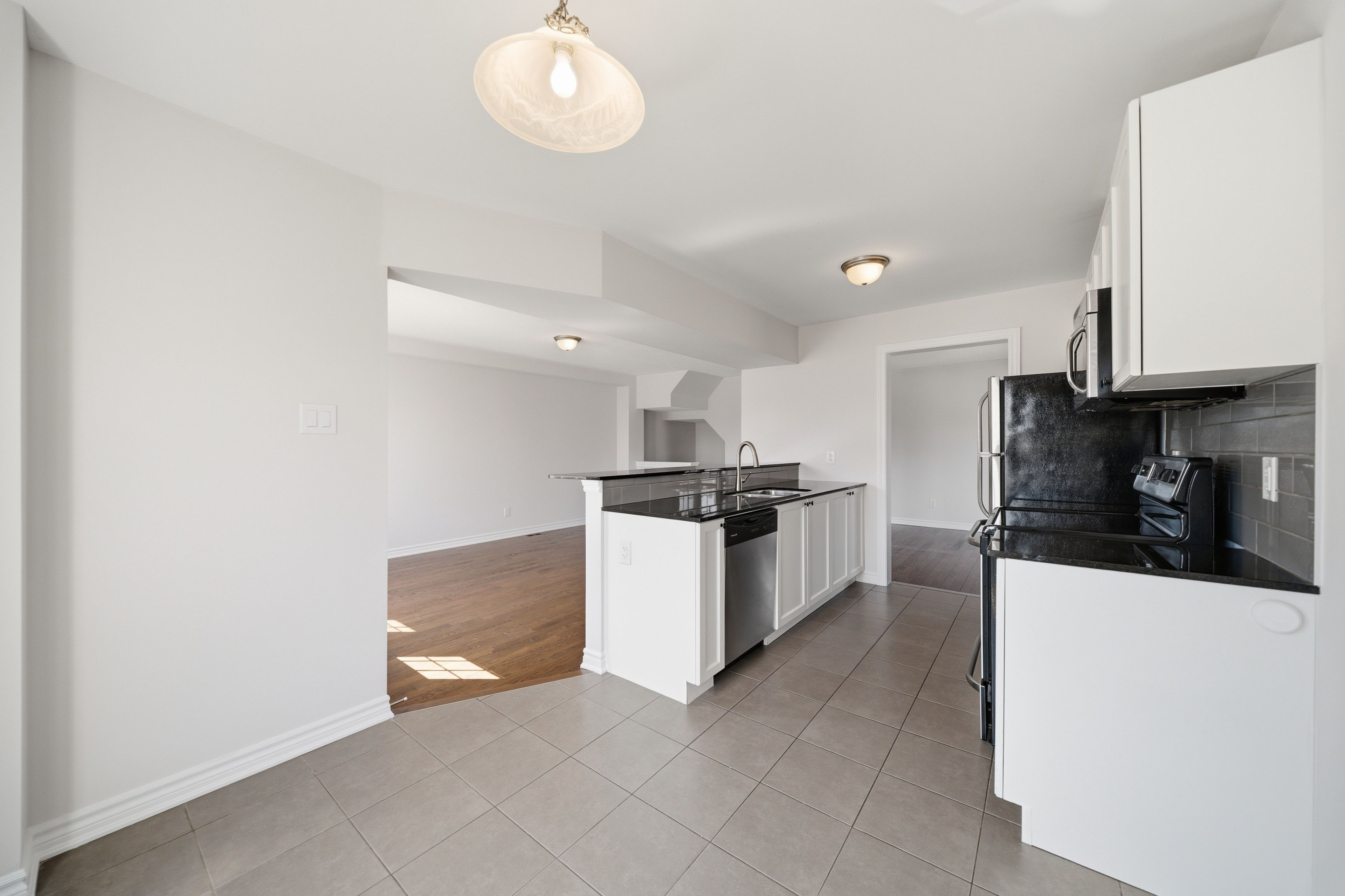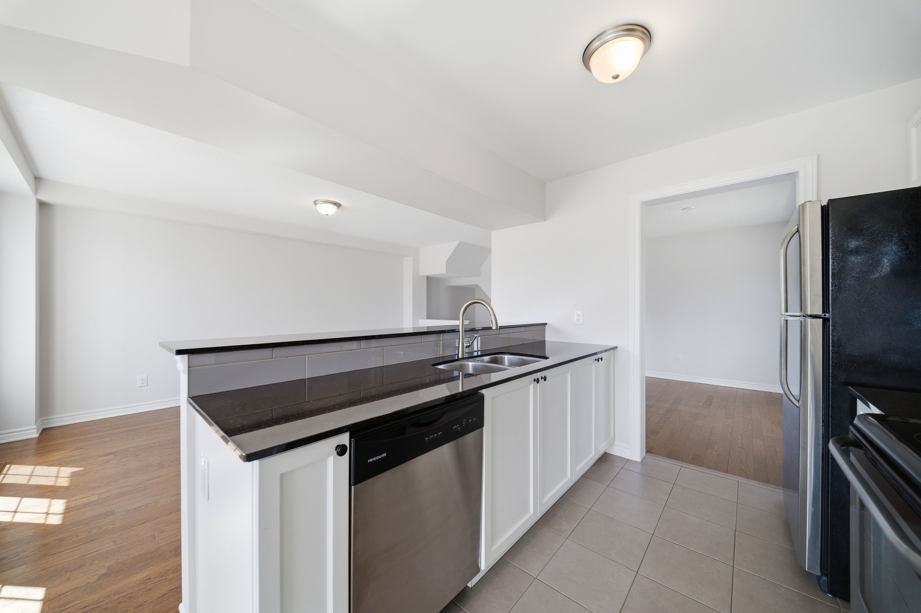 Welcome to 429 rosingdale street, an end-unit freehold townhouse set apart by its position at the very end of the street with a private side yard you simply do not get with the rest of the row. Step inside to a tiled foyer with interior access from the attached garage, leading to a dedicated laundry room with a window and front-load washer and dryer, plus a utility room that keeps everyday living organized. The main level is finished with rich dark hardwood and an open-concept layout that brings the living room, dining area, and kitchen together without losing distinct zones for each. The kitchen anchors the floor with white shaker cabinetry, dark granite counters, a grey subway tile backsplash, stainless appliances, and a peninsula breakfast bar that doubles as a casual eat-in spot, while the dining area sits bright and open under a chandelier with room for a full table. Patio doors off the living room lead to a private wood-deck balcony with white railings, the perfect place for morning coffee or weeknight grilling. A powder room on this level keeps things practical for guests. Upstairs, the primary suite features a walk-in closet and a private ensuite with a double-sink vanity, a setup you rarely see in a townhouse. A second well-sized bedroom and a full bathroom with a soaker tub round out the level. Outside, the end-of-street location, side yard, attached garage, and private driveway give you parking and elbow room you would expect in a much larger property. Steps from parks, walking trails, schools, the community campus, and a shopping plaza with everyday essentials, this is kanata living done right