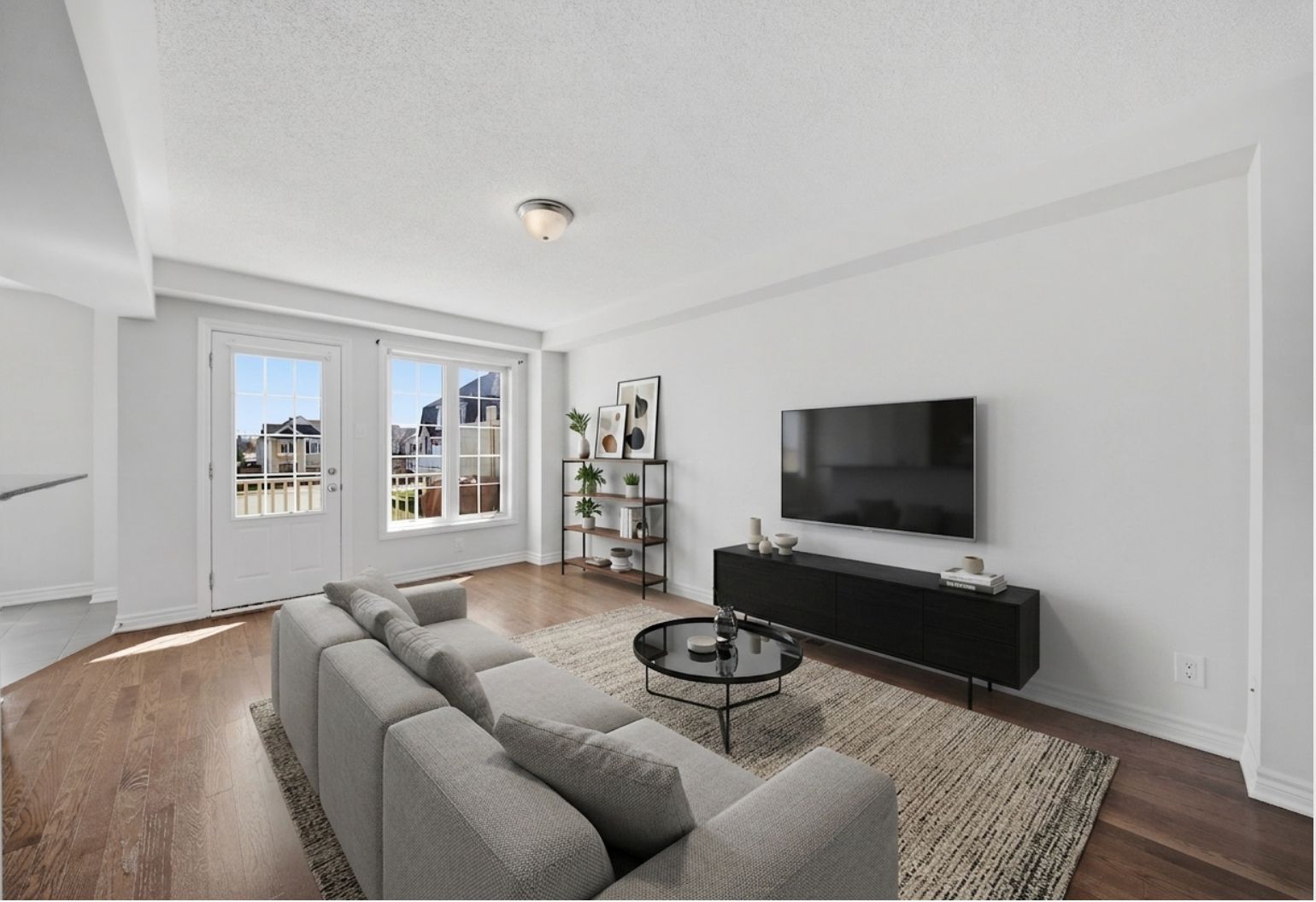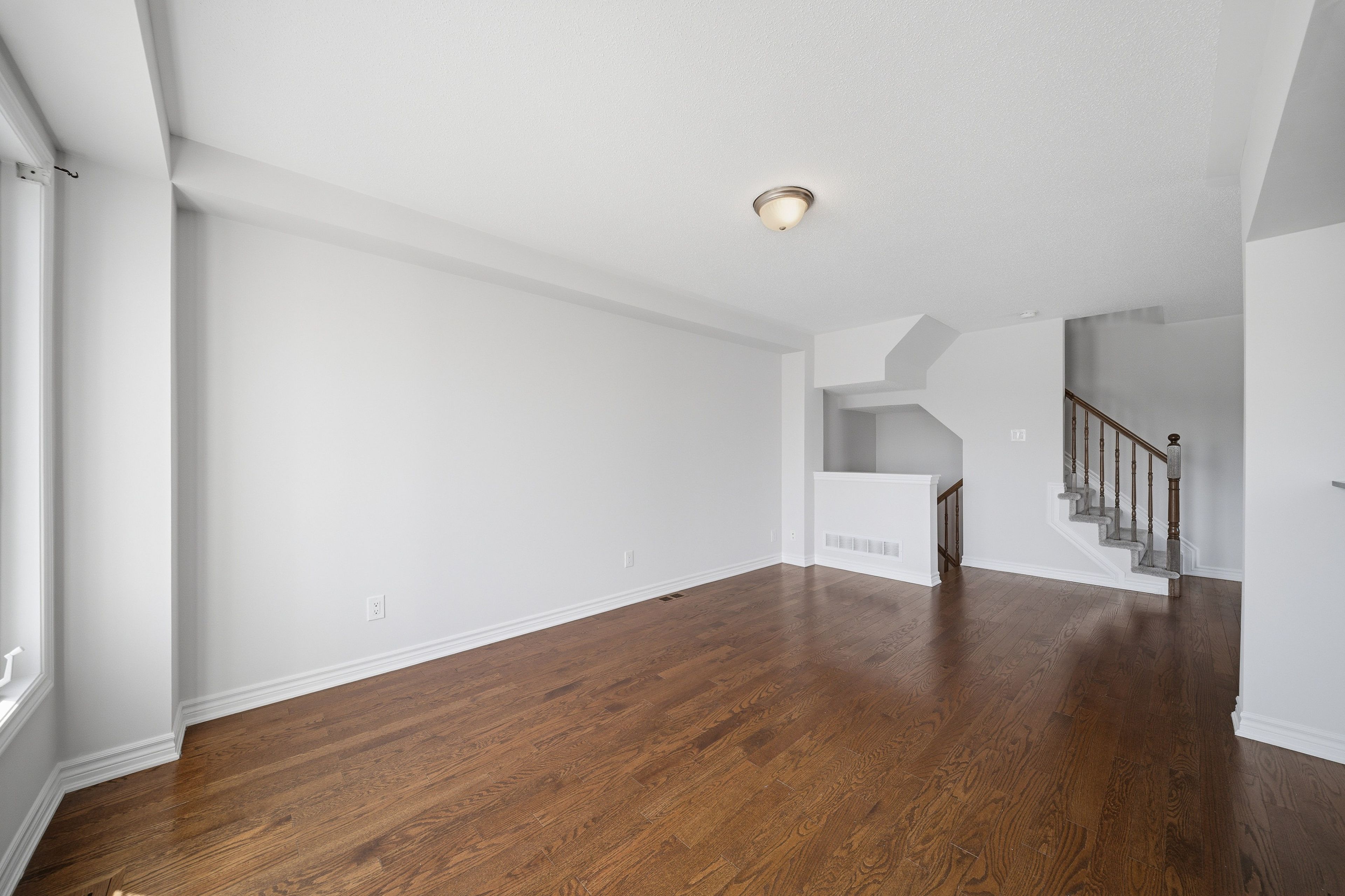 • Spacious open-concept main level with rich dark hardwood flooring.