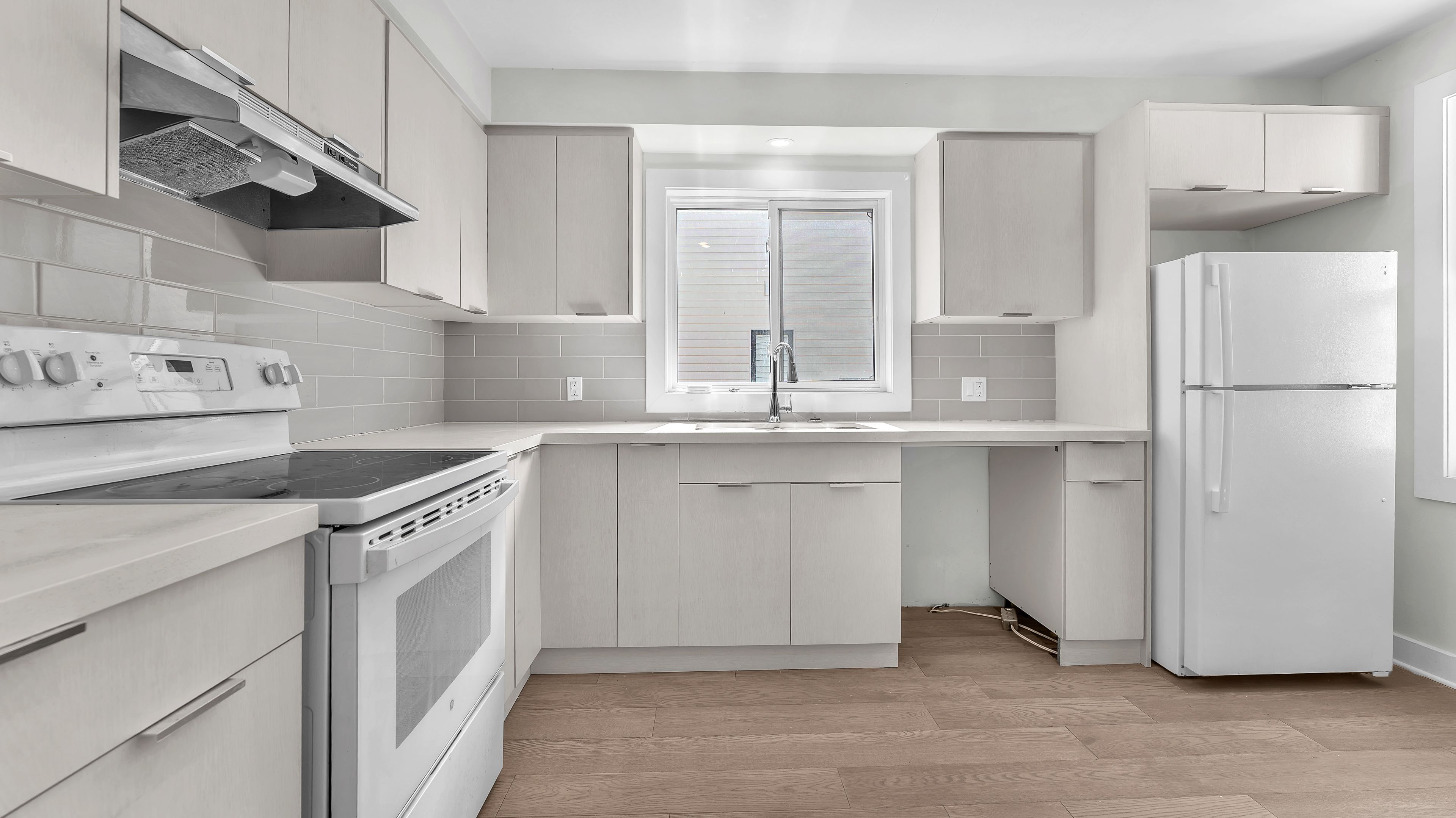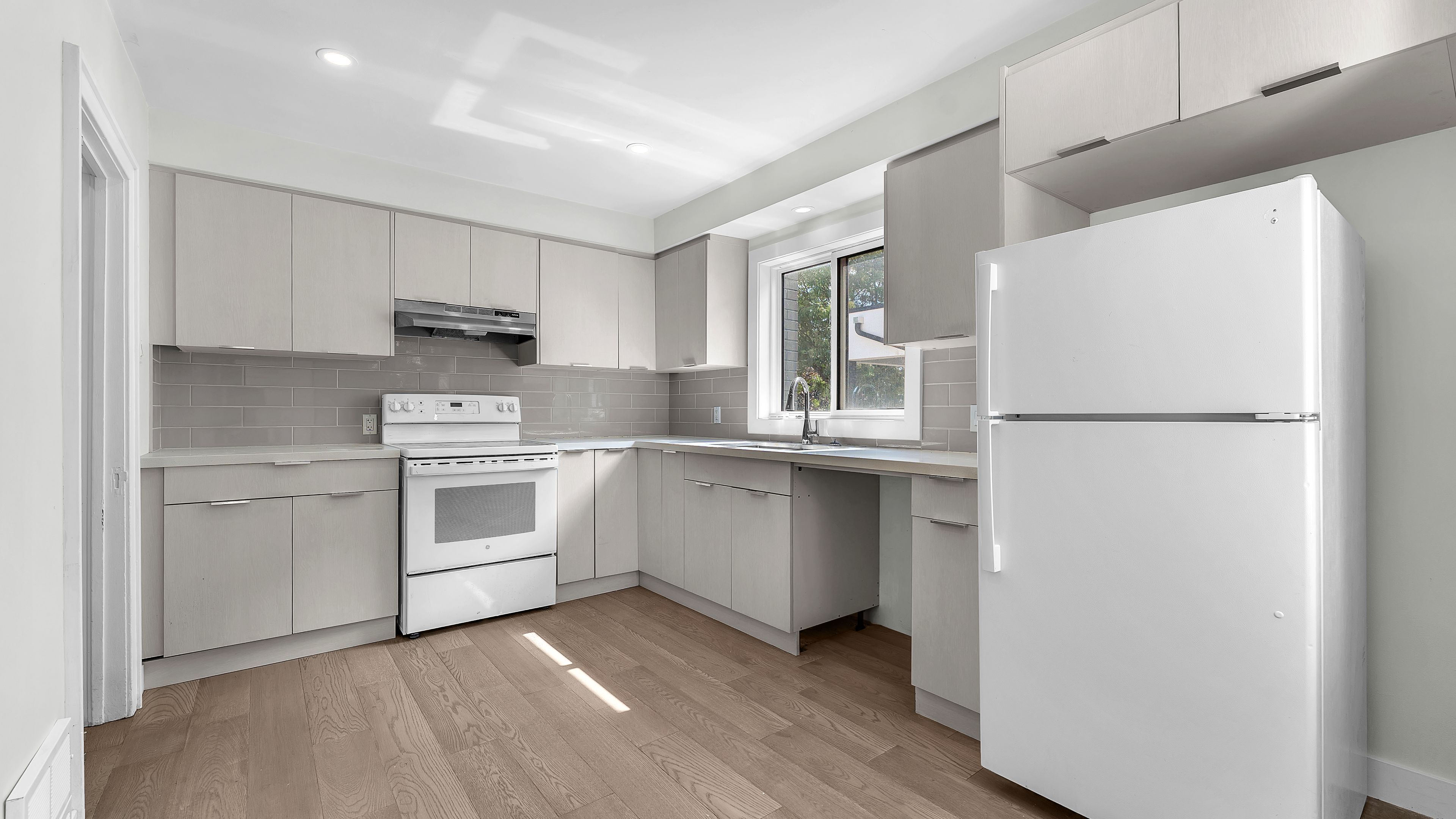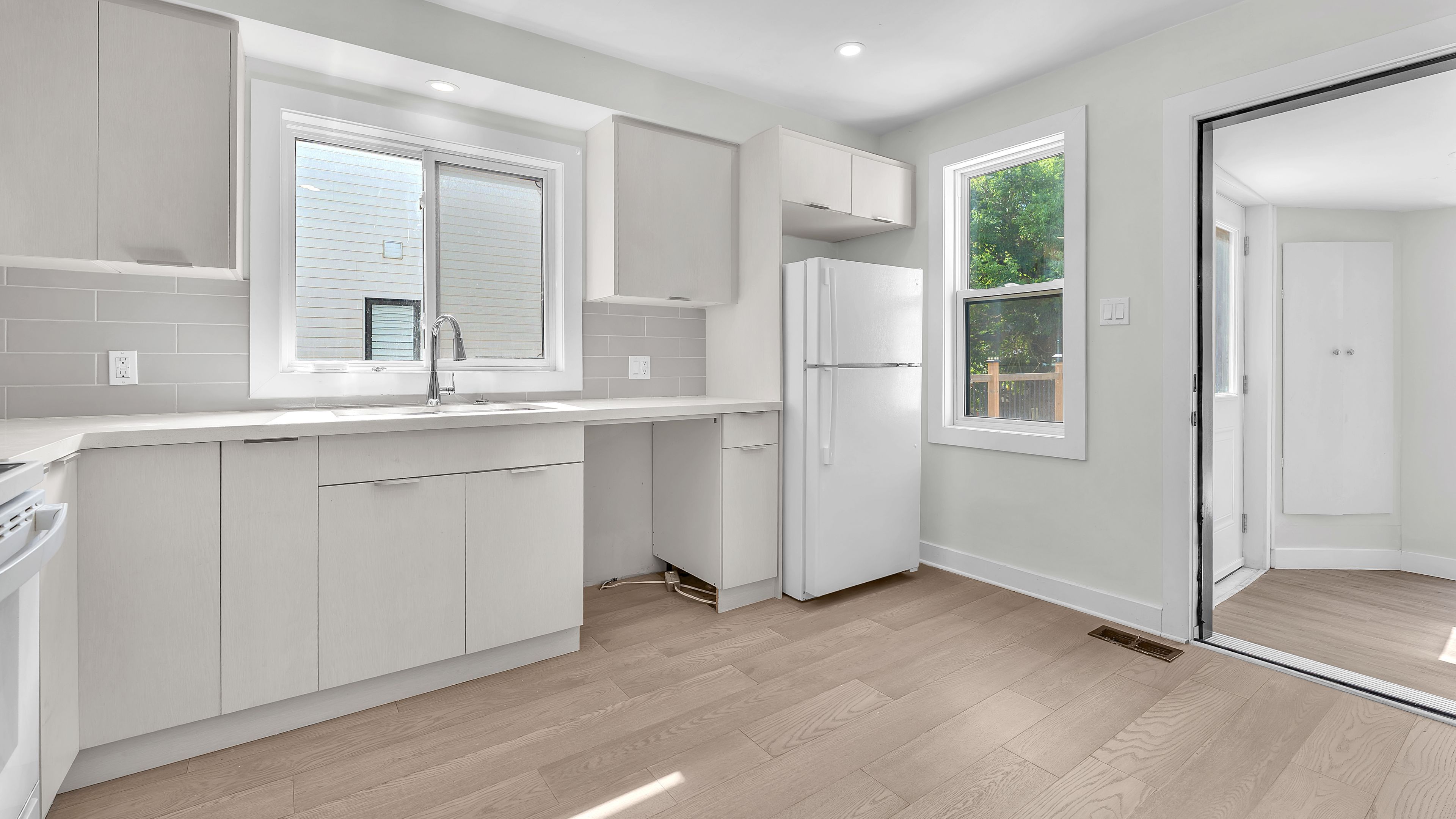 • Modern kitchen and bathrooms with refreshed flooring throughout the home.