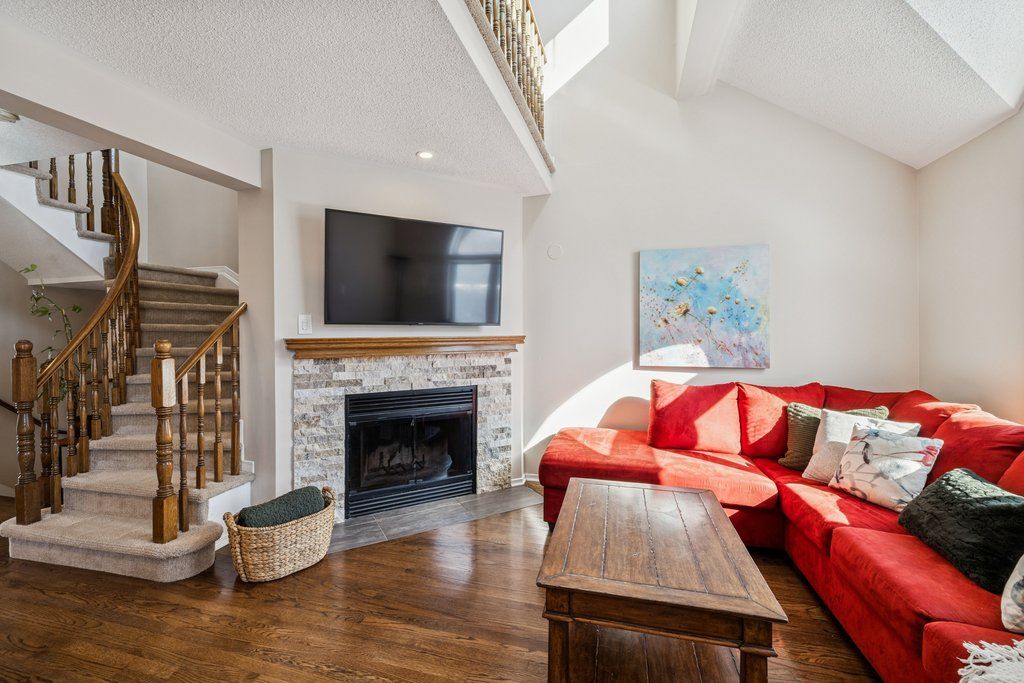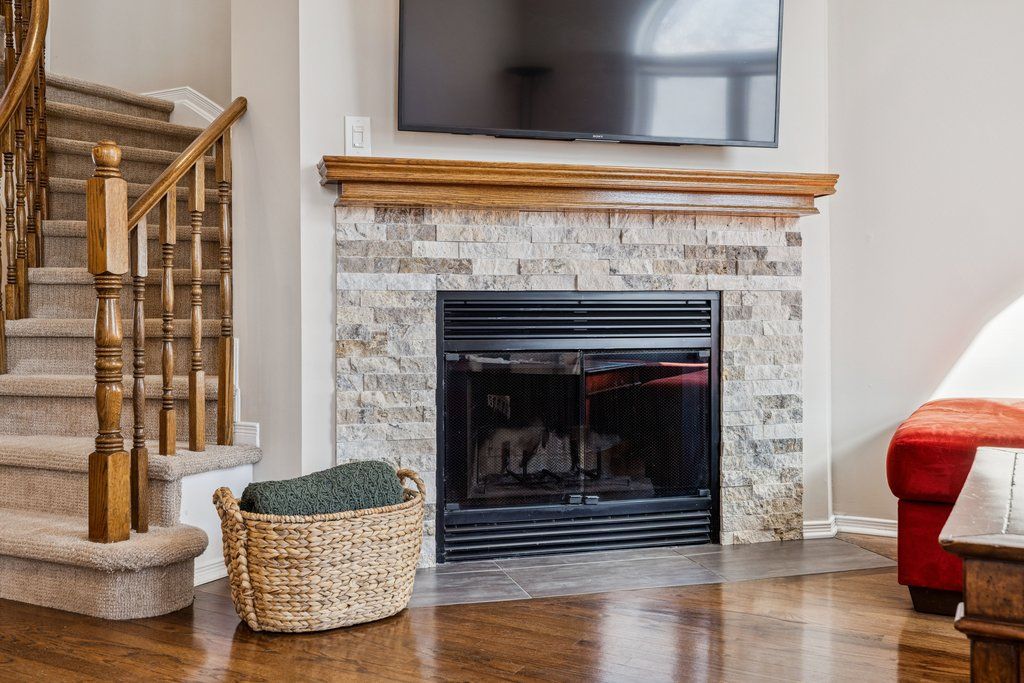 • Cozy living area with a wood-burning fireplace and hardwood floors.