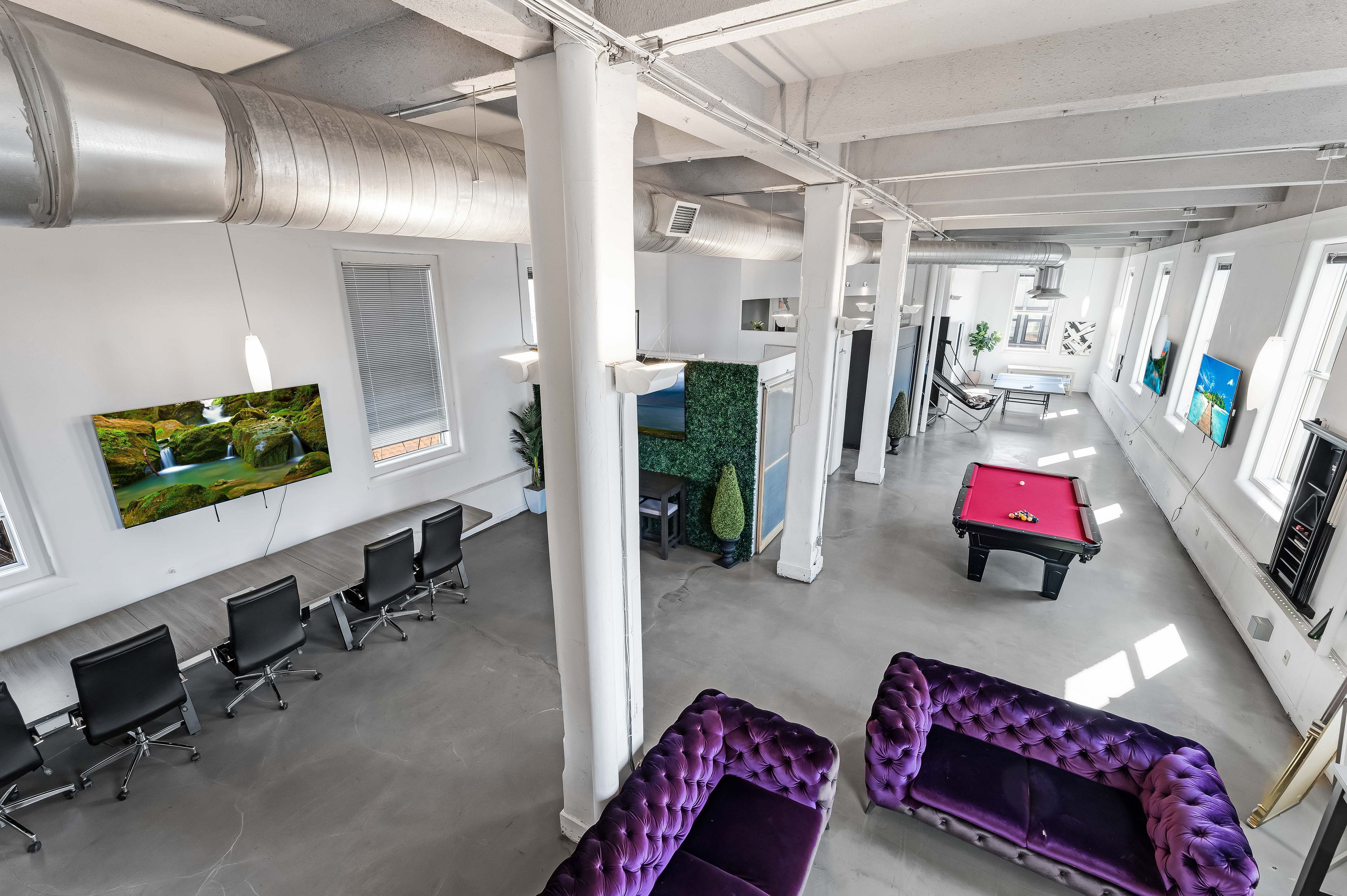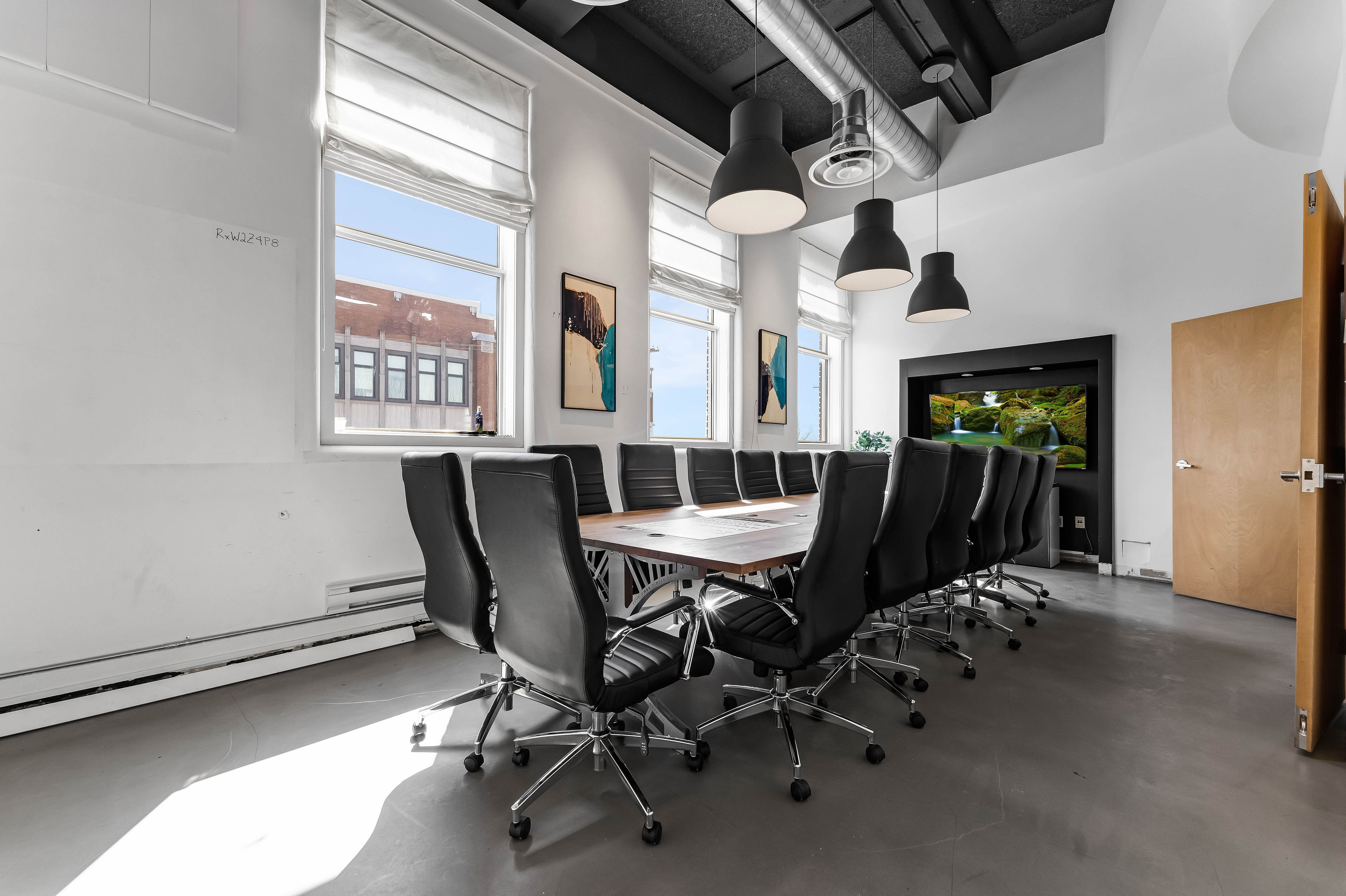 • Modern layout featuring glass partitions, meeting rooms, and a kitchen area.