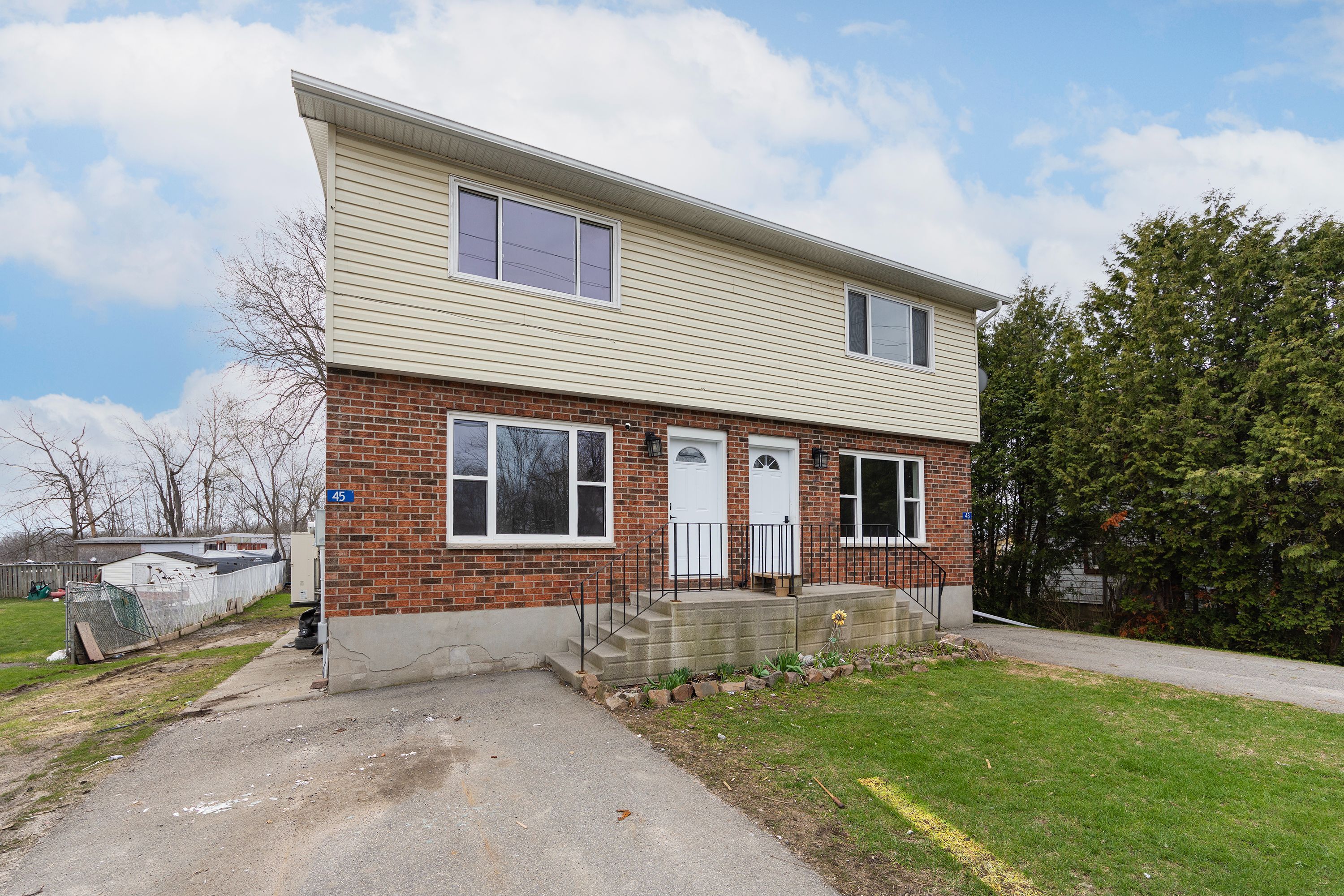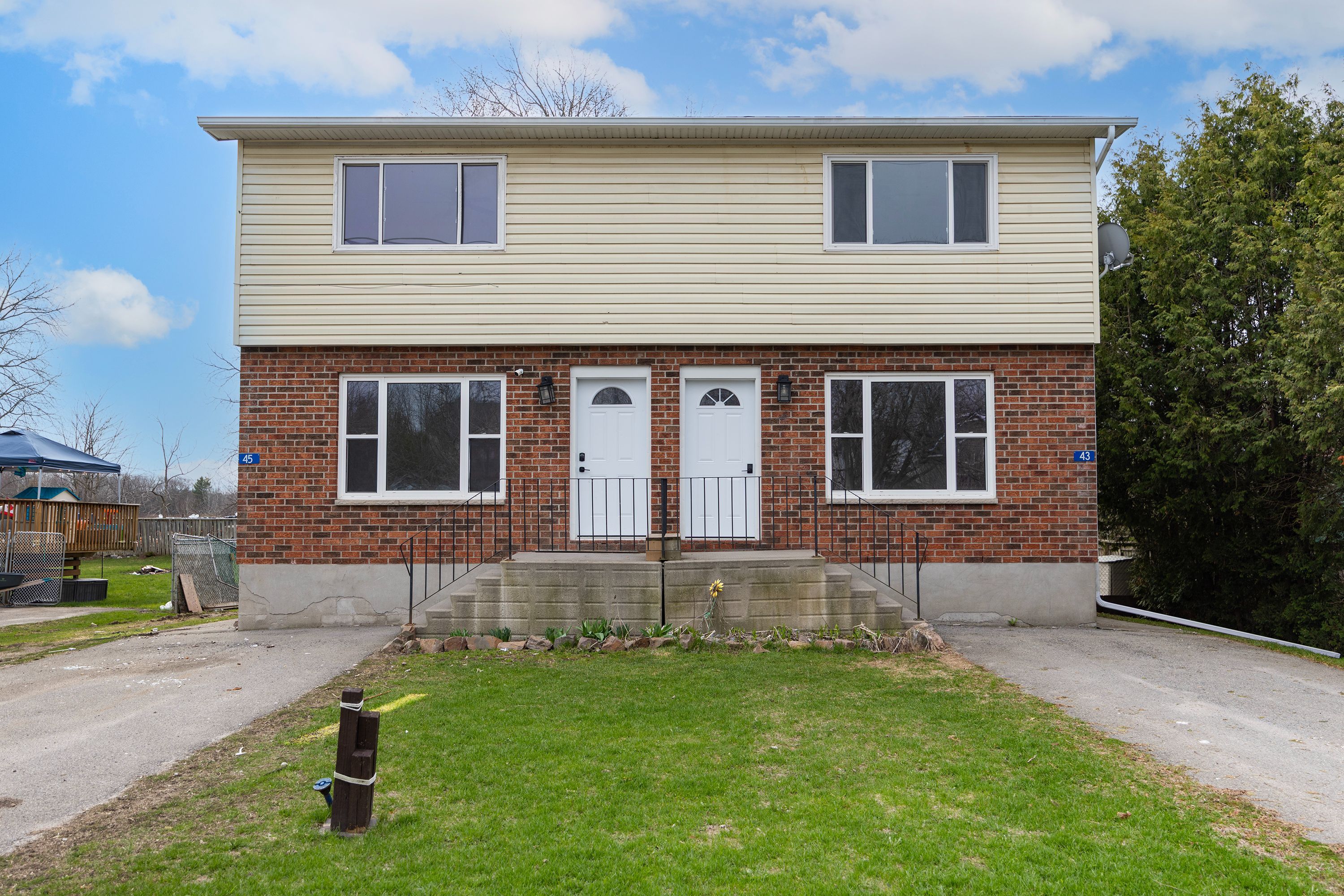Welcome to this purpose-built side by side duplex, located in the village of lansdowne, just north of highway 401. This is a great opportunity for investors or buyers looking to live in one unit and earn income from the other. Also a great way to qualify for a mortgage using rental income. Each unit offers a two storey layout with a full basement and sits on a generous lot. Both units feature a main floor bathroom and a full 4 piece bathroom upstairs, providing comfort and convenience for tenants or owners. Unit 43 is turn key and move in ready, while unit 45 has been freshly painted and is ready for your final touches, with potential for flooring and kitchen updates to increase value and rent. Each unit is equipped with a cold climate air source heat pump, providing efficient heating and cooling year round. The basements include laundry hookups, adding to the functionality of each unit. Outside, you will find back decks, fenced yard areas, and front parking for both units. The property also features separate heat, hydro, and water and sewer services, making it easy to manage and keep operating costs predictable. Whether you choose to live in one unit and rent the other, or rent both units for positive cash flow, this property offers strong investment potential with reliable rental income. Located just minutes from the thousand islands, international bridge, and charleston lake, this area is attractive to professionals, families, or retirees looking for lifestyle and convenience. This is a rare opportunity to own a solid income property in a stable area.