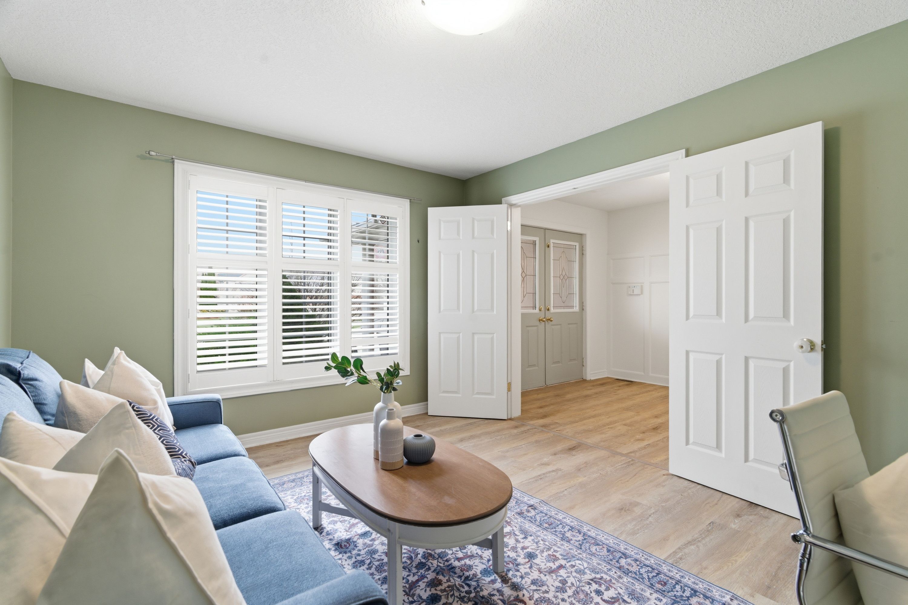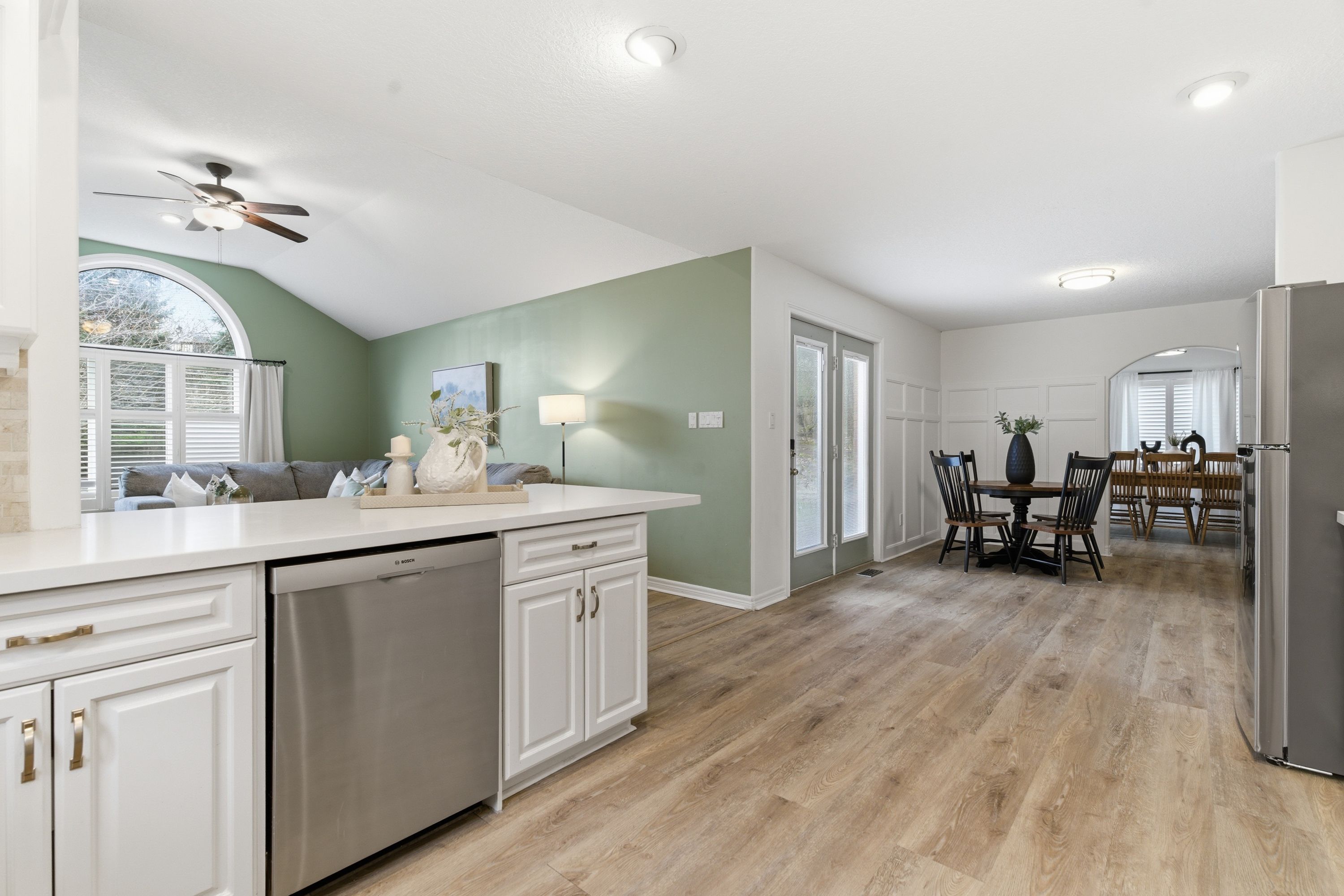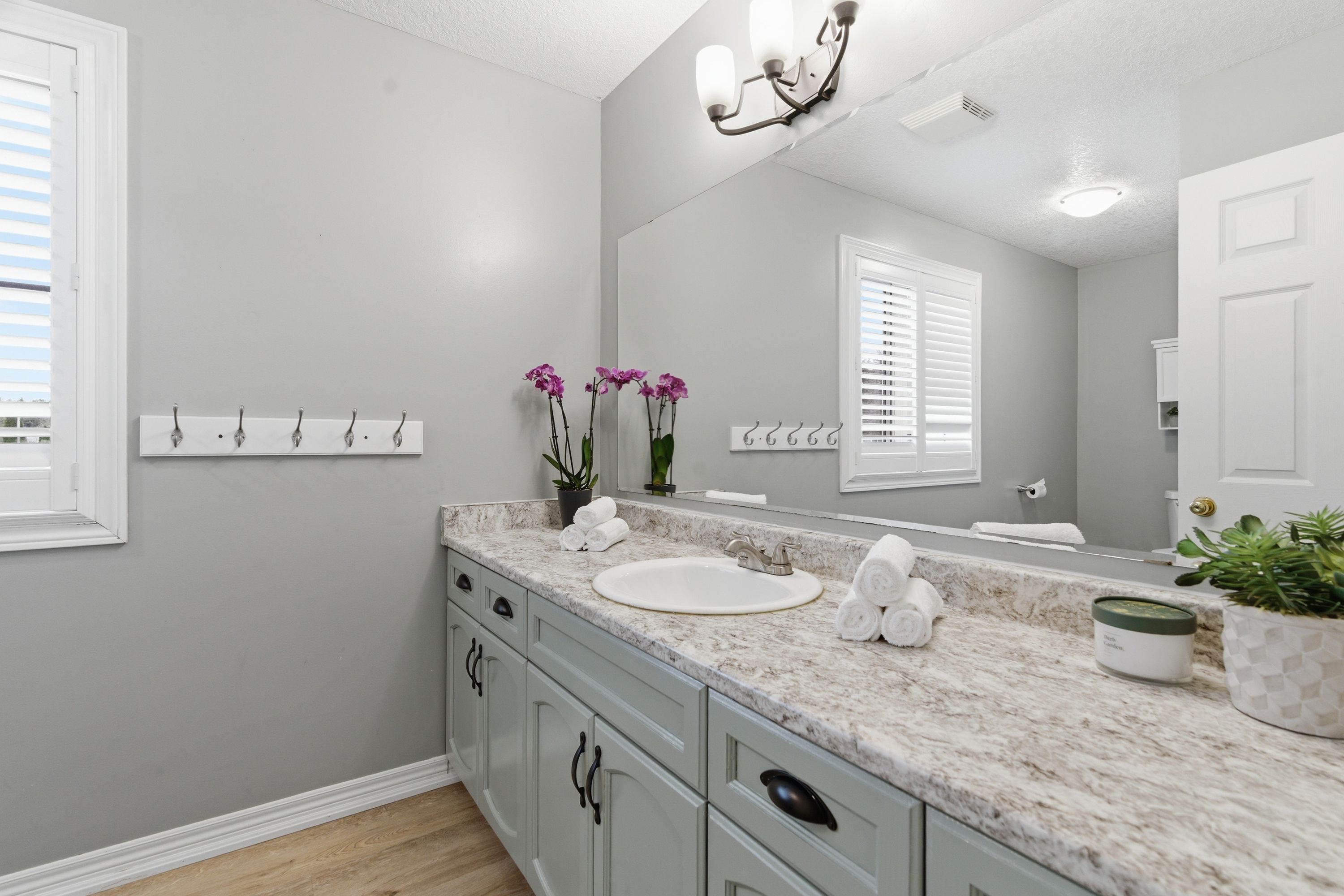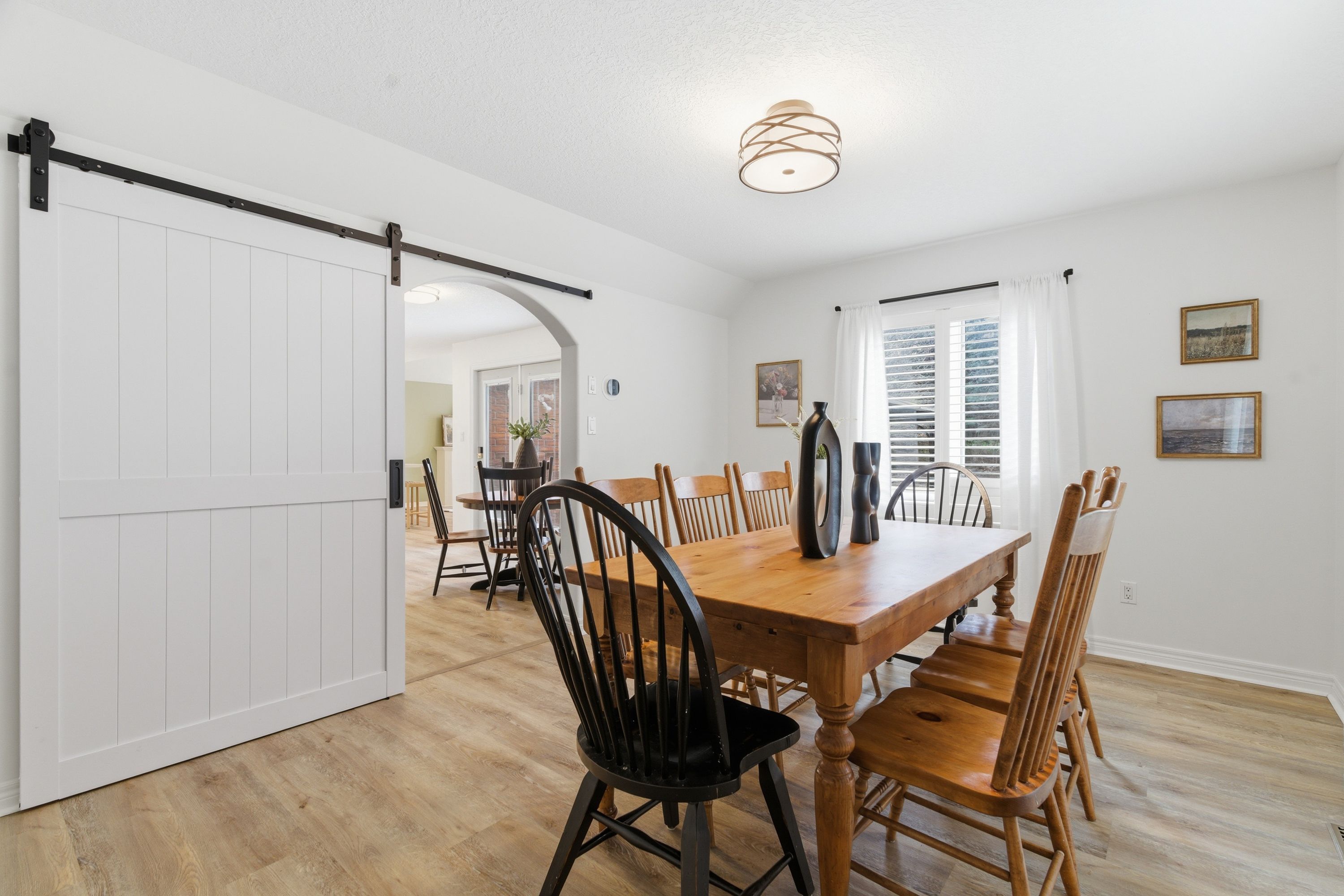 • Open-concept main level with updated flooring and stylish California shutters.