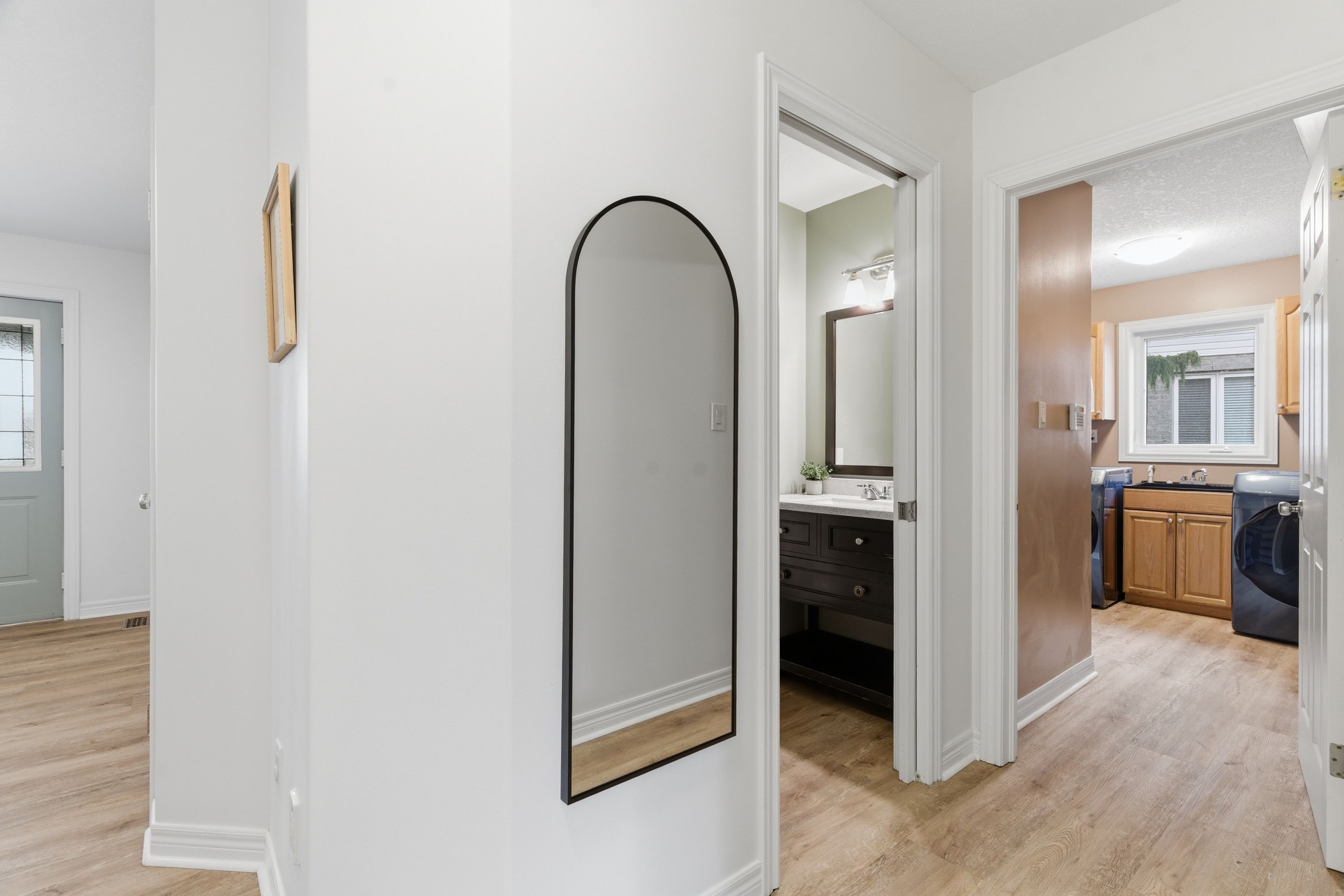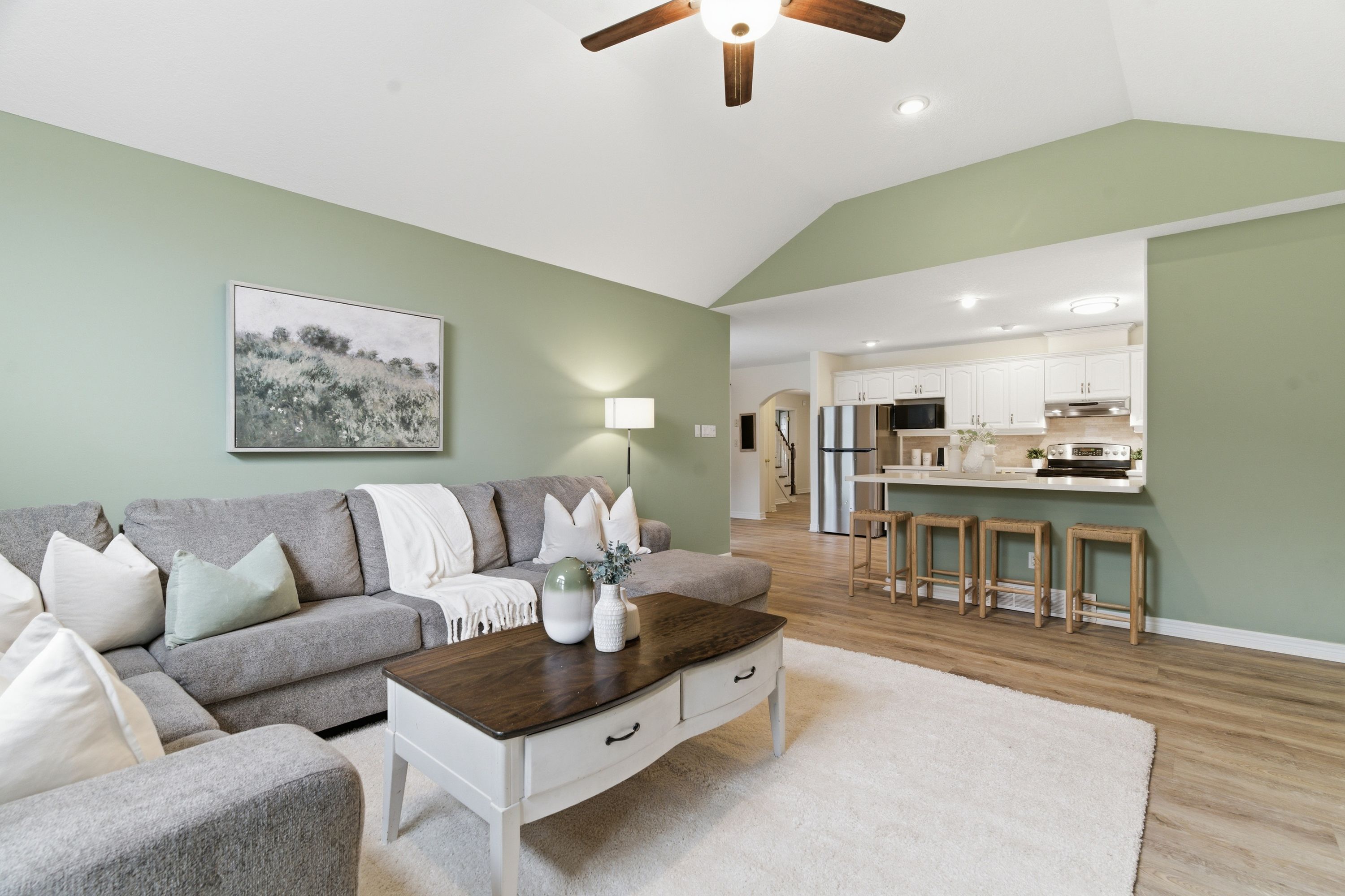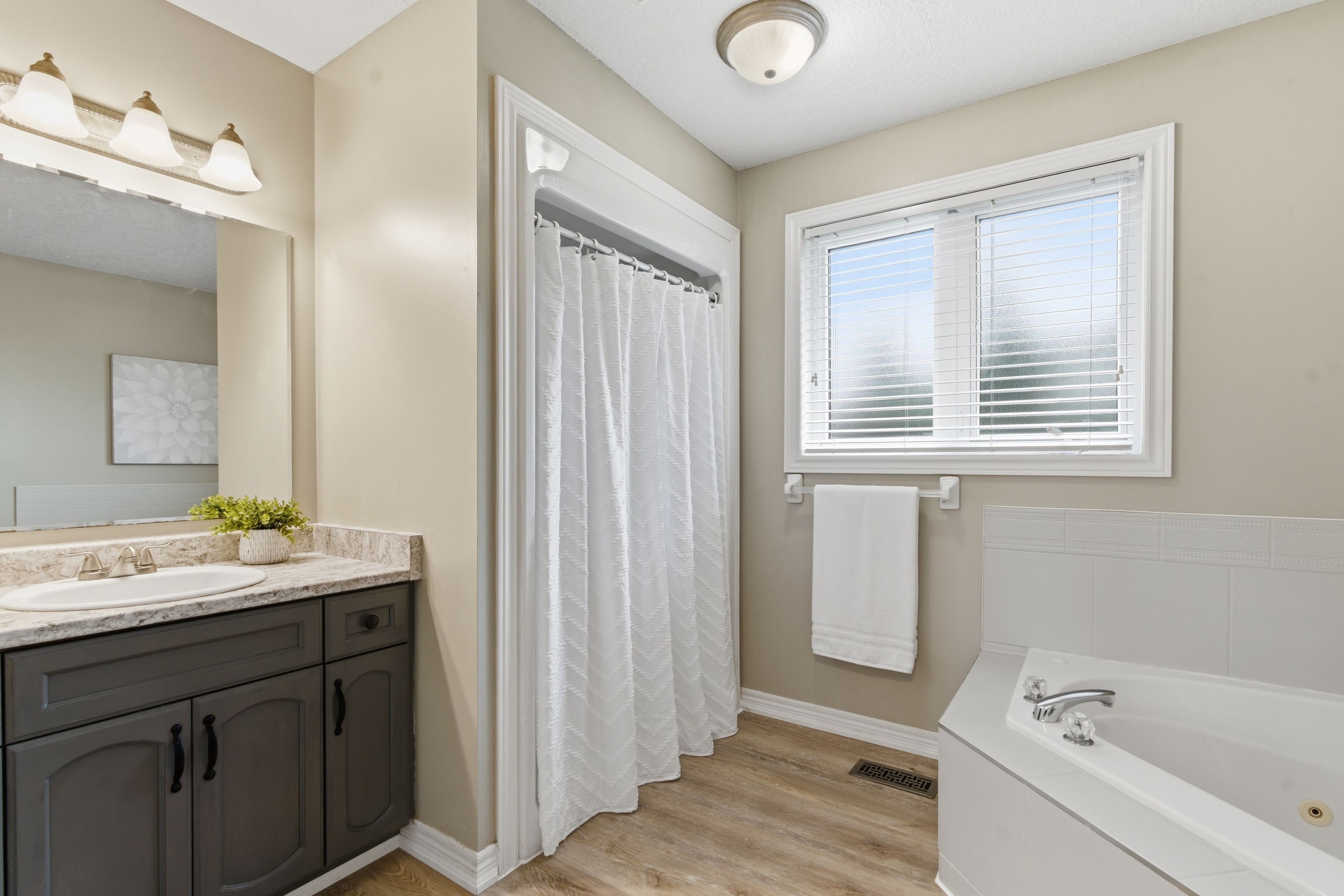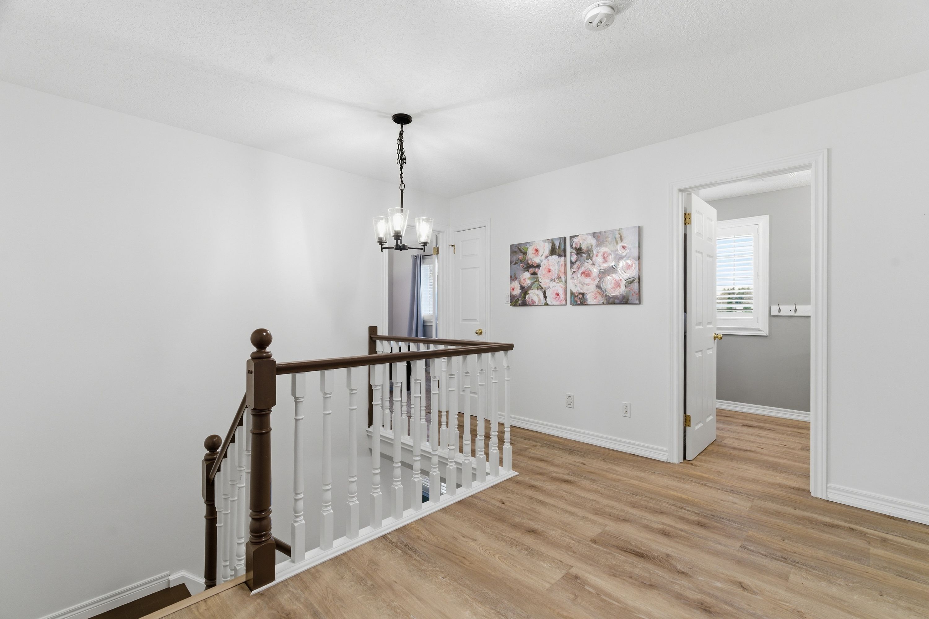 • Open-concept main level with updated flooring and stylish California shutters.