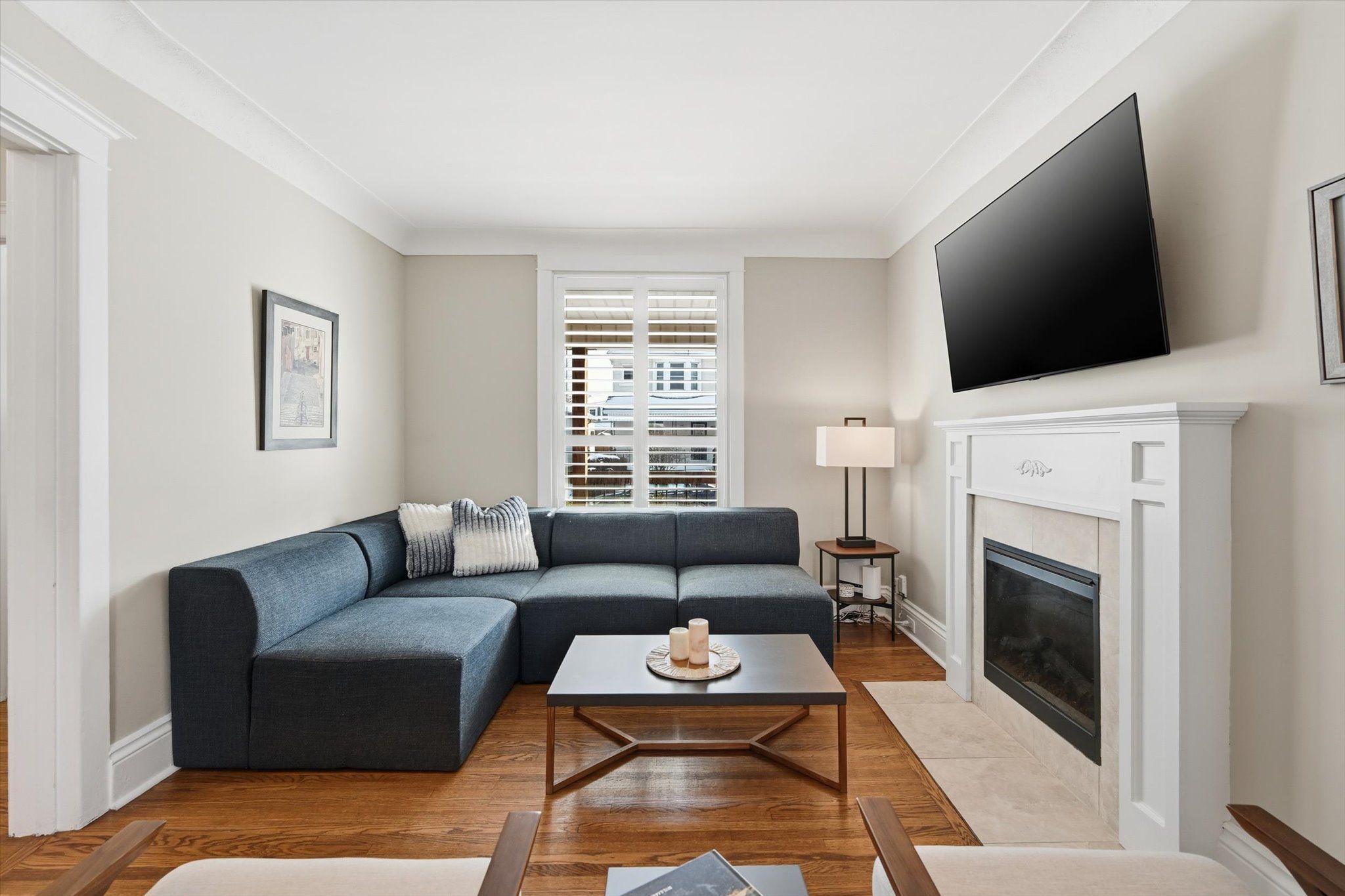 • Bright living and dining area with refinished hardwood floors and electric fireplace.