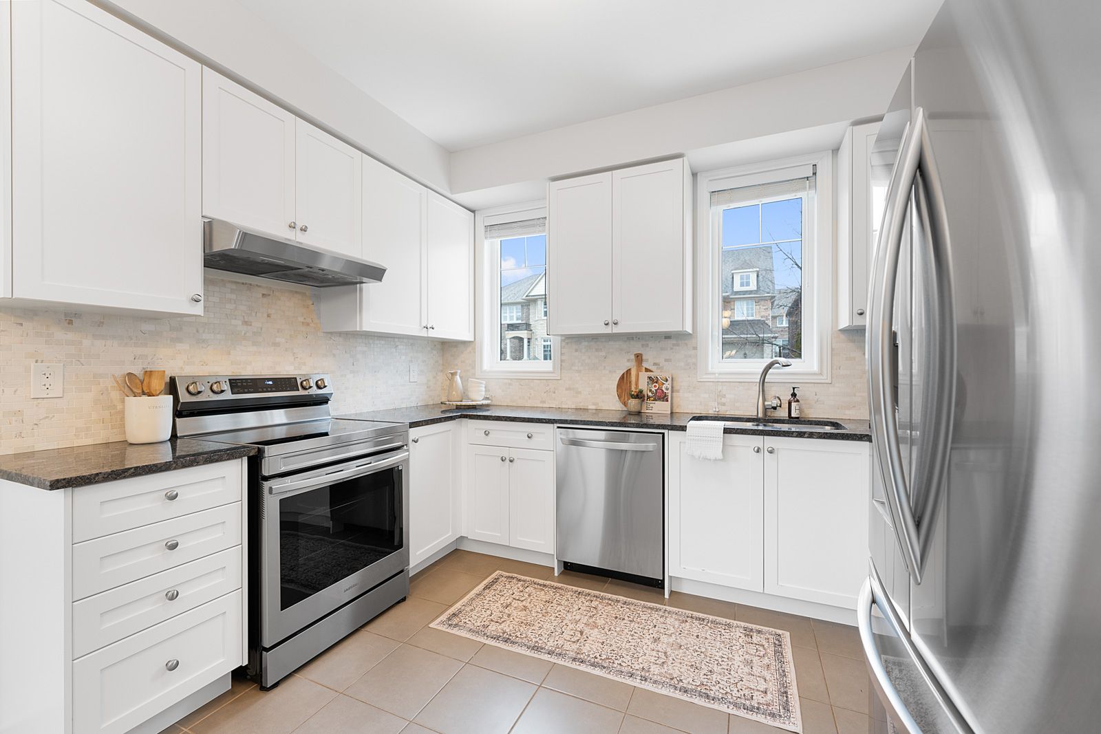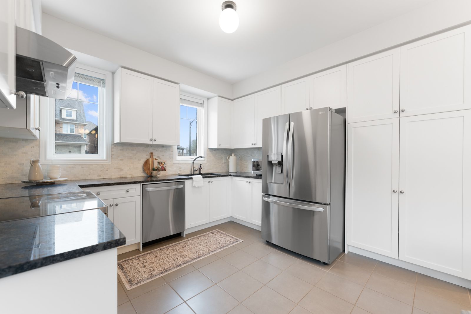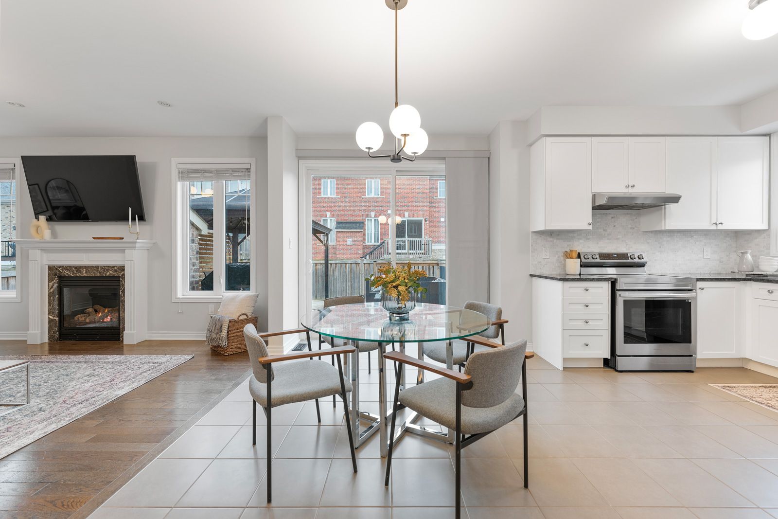 • Modern kitchen with stainless steel appliances and spacious family room.