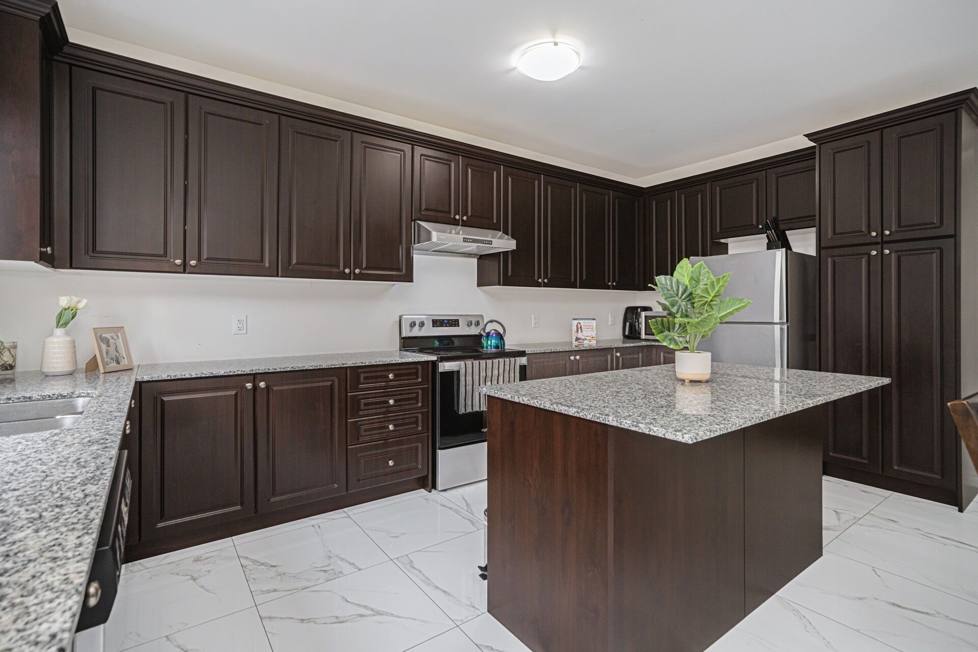 • Gourmet kitchen designed for both cooking and entertaining, featuring granite countertops.