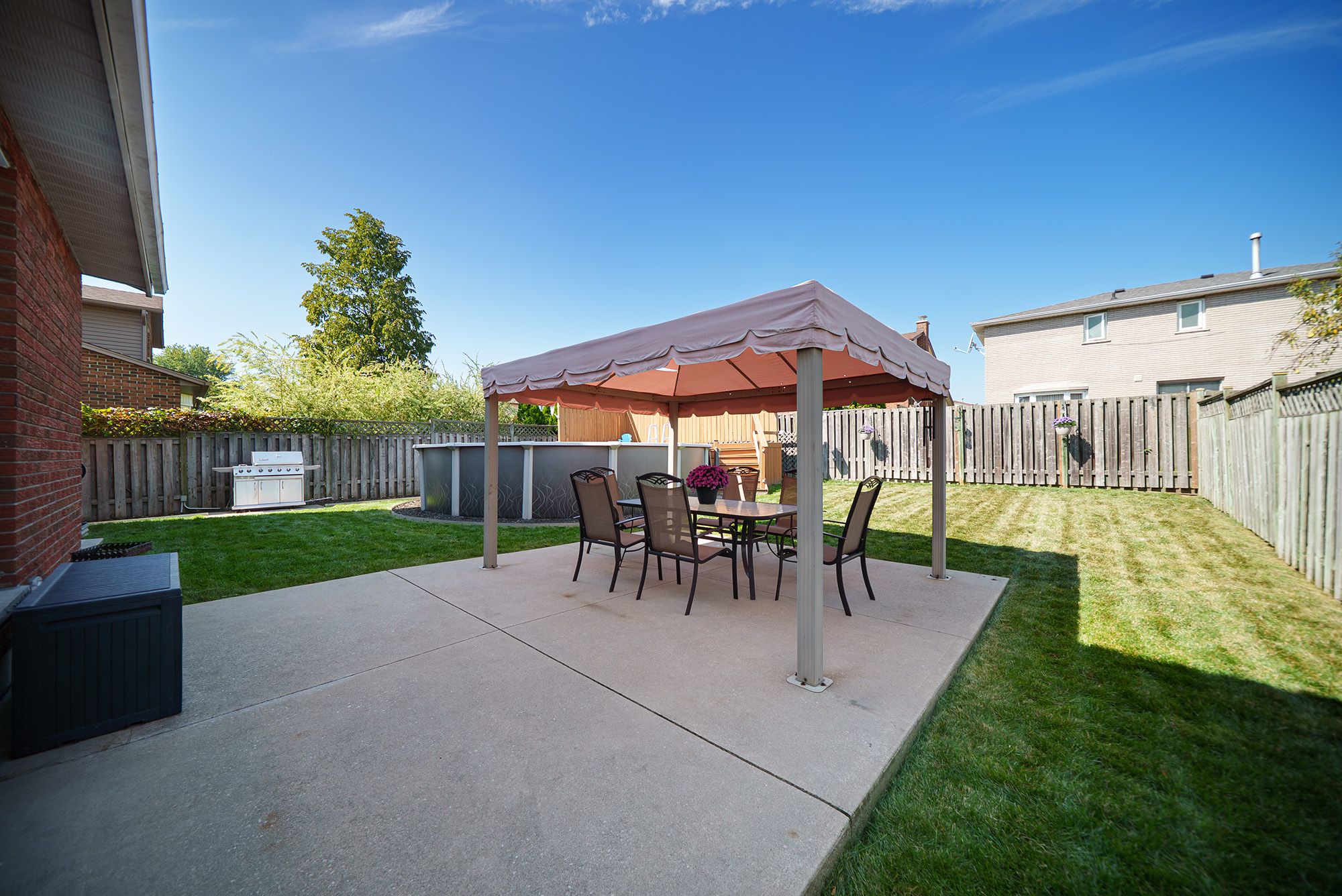 • Backyard features a pool and patio, perfect for relaxation and entertaining.
