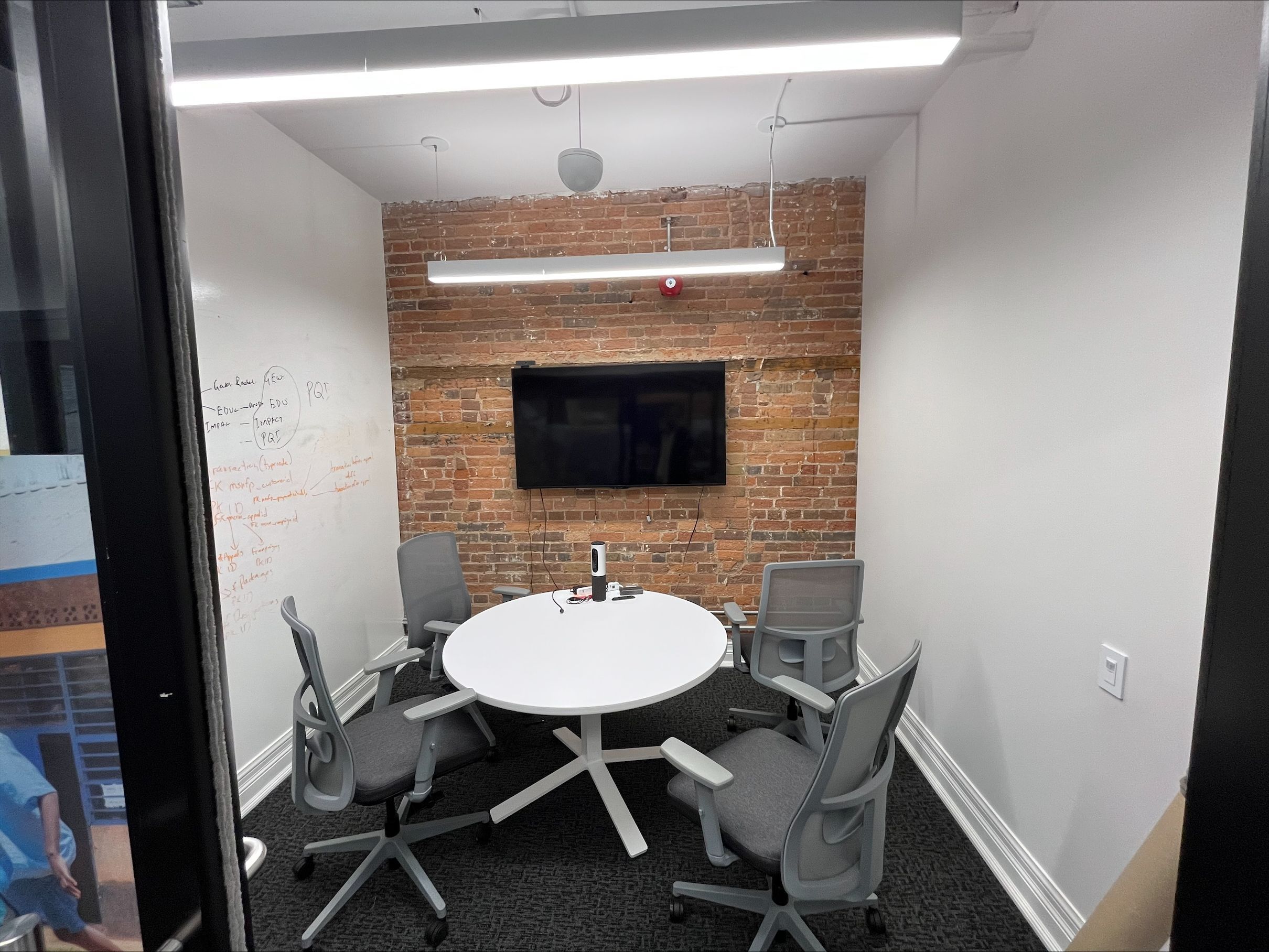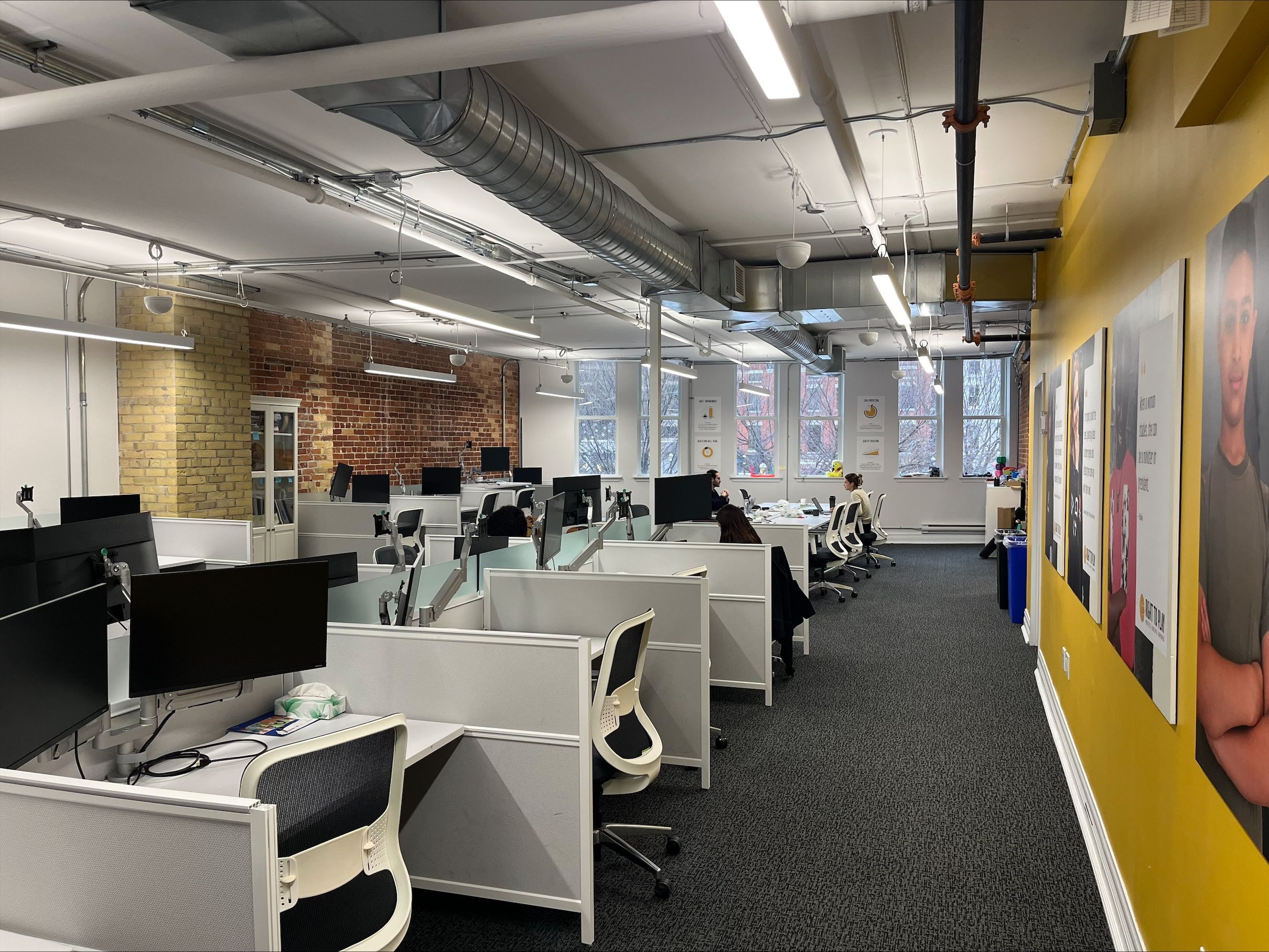 • Exposed brick and high ceilings create an inviting work environment.