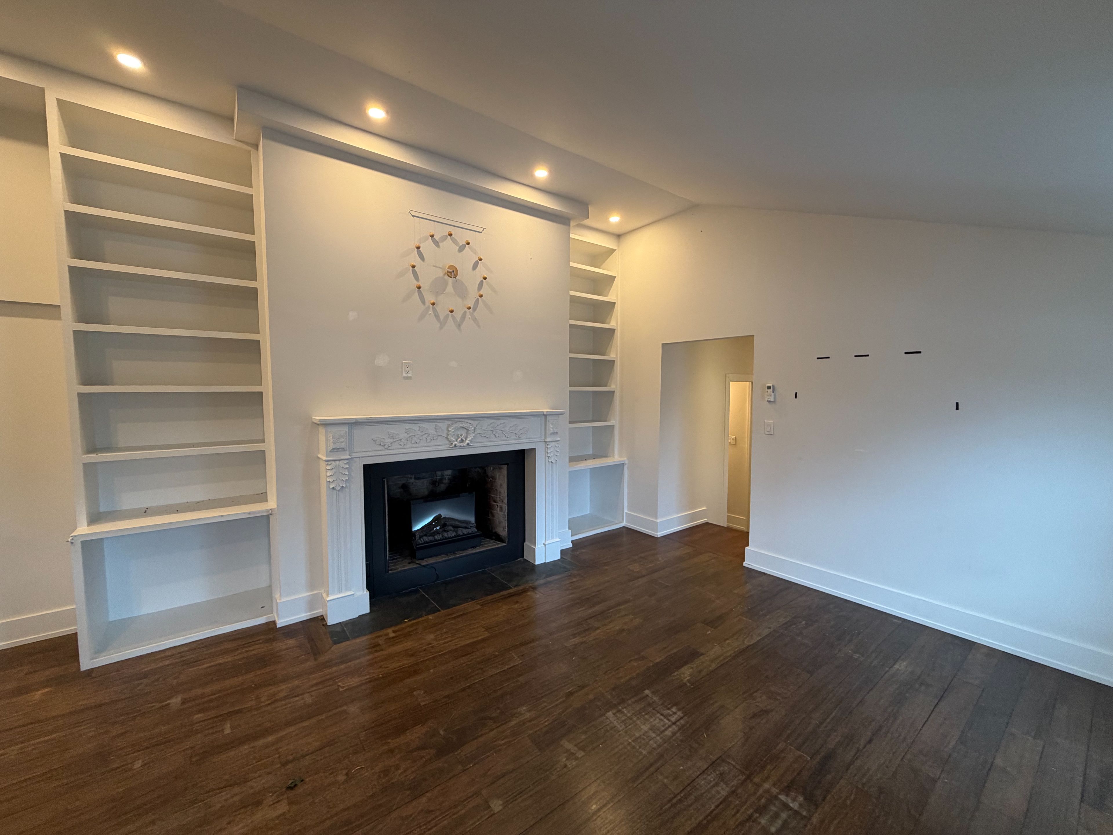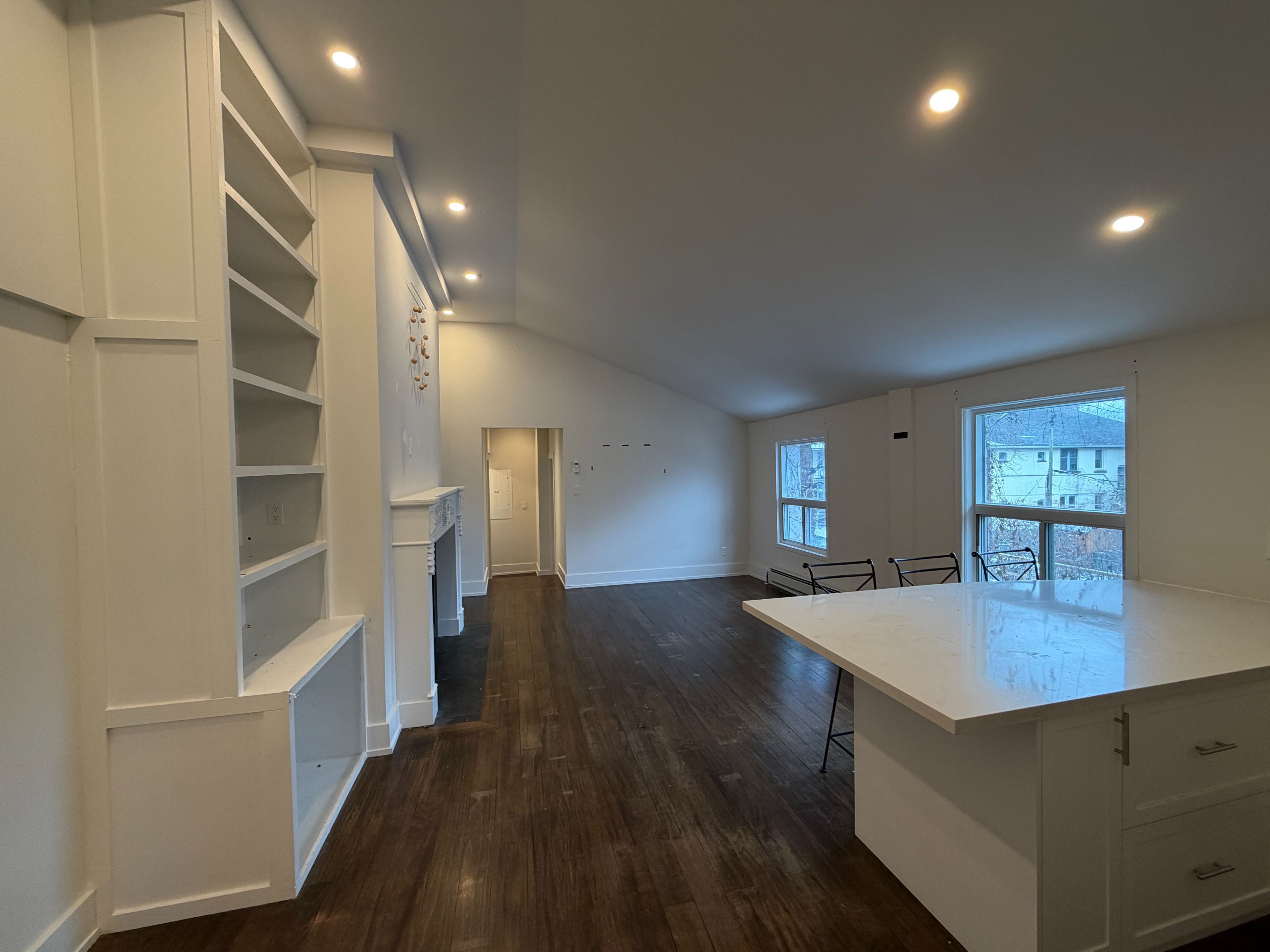 • Spacious open concept living room with vaulted ceilings and a decorative fireplace.