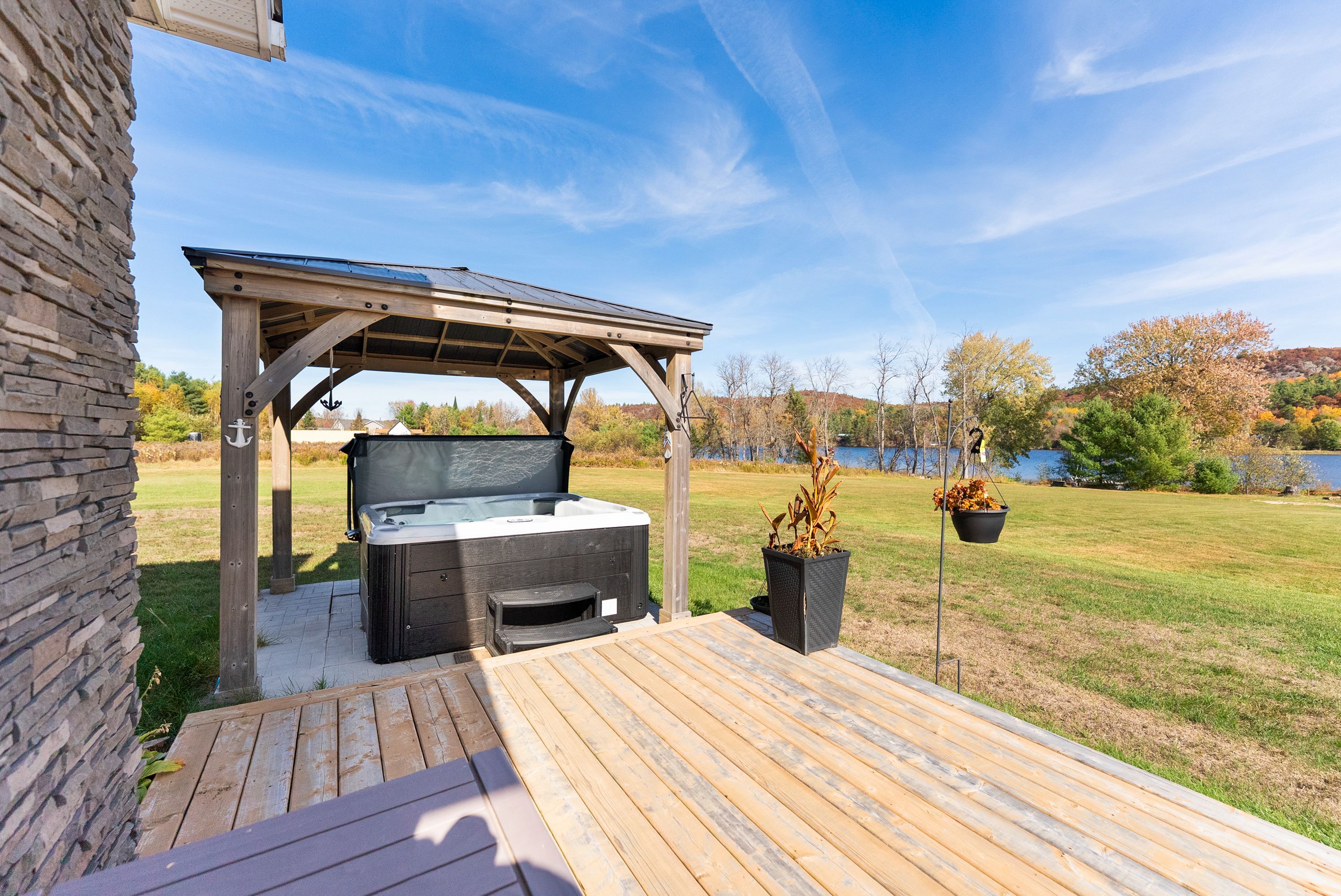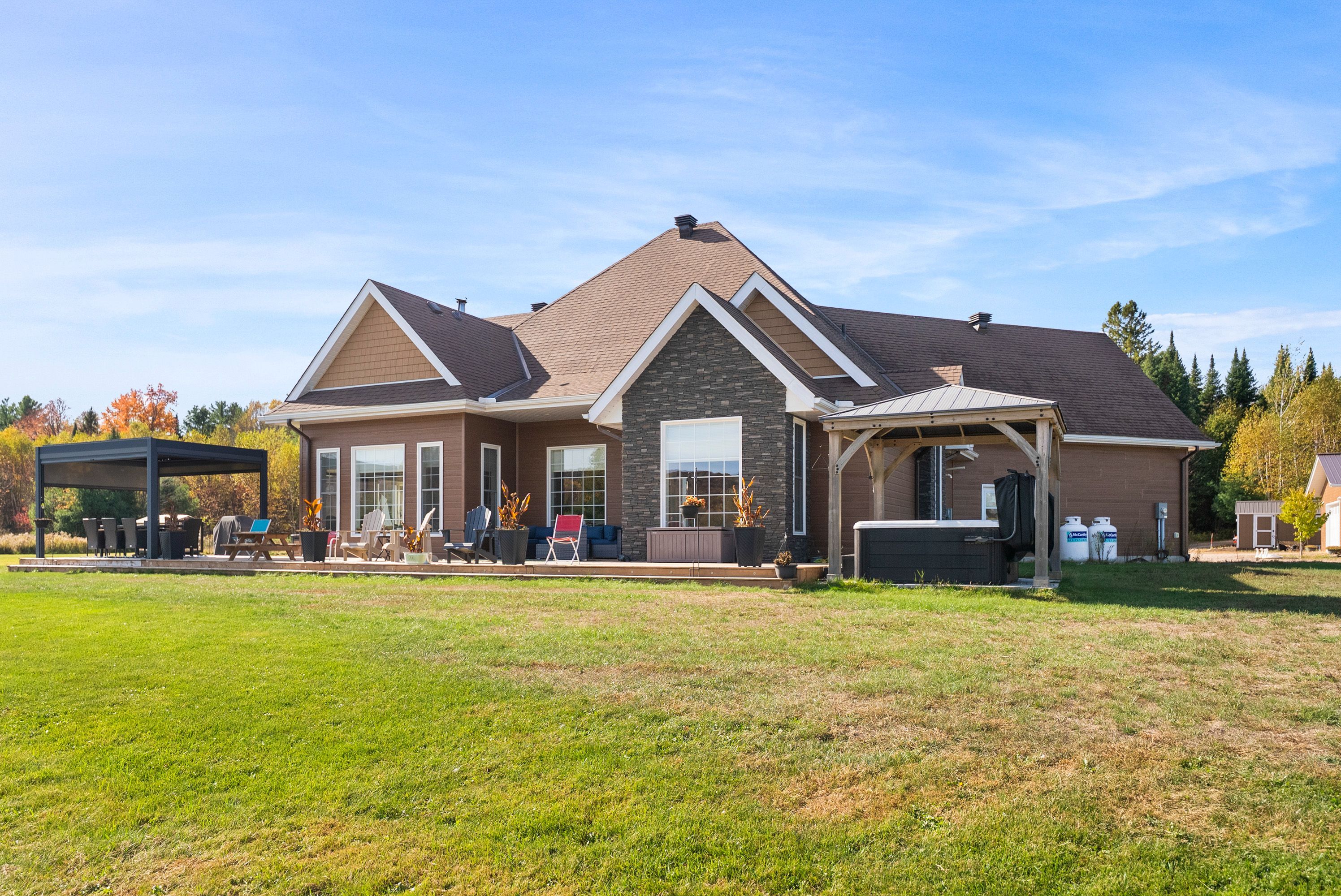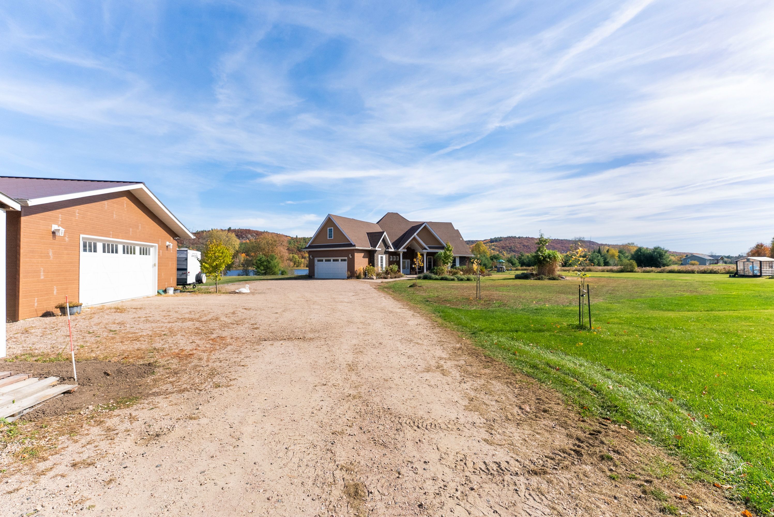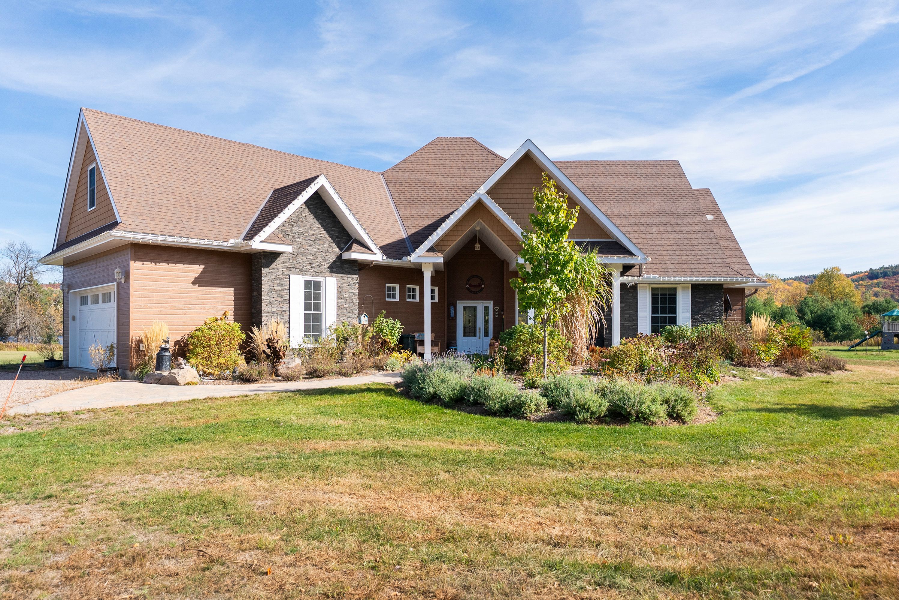 Nestled on 5. 9 acres overlooking majestic hills and natural rock face, this exceptional property offers an unmatched blend of luxury, functionality, and tranquility. The beautifully crafted custom home features fine trim and crown mouldings, in-floor heating, forced air, and ac for year-round comfort. The primary suite is a private retreat with a custom walk-in closet, soaker tub, and a spa-inspired shower complete with dual rainfall shower heads. The breathtaking designer kitchen is the true heart of the home, featuring a grand centre island, high-end appliances including a countertop stove, dual wall ovens, microwave, dishwasher, and a built-in bar fridge. Thoughtfully designed for both function and style, it's a chef's dream and the perfect gathering space for family and friends. The front deck overlooks the water, while the covered hot tub and screened metal pergola with a louvered roof invite you to relax outdoors in any season. Entertain effortlessly with a designated bbq area and two outdoor fire pits surrounded by nature. The property's exterior is finished with durable cannexel siding and includes a 30' x 30' detached insulated garage (heated, 200 amp service, and trailer hook-up), plus a super shed for extra storage. The attached garage(24' x 24")boasts a heated loft area room that has multi uses from a craft room, exercise room or studio or a fantastic home office. For gardeners, there's a greenhouse, irrigated gardens, sprinkler system drawing from the river via a submersible pump, and professional perennial gardens and landscaping. Practical features include a generac generator powering the entire home, 200 amp house service, and water treatment system ensuring quality and peace of mind. This property exudes simple elegance and refined country style, a home built for those who value craftsmanship, privacy and a true sense of community. 24 hour irrevocable on all offers.