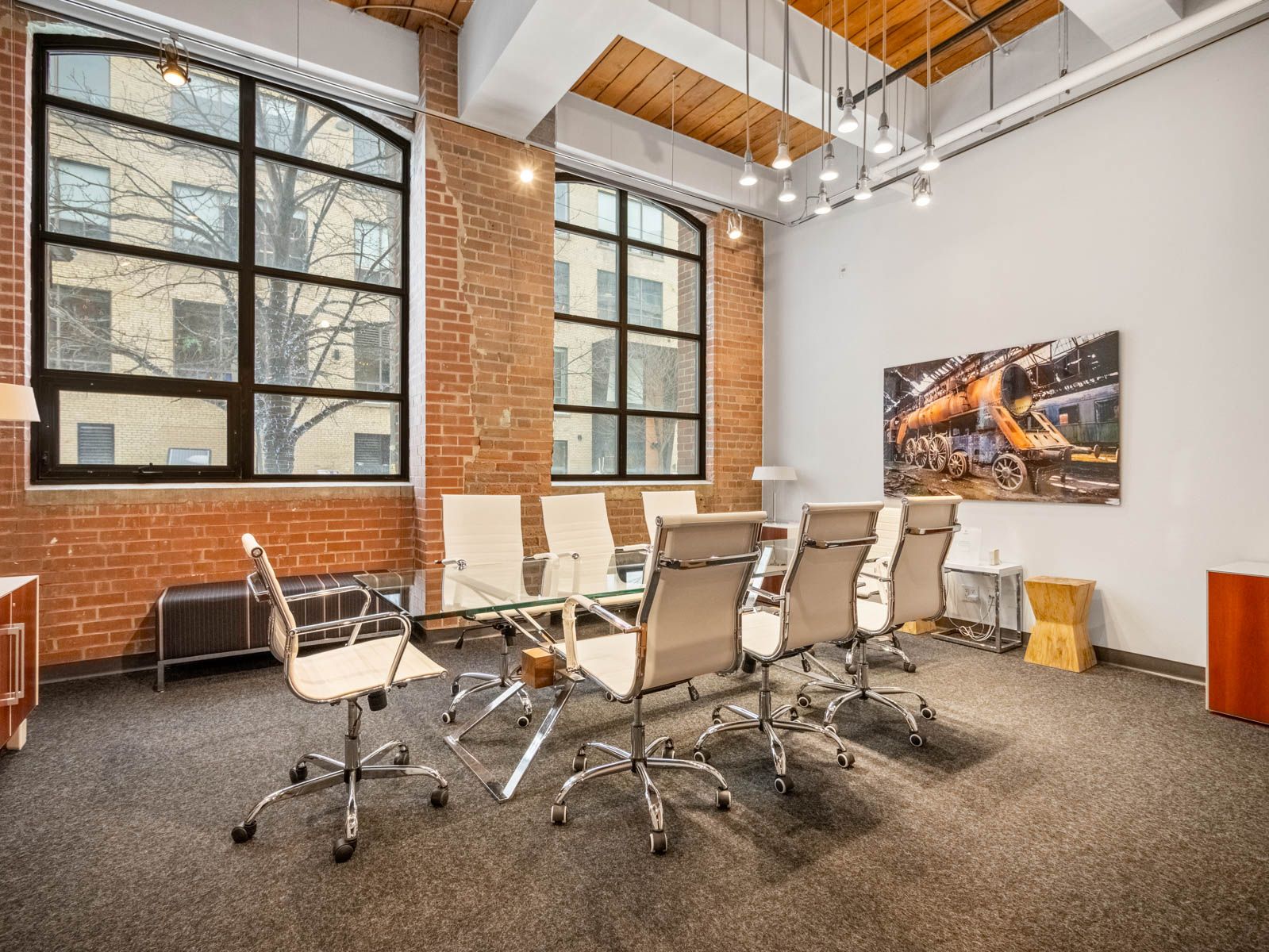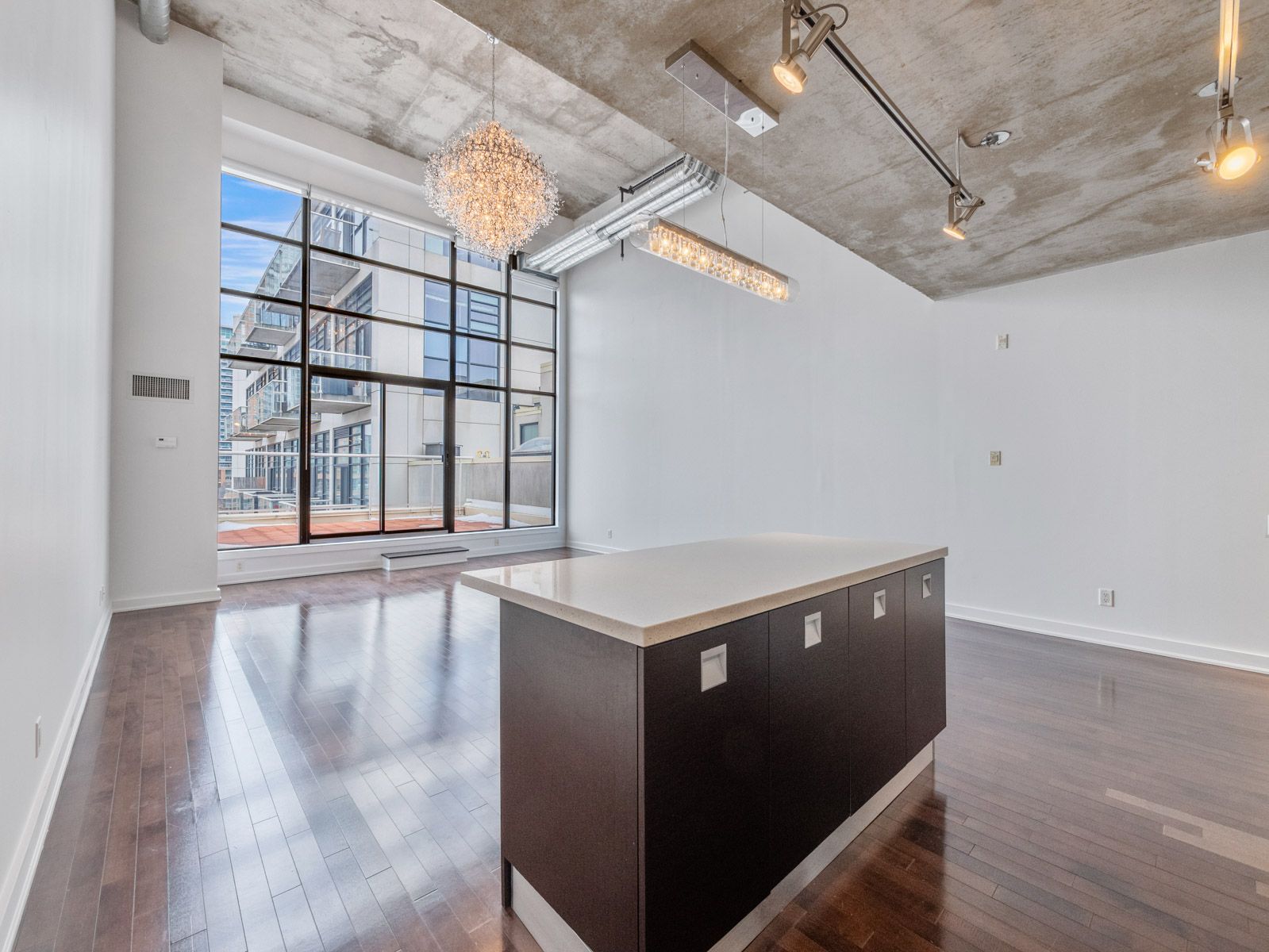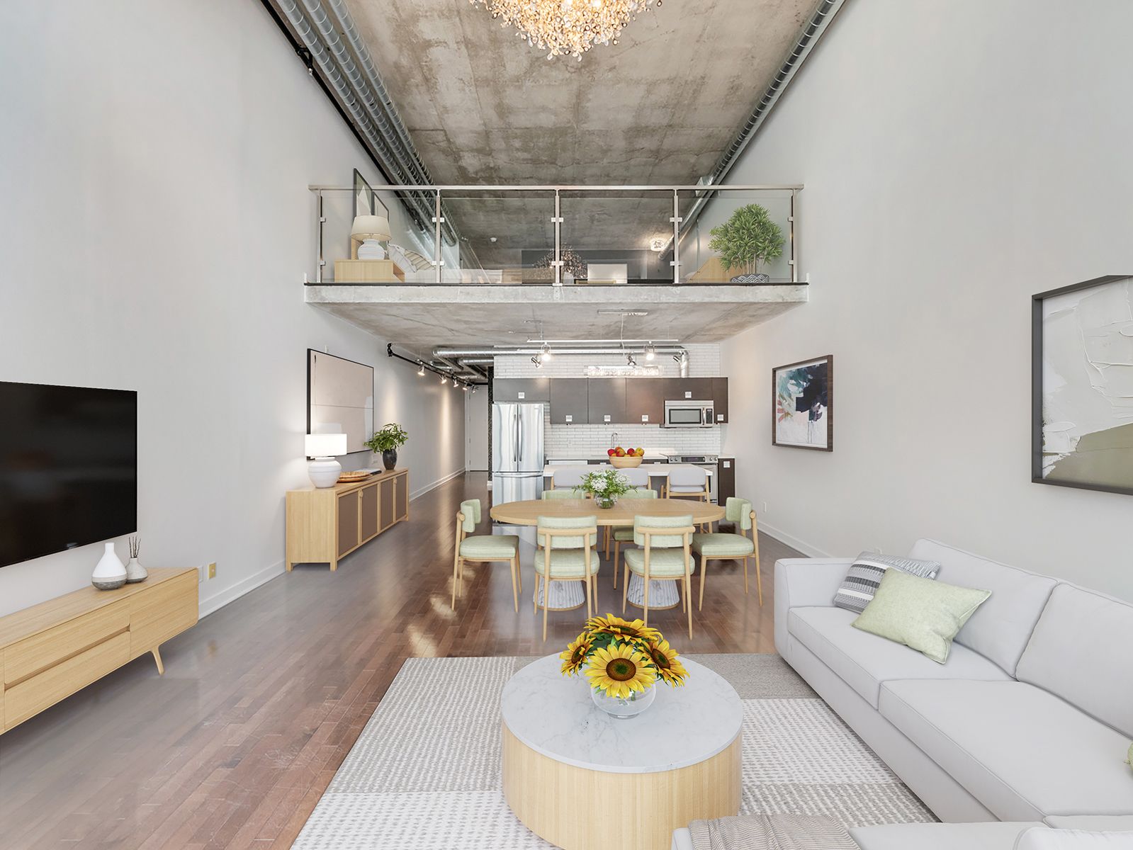 • 17-foot ceilings and floor-to-ceiling windows create an airy atmosphere.
