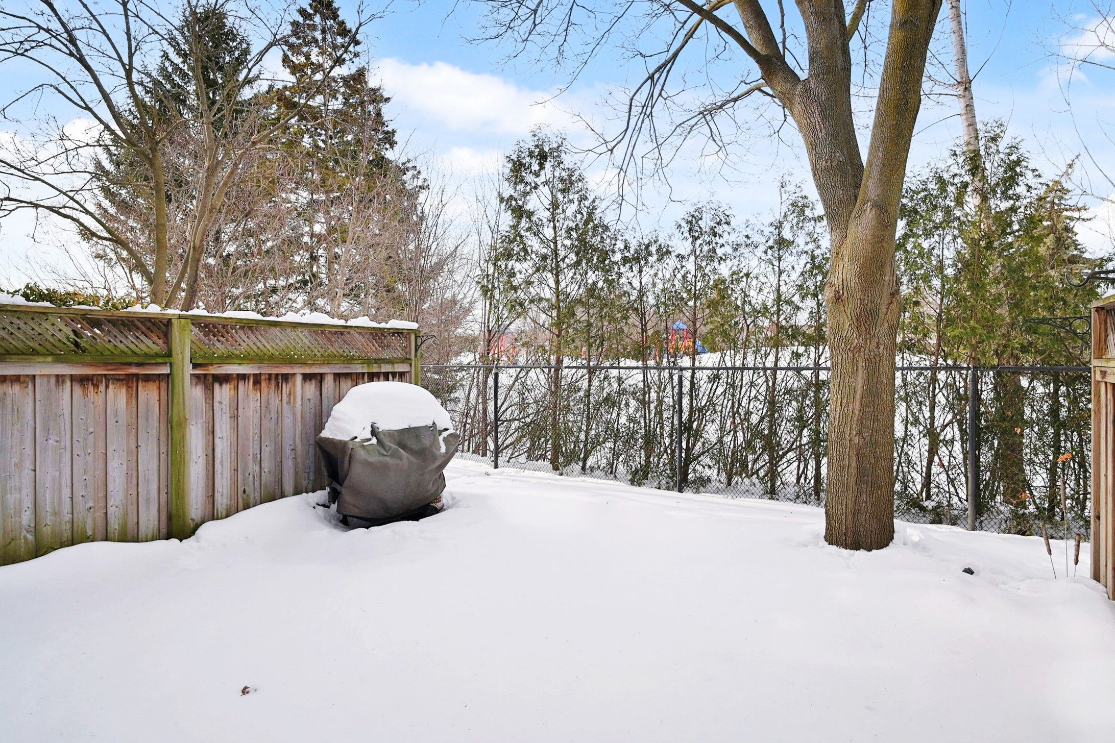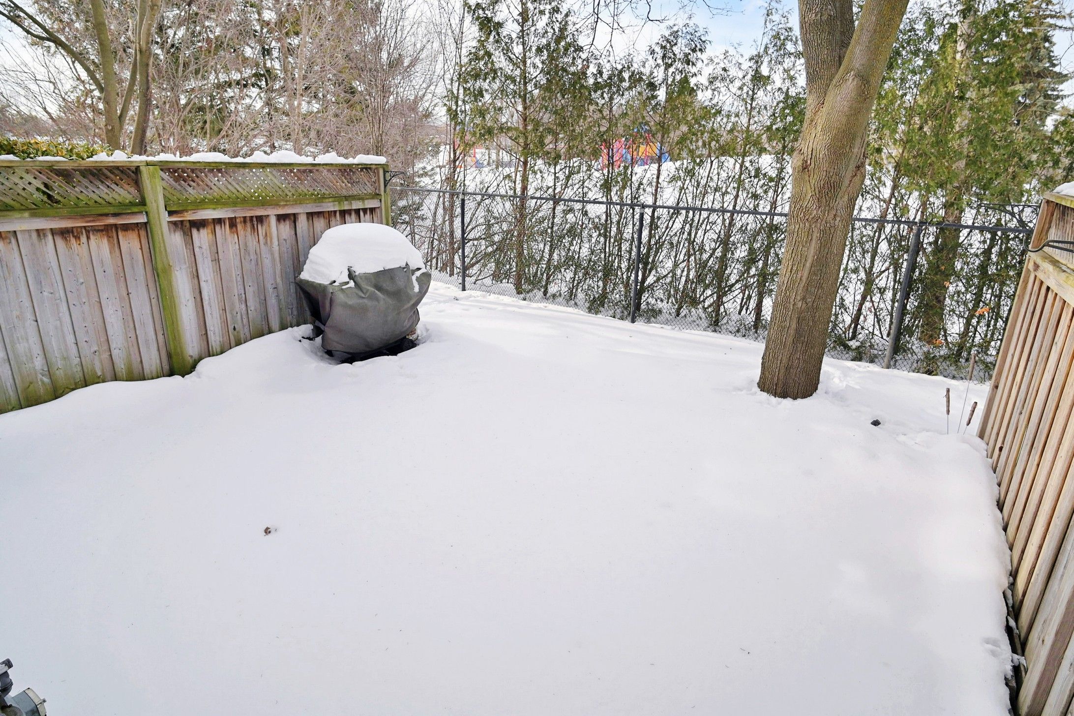 • Private back patio overlooking serene, tree-lined greenspace for relaxation.