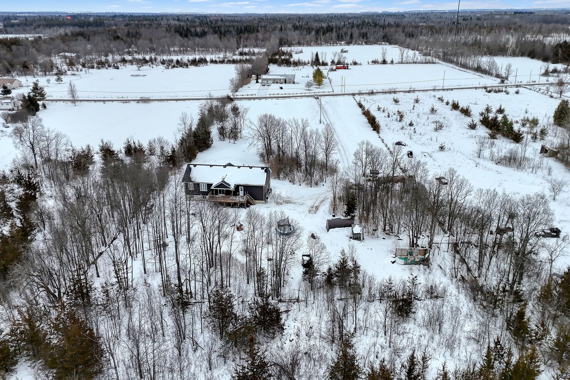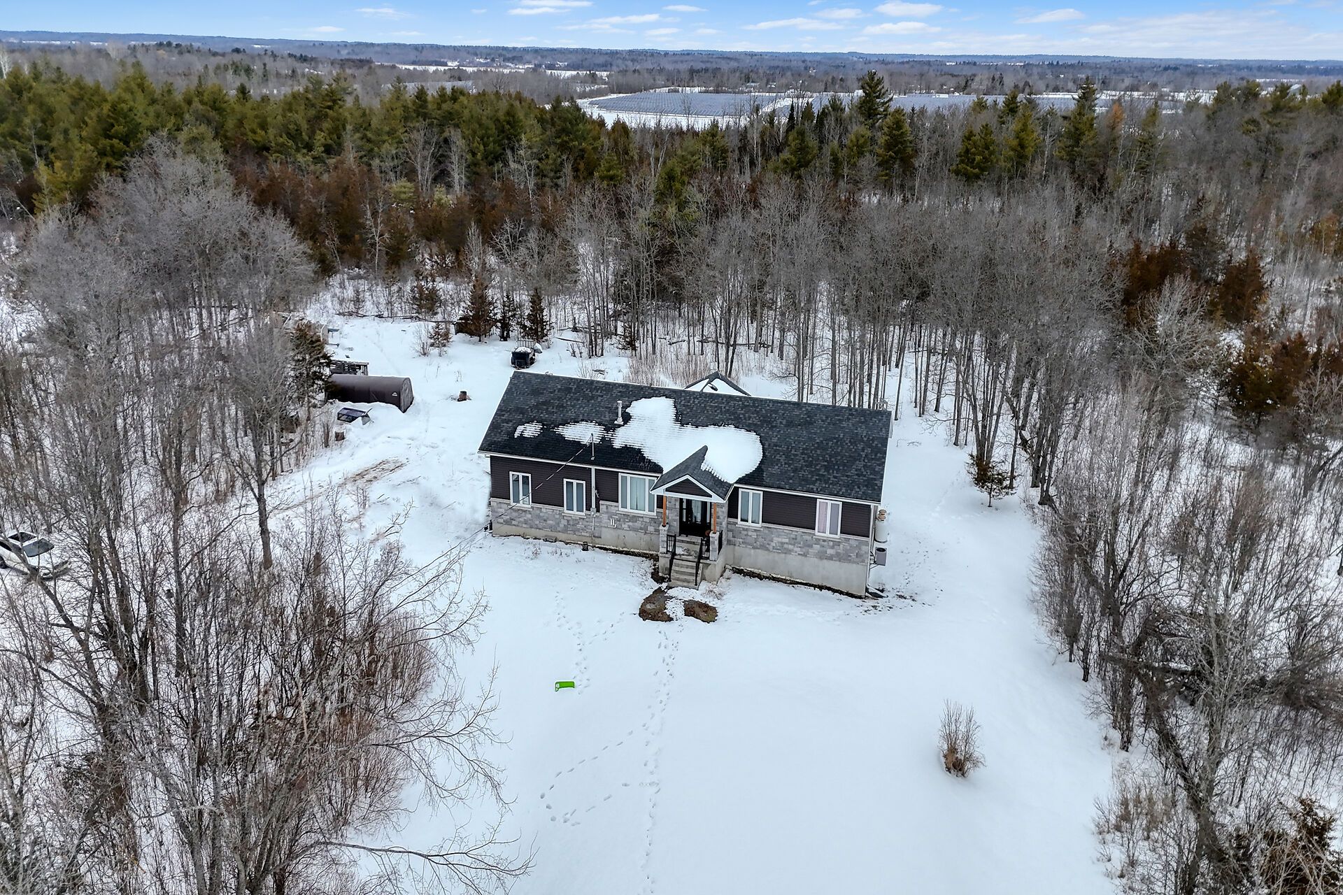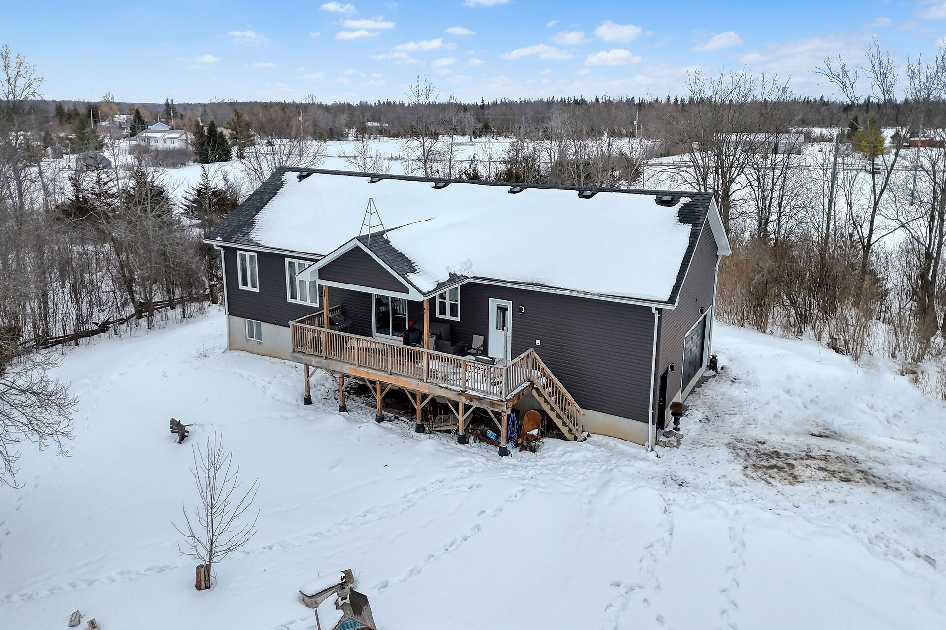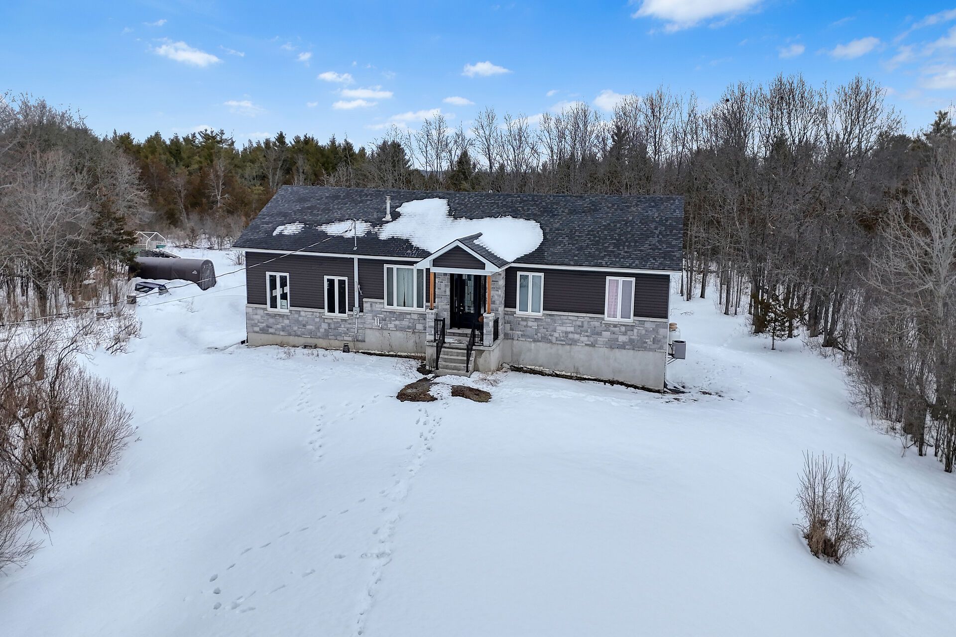 Welcome to this lovely and bright 8-year-old bungalow, offering the perfect blend of modern comfort and peaceful country living. This carpet-free home features 3+2 bedrooms and 3 full bathrooms, thoughtfully designed with quality finishes throughout. The main floor welcomes you with convenient access from the attached double garage, a dedicated laundry/mudroom area, and an inviting open-concept layout. The stunning kitchen showcases quartz countertops, a large island ideal for entertaining, and flows seamlessly into the spacious dining area and living room, complete with a cozy propane fireplace. Sliding doors off the dining area lead to a generous deck overlooking the forest - the perfect spot to relax and enjoy the view. You'll find three well-appointed bedrooms on the main level, including a beautiful primary suite featuring a large walk-in closet and a private ensuite bath, along with a full main bathroom. The fully finished lower level expands your living space with high ceilings, in-floor heating, two additional bedrooms, a 3-piece bathroom, a large recreation room, and storage. The utility room also provides convenient access to the garage. Tastefully finished throughout with durable vinyl plank flooring, this home is move-in ready and designed for easy living. Situated on 3. 36 private acres and set well back from hegadorn road, this property offers exceptional privacy while still being easily accessible. We look forward to welcoming you home!