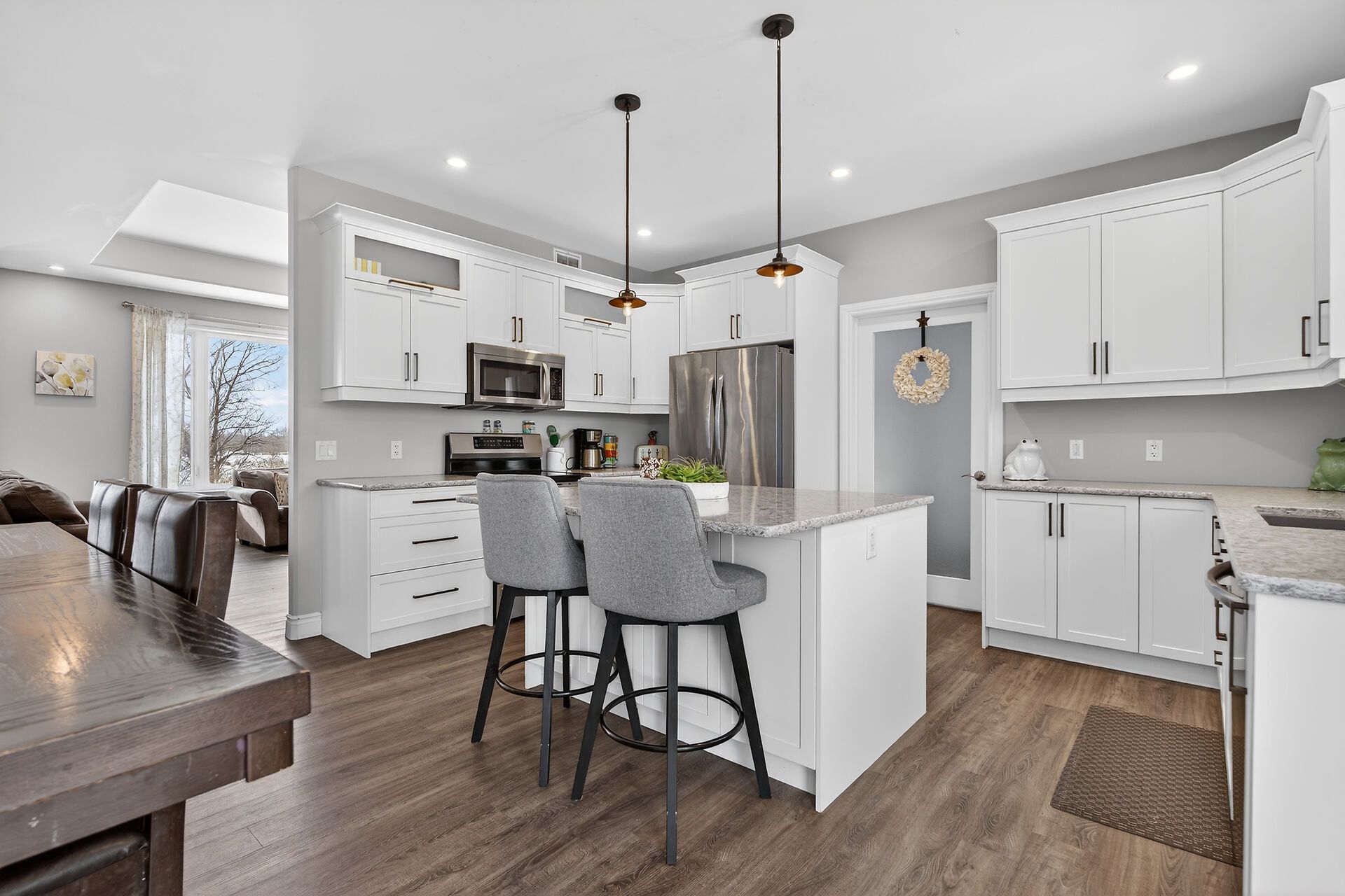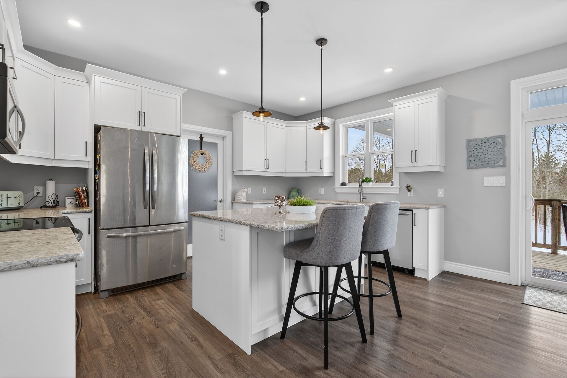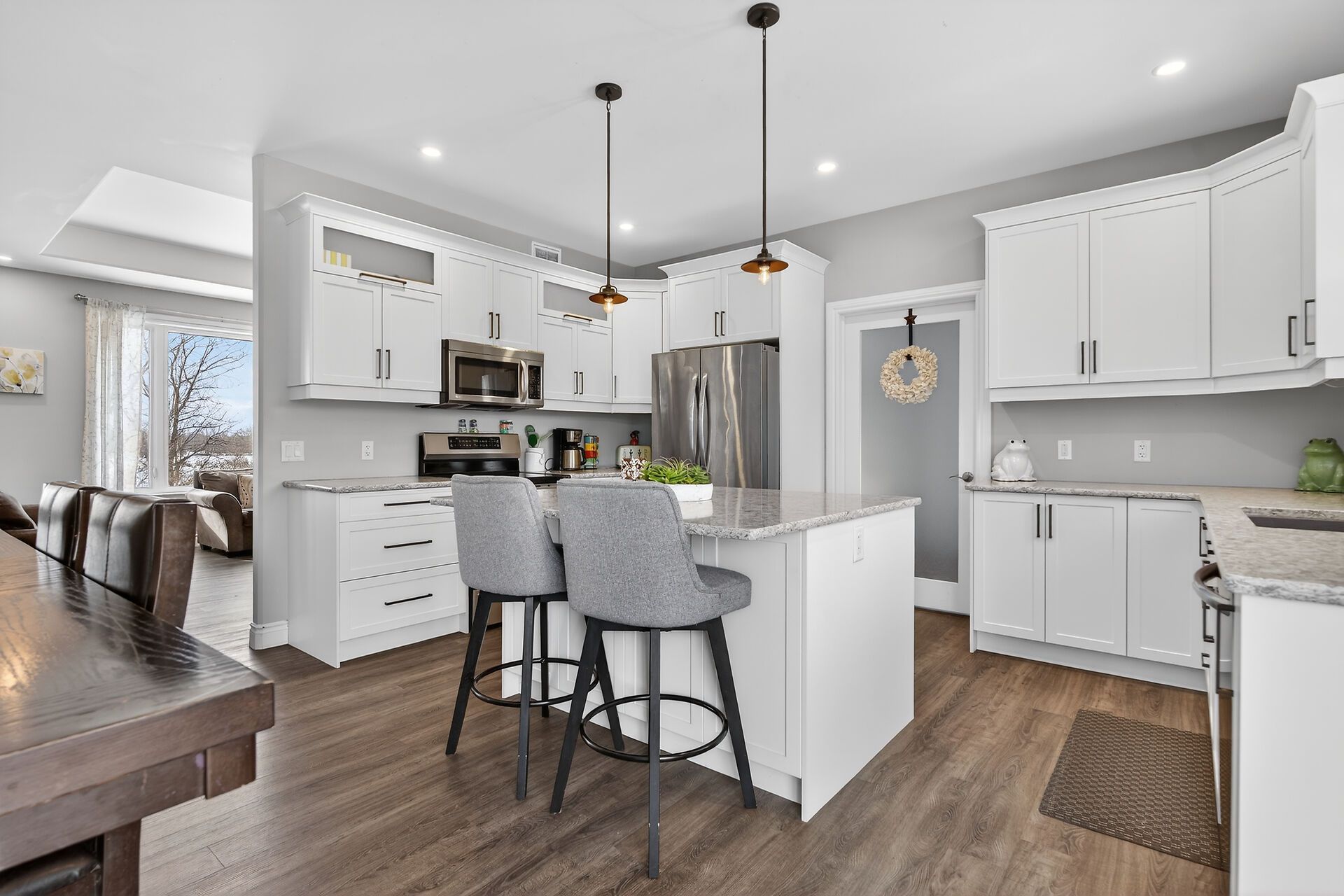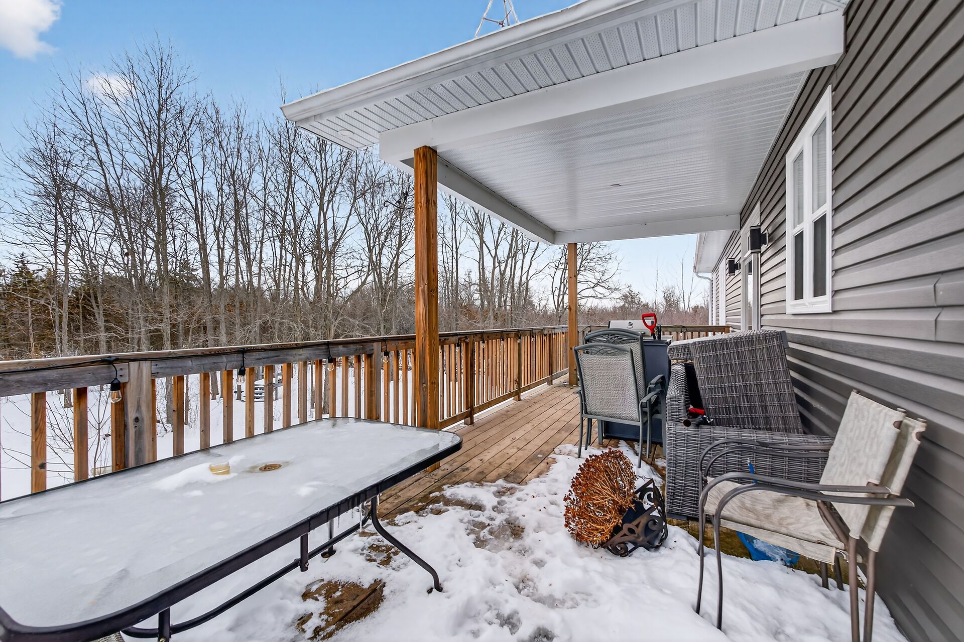 Welcome to this lovely and bright 8-year-old bungalow, offering the perfect blend of modern comfort and peaceful country living. This carpet-free home features 3+2 bedrooms and 3 full bathrooms, thoughtfully designed with quality finishes throughout. The main floor welcomes you with convenient access from the attached double garage, a dedicated laundry/mudroom area, and an inviting open-concept layout. The stunning kitchen showcases quartz countertops, a large island ideal for entertaining, and flows seamlessly into the spacious dining area and living room, complete with a cozy propane fireplace. Sliding doors off the dining area lead to a generous deck overlooking the forest - the perfect spot to relax and enjoy the view. You'll find three well-appointed bedrooms on the main level, including a beautiful primary suite featuring a large walk-in closet and a private ensuite bath, along with a full main bathroom. The fully finished lower level expands your living space with high ceilings, in-floor heating, two additional bedrooms, a 3-piece bathroom, a large recreation room, and storage. The utility room also provides convenient access to the garage. Tastefully finished throughout with durable vinyl plank flooring, this home is move-in ready and designed for easy living. Situated on 3. 36 private acres and set well back from hegadorn road, this property offers exceptional privacy while still being easily accessible. We look forward to welcoming you home!