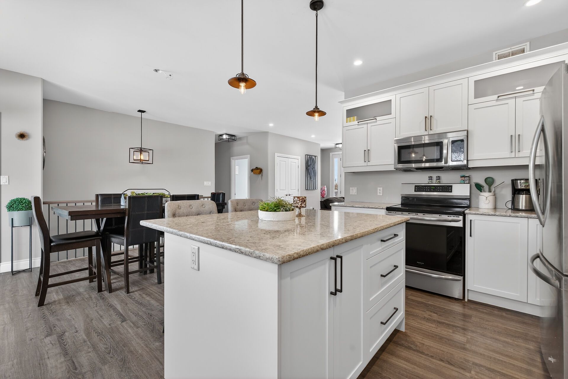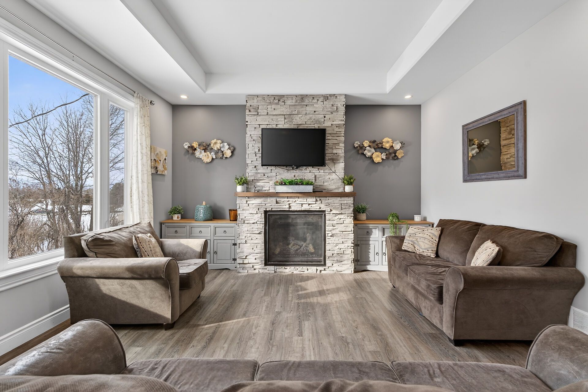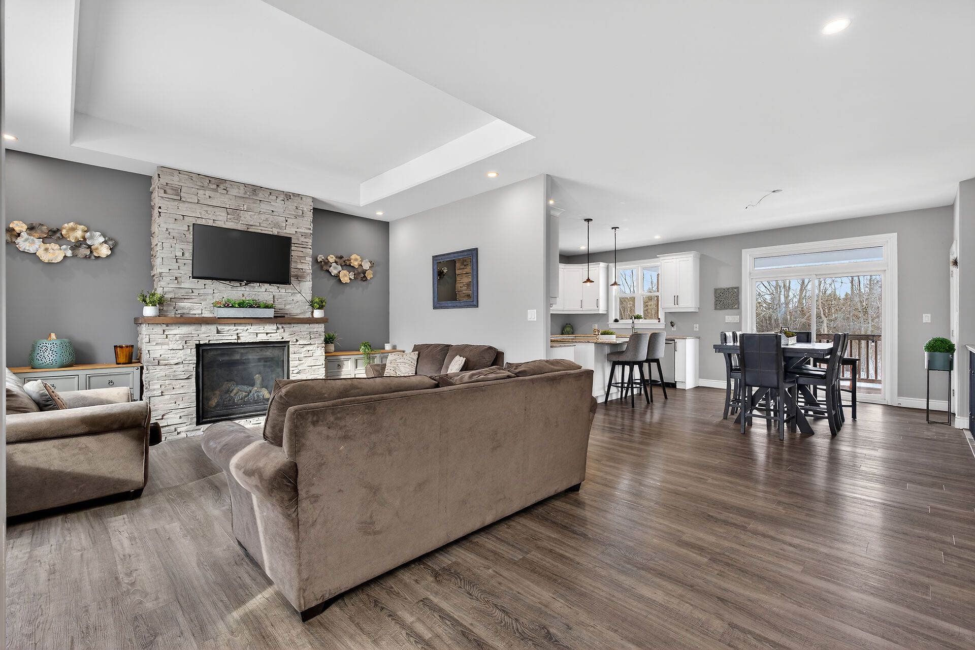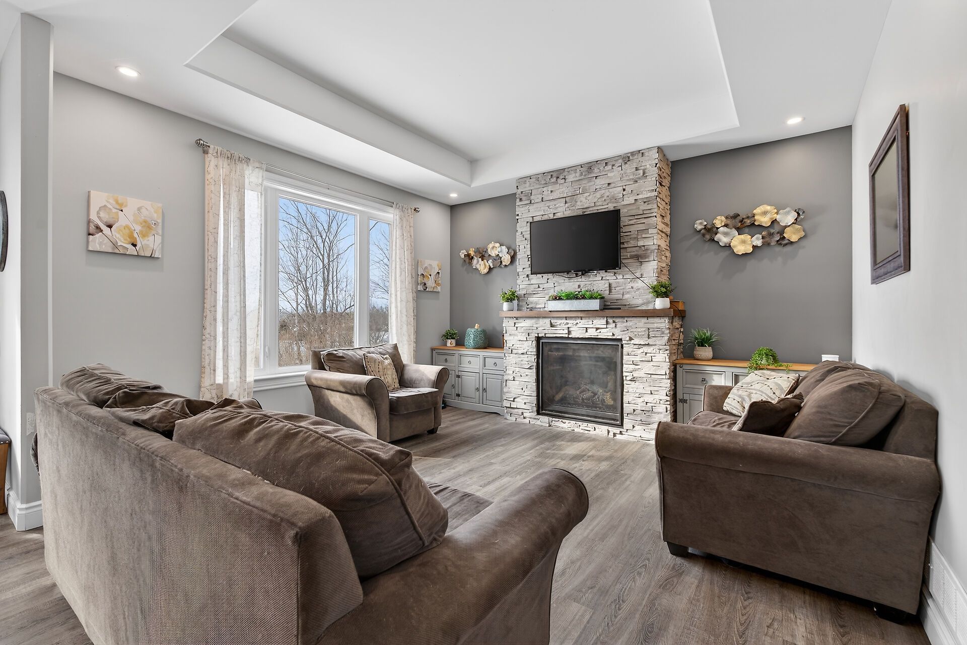 • Open-concept layout with a stylish kitchen and cozy propane fireplace.