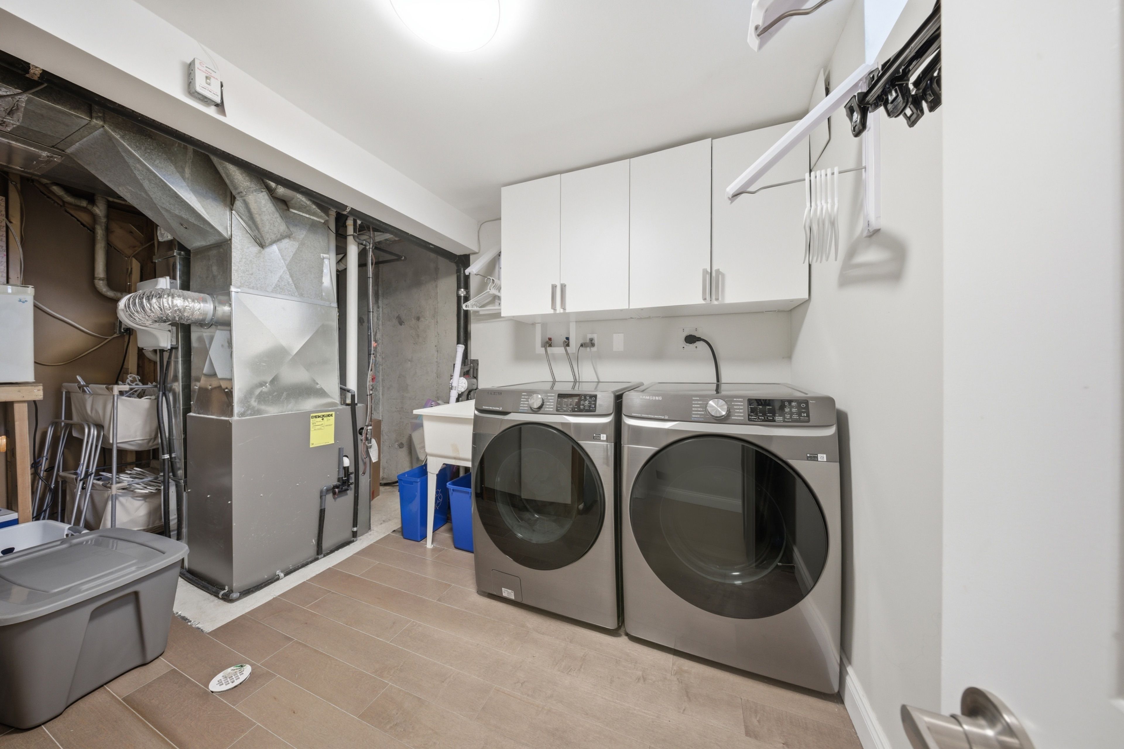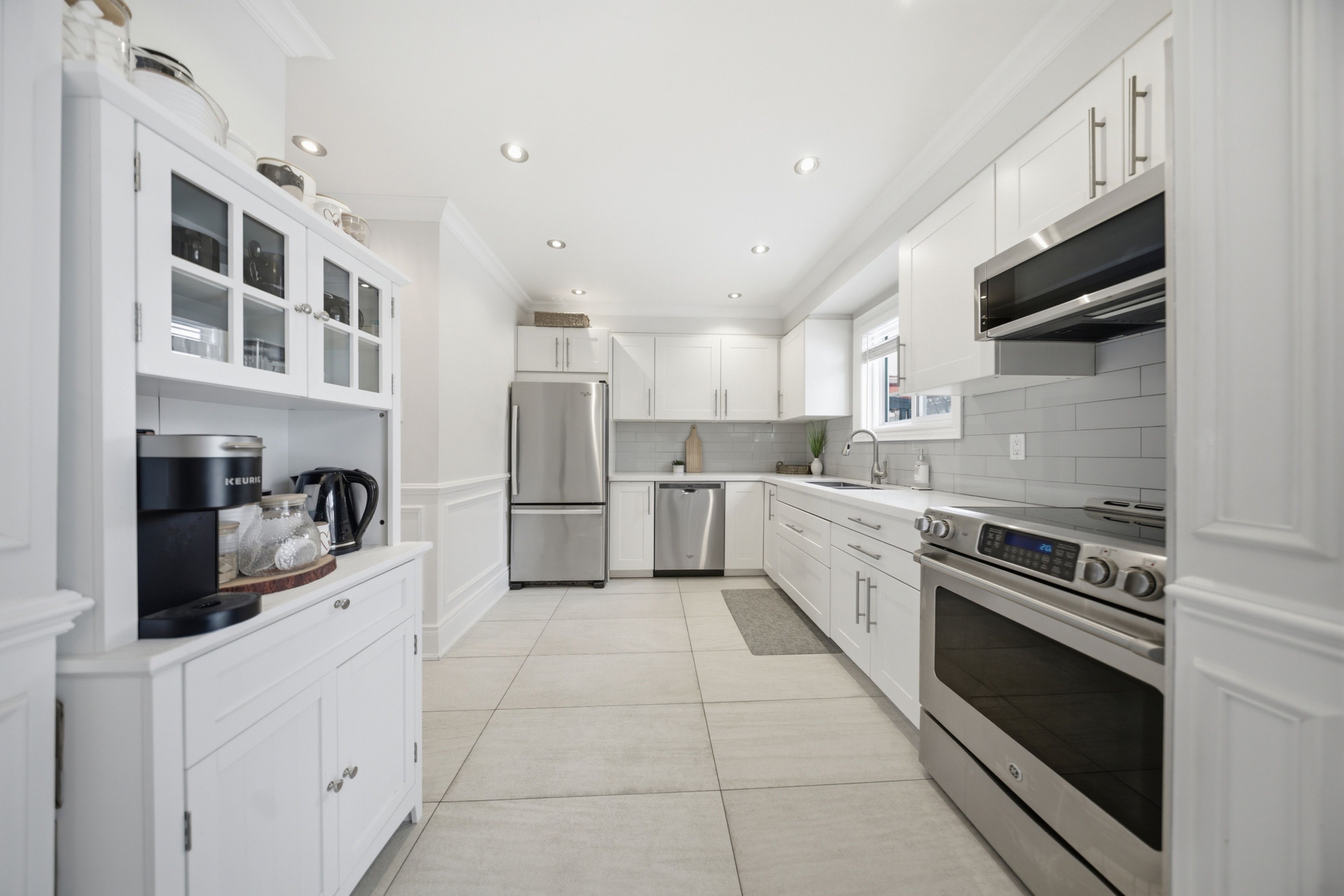 • Gourmet kitchen with quartz counters, custom backsplash, and stainless steel appliances.