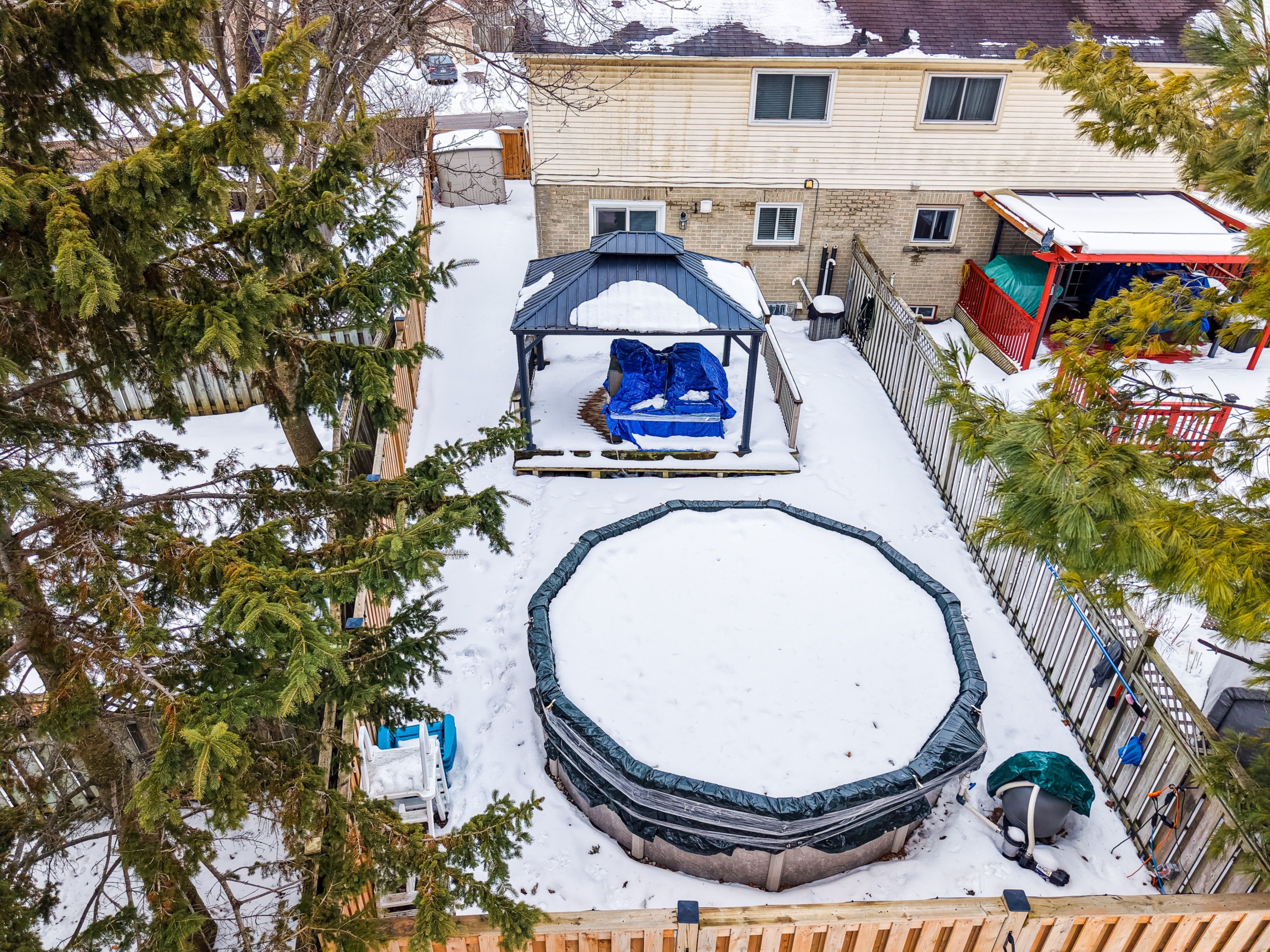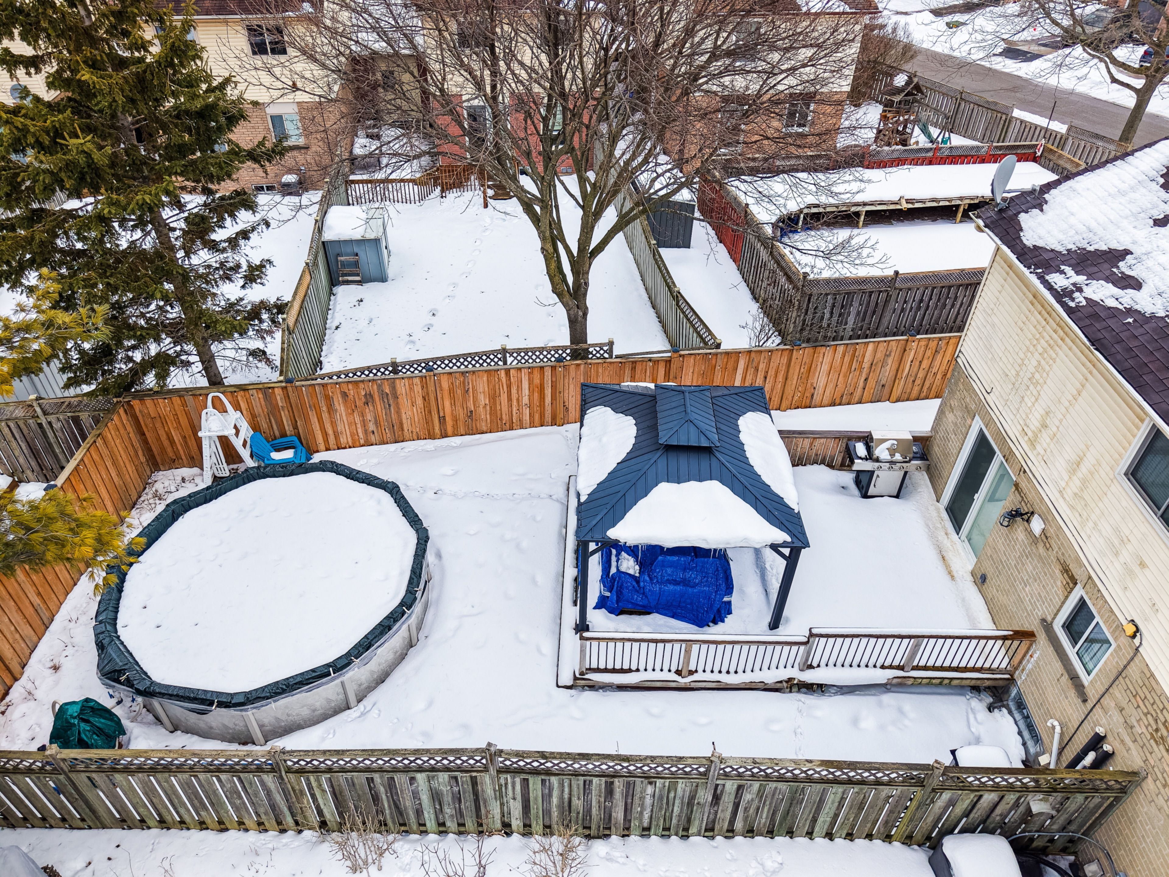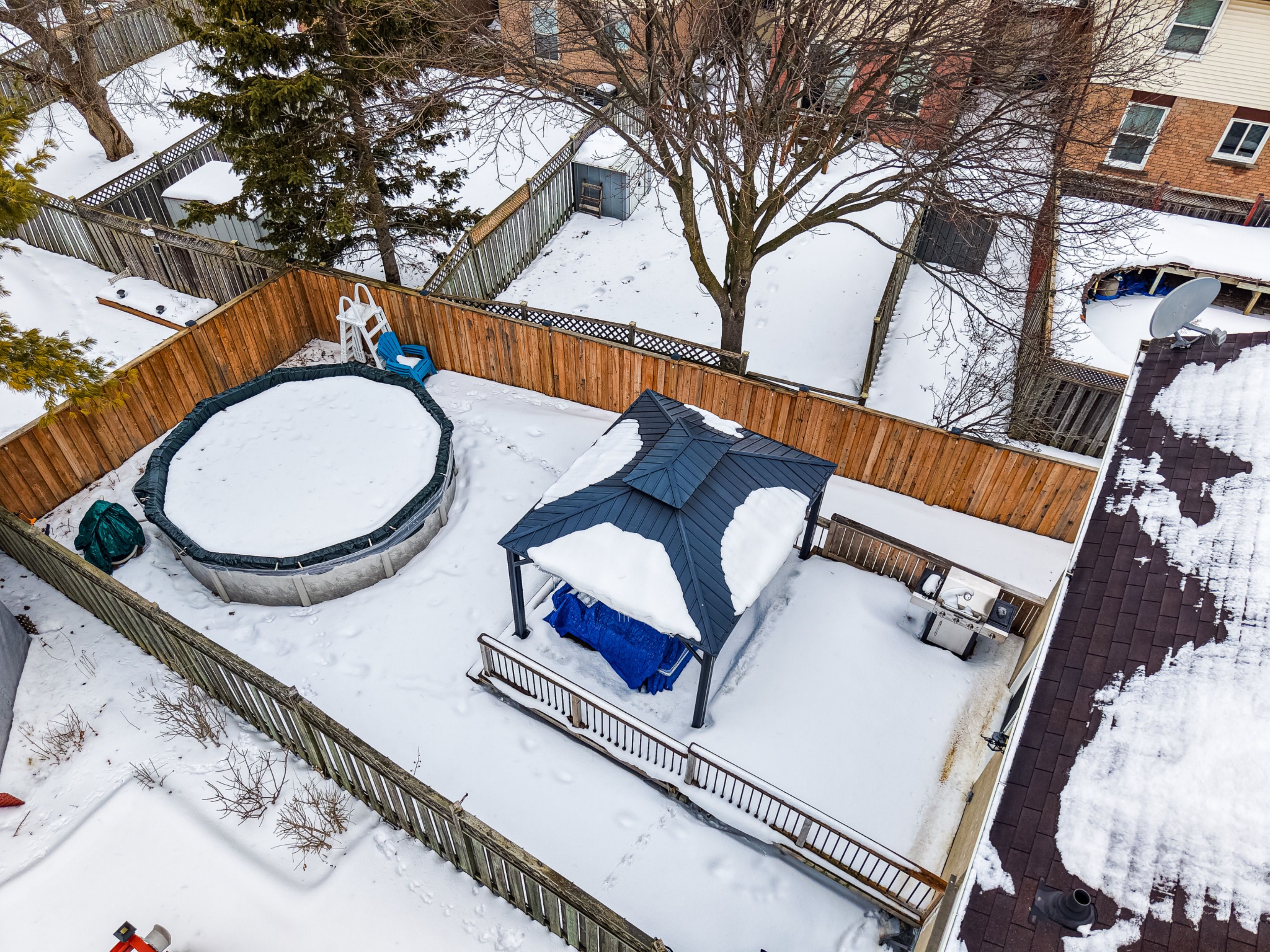 • Private backyard featuring a two-tier deck, gazebo, and above-ground pool.
