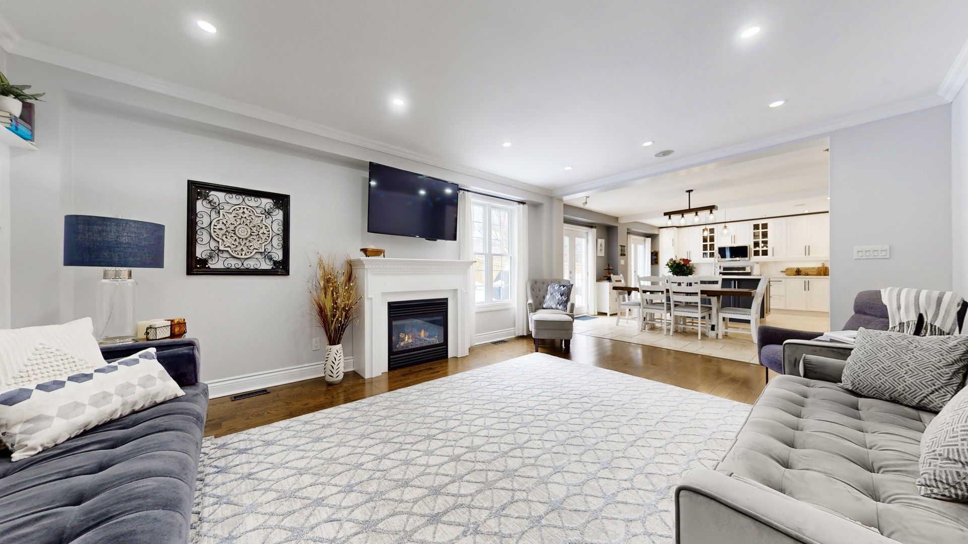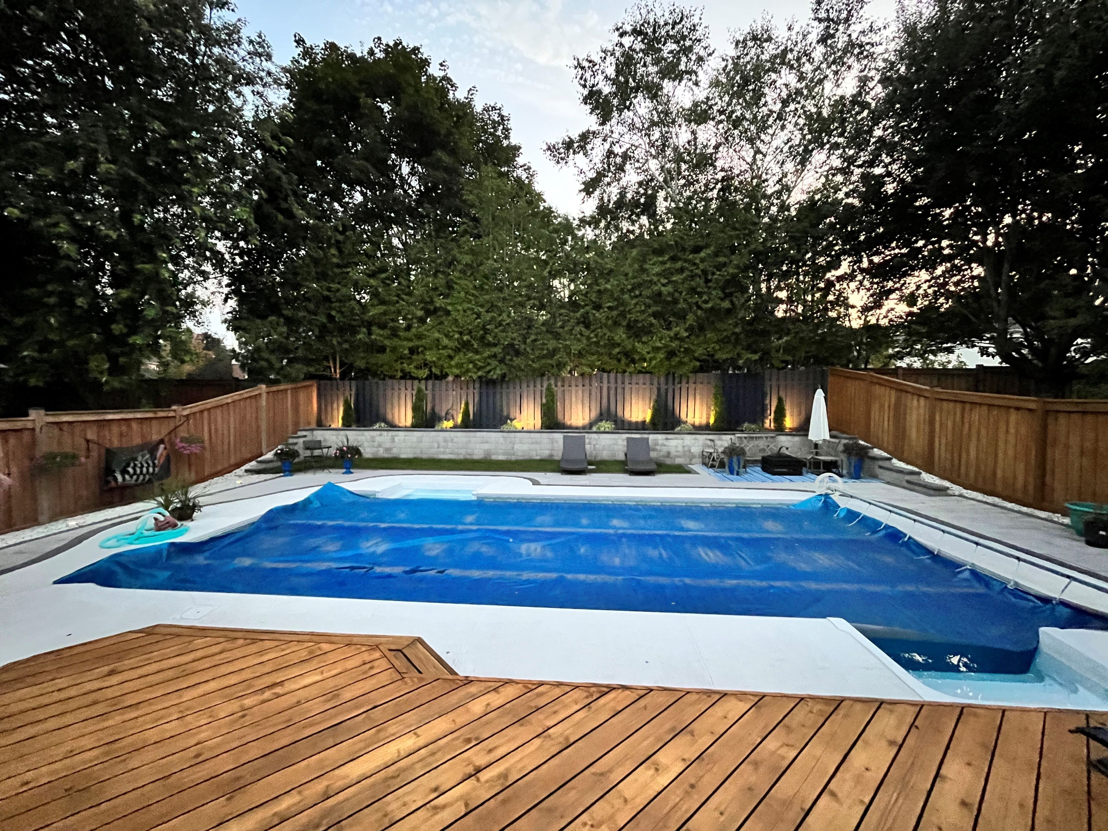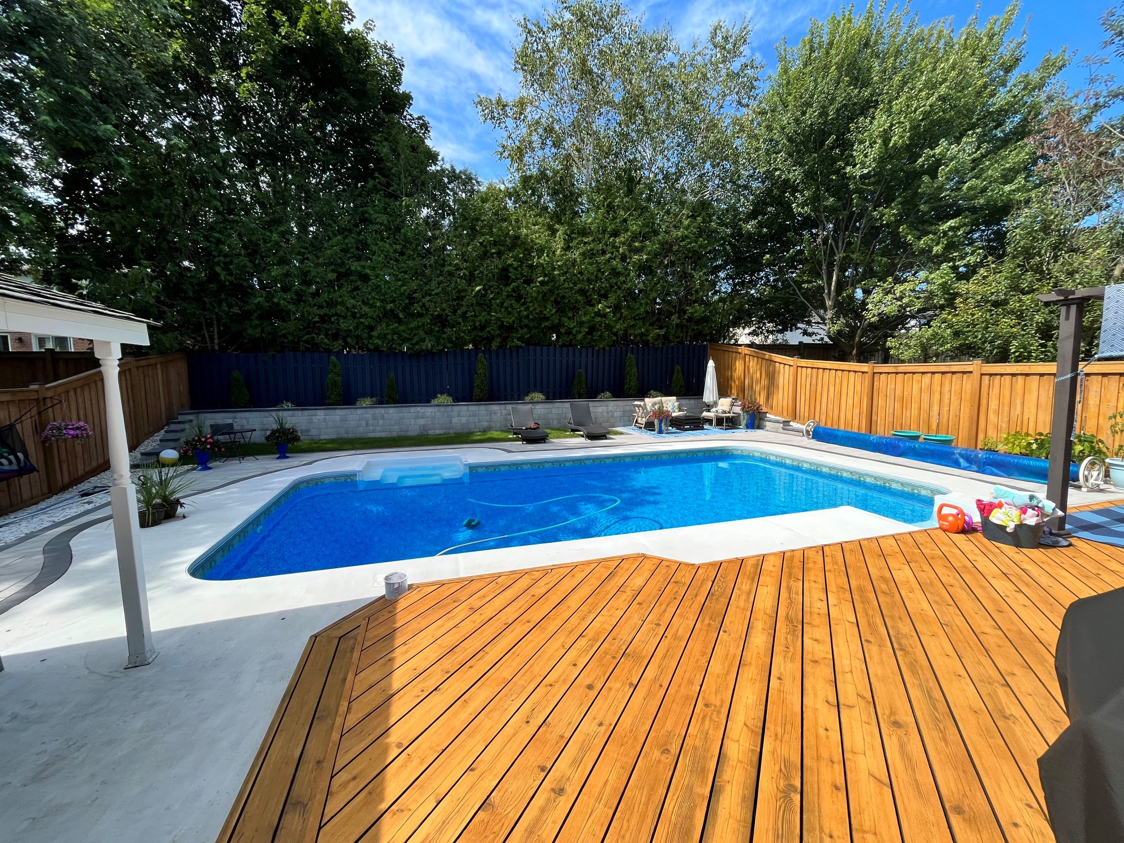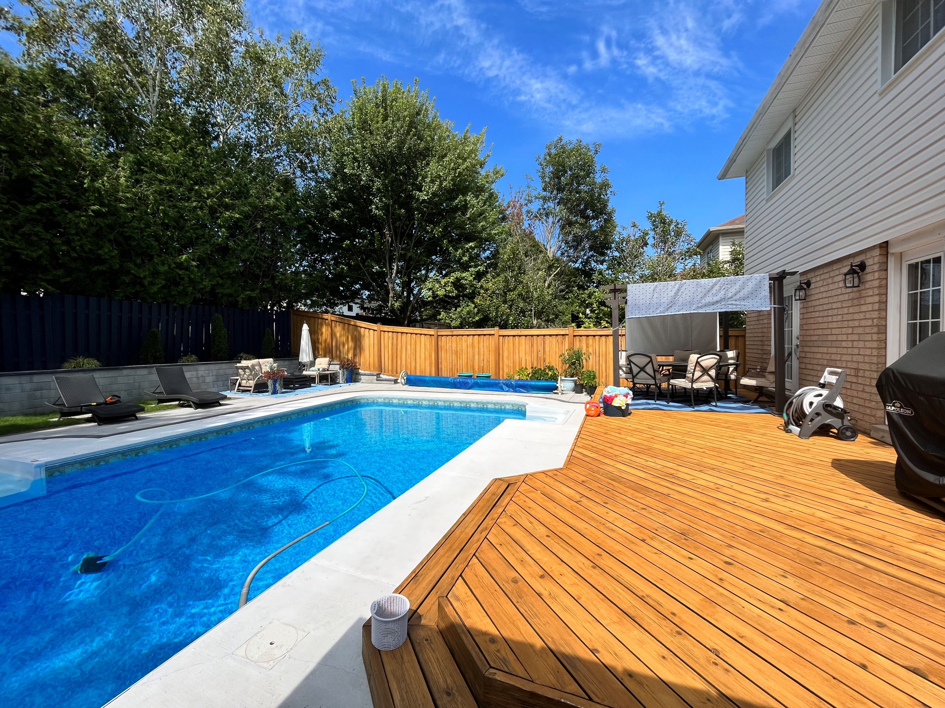 Welcome to 43 mcguire crescent, a beautifully updated 4+1-bedroom, 3+1-bathroom family home in sought-after west uxbridge. Located on a quiet crescent just a short walk to schools, the arena, splash pad, downtown shopping, and the scenic butternut trail, this home offers the perfect blend of community and lifestyle. Impressive curb appeal upgrades include a high-quality black entry door, replaced bay window, rebuilt front porch and gemstone accent facade lighting. Inside, the bright open-concept layout is ideal for modern family living and entertaining. The stunning all-white kitchen boasts stone countertops, custom backsplash, and a generous size center island overlooking the dining area with wet bar. The space flows seamlessly into the spacious family room with gas fireplace, crown molding, and paneled feature wall. Dual garden doors provide easy access to the deck for effortless indoor-outdoor living. A sun-filled home office off the front entry offers an ideal work-from-home setup. The finished basement adds valuable living space with a large recreation room, games/exercise area, spacious fifth bedroom with wall-to-wall closet, and stylish 3-piece bath. Plumbing is roughed-in for a future wet bar or kitchenette, offering excellent second-suite potential. Step outside to your private sun-drenched west exposure backyard retreat. The 16' x 32' pool with staircase entry and spillover spa anchors this resort-like setting. Recent upgrades include pool liner, gas heater, safety cover, solar blanket, replaced fencing and deck, permacon retaining wall, landscape lighting and a stone slab patio with river stone border. A charming board-and-batten pool house serves as change room and equipment space. The expansive deck features a natural gas bbq line and pergola with shades and insect screens for shaded comfort. Move-in ready and designed for both everyday living and summer entertaining, this is a rare opportunity in one of uxbridge's most desirable neighbourhoods.