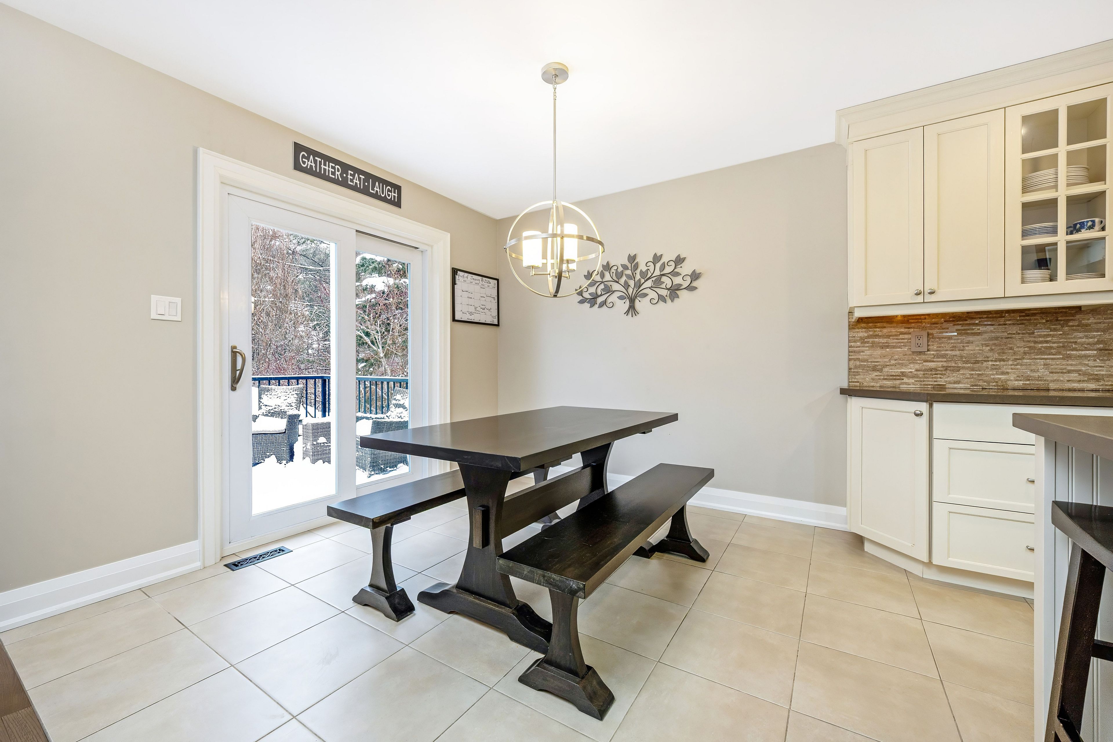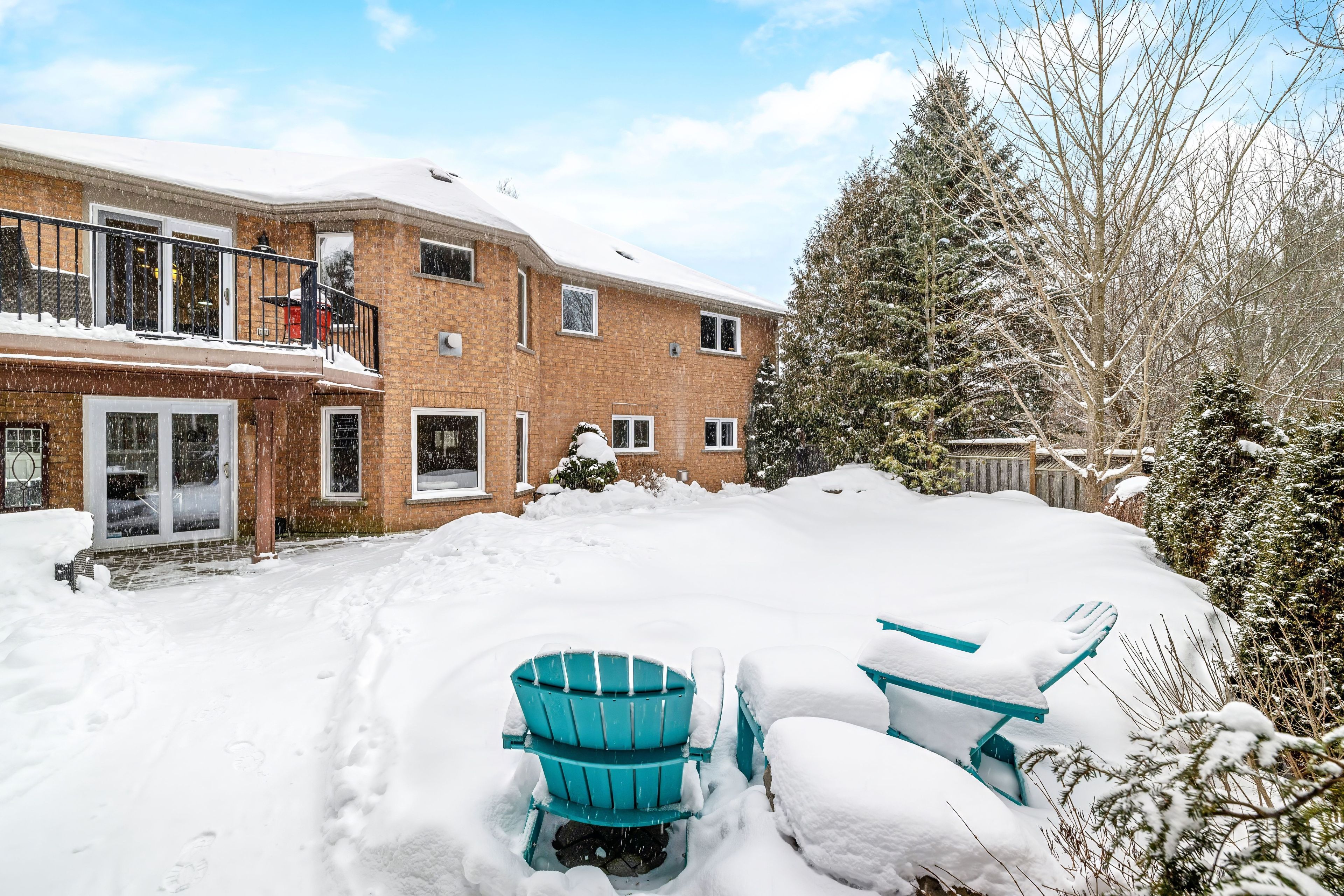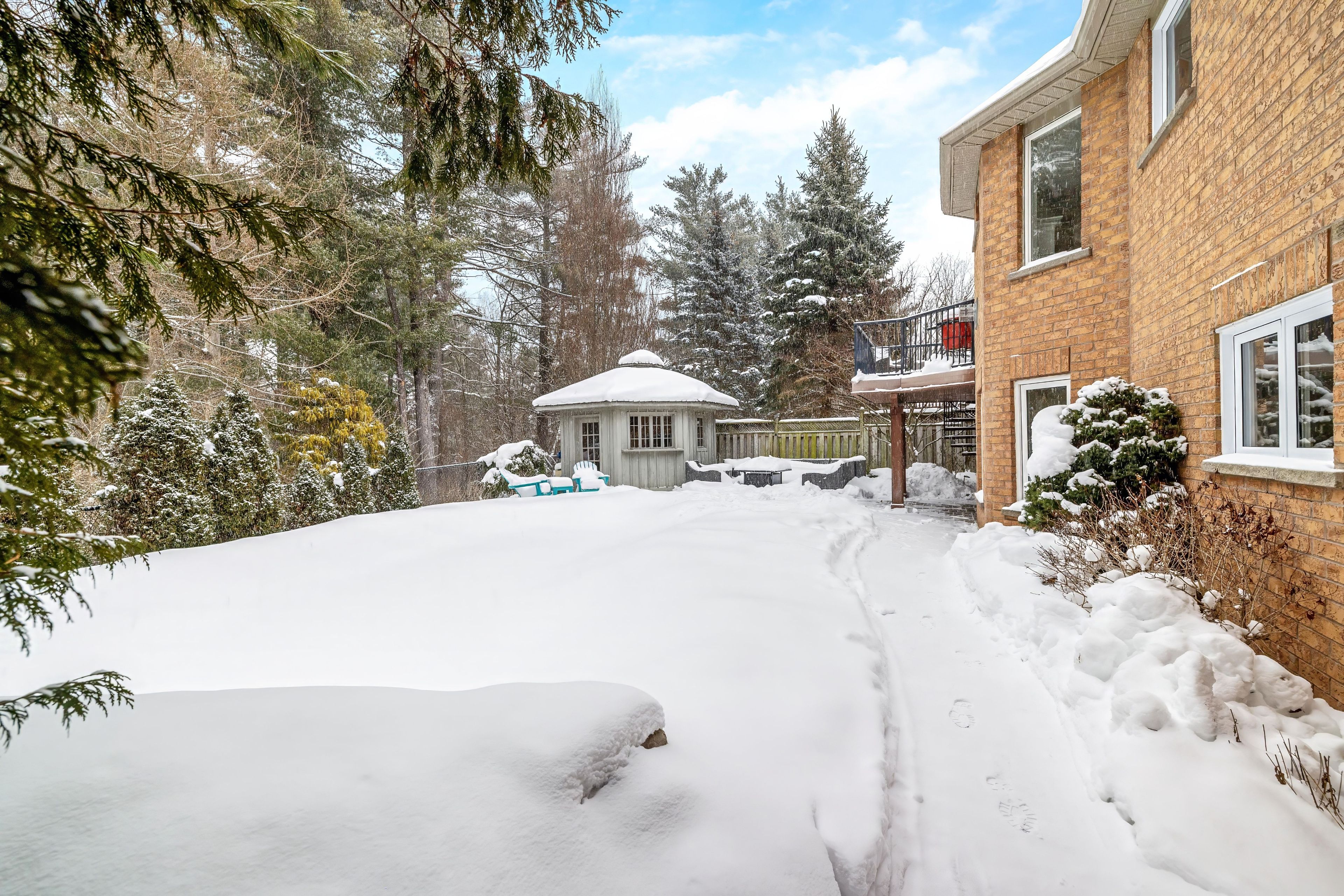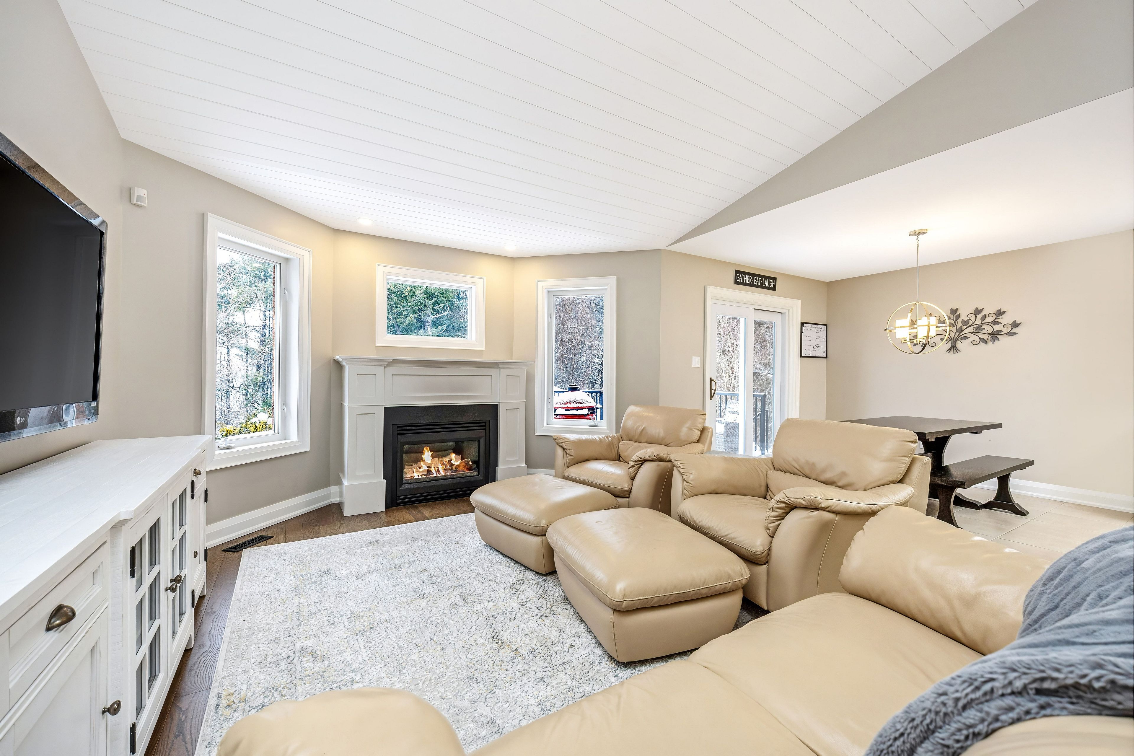 Welcome to newman place, a quiet cul-de-sac just minutes from downtown georgetown, offering a stunning detached bungalow set on a private ravine lot with an inground pool. A landscaped front yard and stone walkway lead to a bright, inviting foyer highlighted by soaring ceilings, an arched transom window, and full-height sidelights. The main level features hardwood flooring throughout and a seamless open-concept layout ideal for both everyday living and entertaining. The living and dining areas are accented by crown moulding, expansive windows, and a striking feature wall with an electric fireplace. The kitchen showcases white shaker-style cabinetry, quartz countertops, tile backsplash, a centre island with breakfast bar seating, and stainless steel appliances. The adjoining breakfast area offers a walkout to a private composite deck with gas bbq hookup and spiral staircase to pool area. Open to the kitchen, the family room impresses with vaulted shiplap ceilings, a gas fireplace, & large windows overlooking the ravine. The primary bedroom retreat features hardwood flooring, a walk-in closet with built-in shelving, and a spa-inspired five-piece ensuite complete with soaker tub, glass-enclosed shower, and double vanity. Two additional bedrooms, a four-piece family bathroom, and a convenient laundry room with garage access complete the main level. The finished lower-level walkout is designed for entertaining, featuring a movie room, office area, and a spacious recreation room with wet bar and gas fireplace. Two additional bedrooms & a four-piece bathroom provide excellent space for teens, guests, or in-law potential. Step outside to enjoy the private backyard oasis, perfect for hot summer days, complete with an interlocking stone patio, heated inground saltwater pool with waterfall, cabana, and the private ravine setting. All this close to downtown, farmer's market & park public school with easy access to commuter routes. Don't miss out on this one!