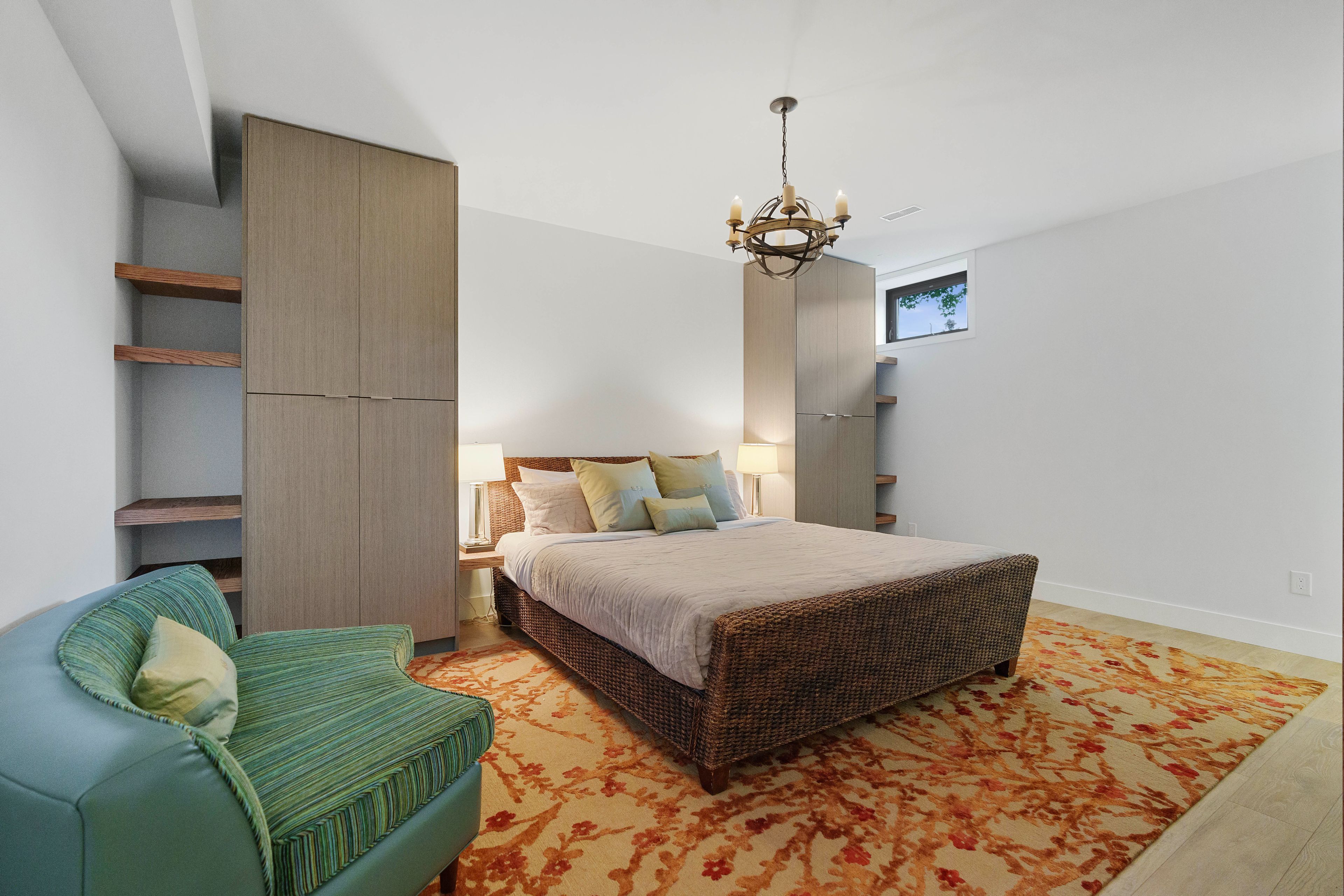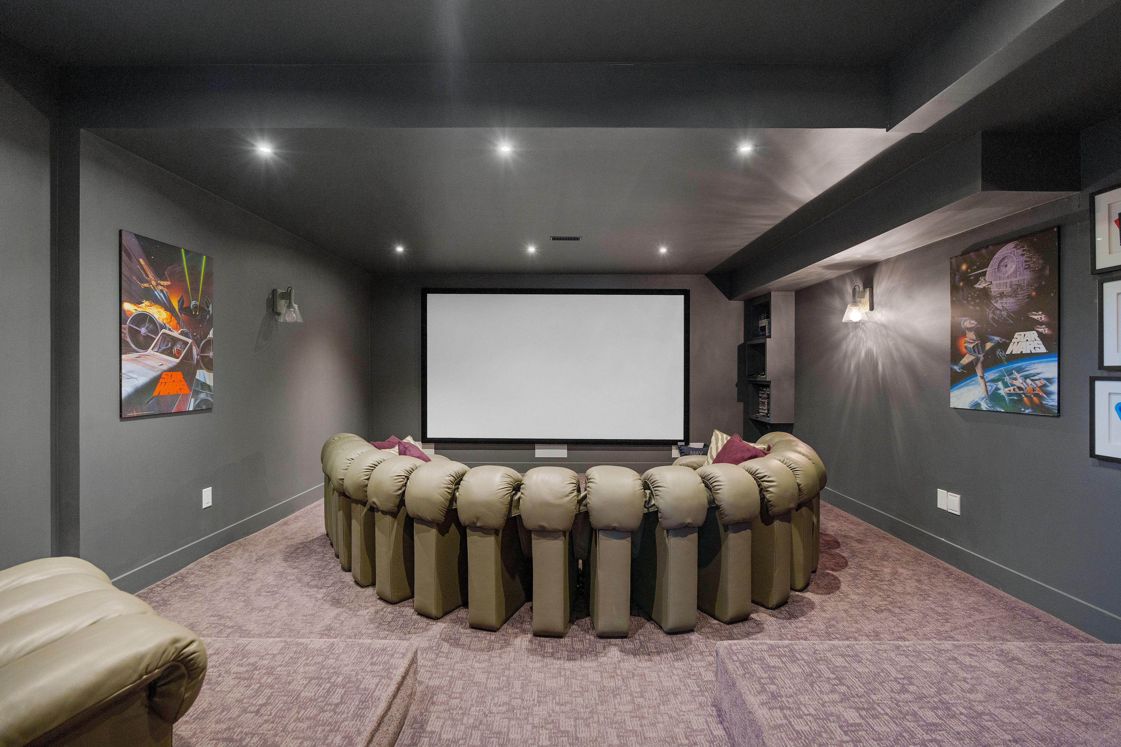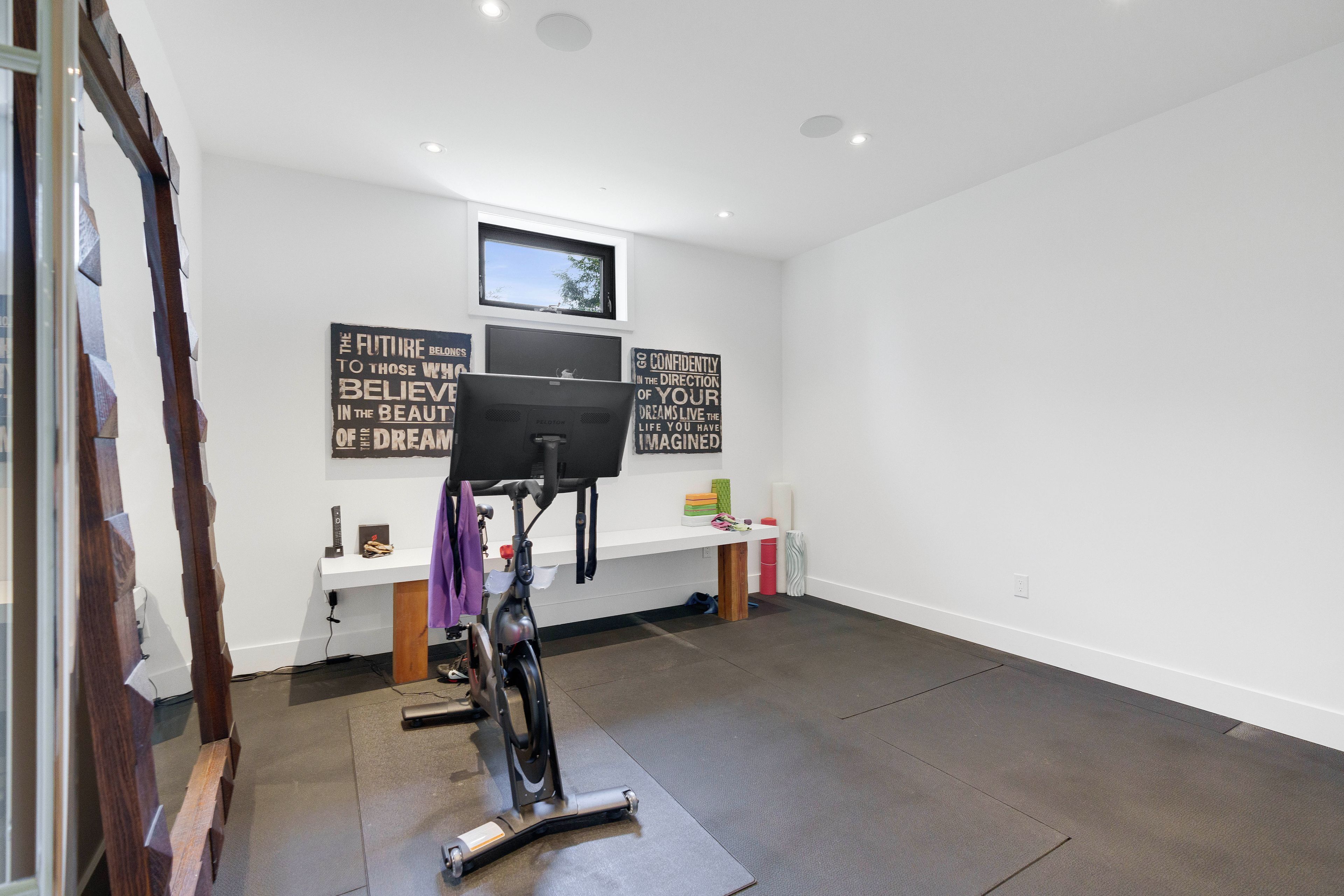 • Fully equipped basement with theater, gym, kitchenette, and bar.