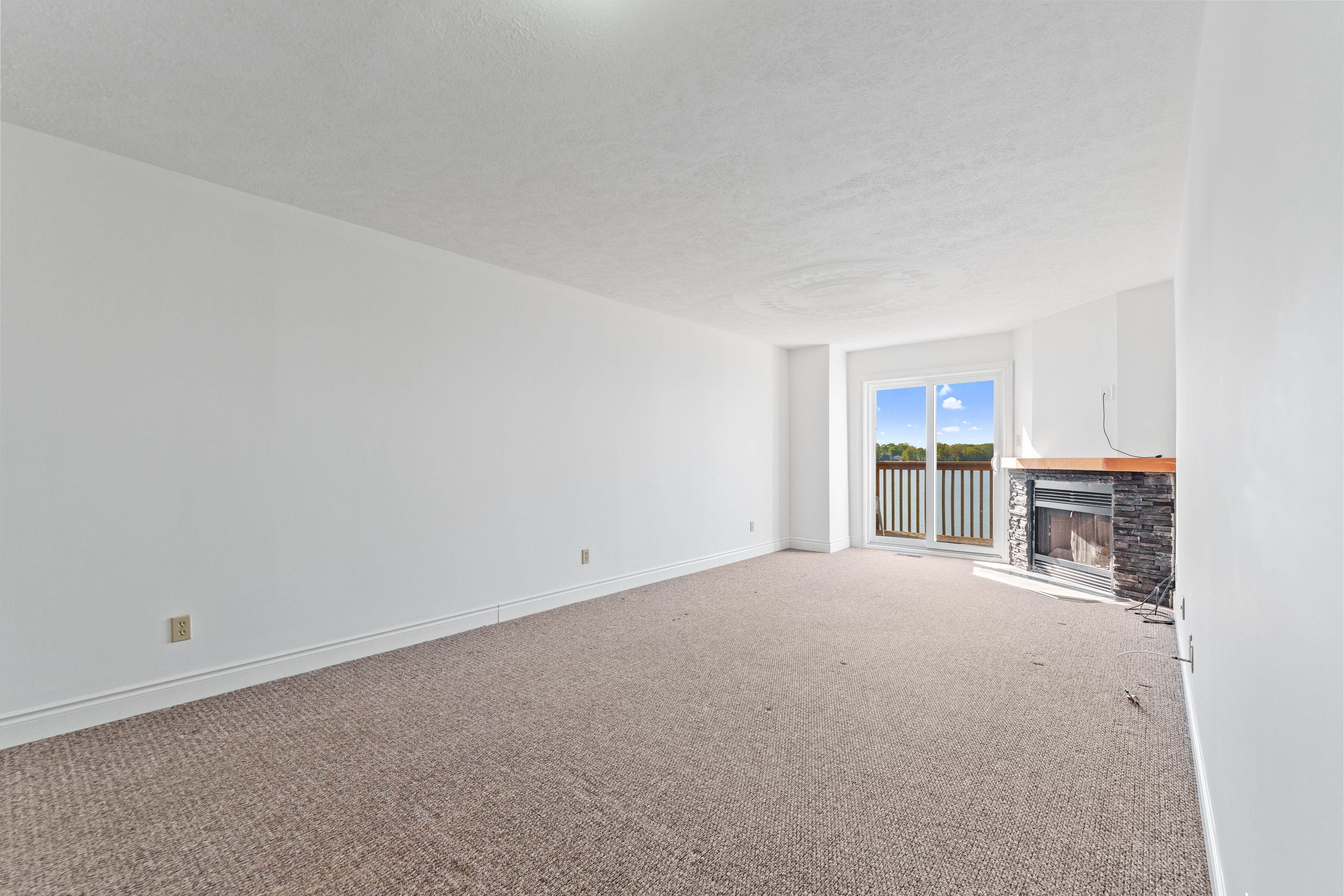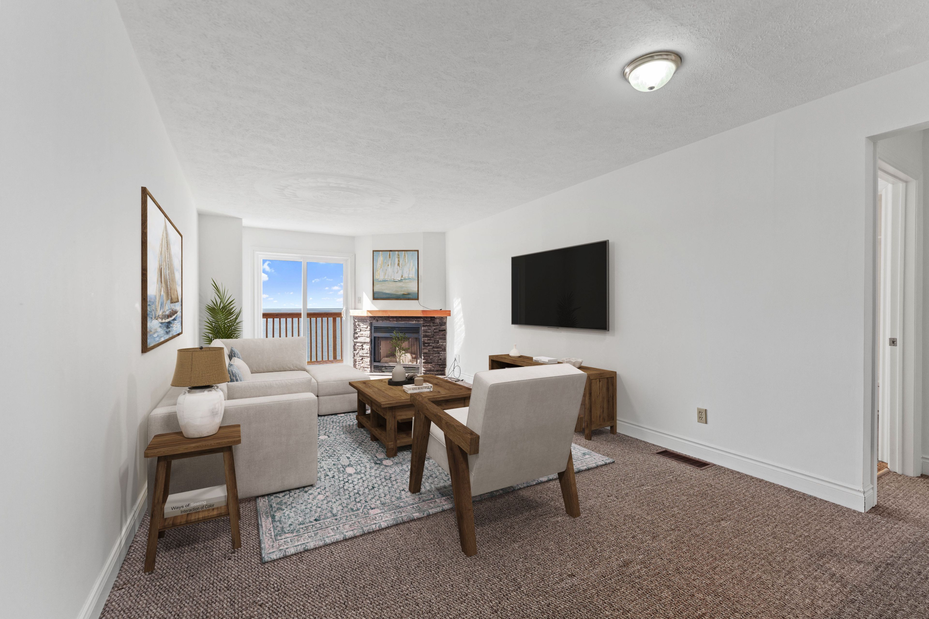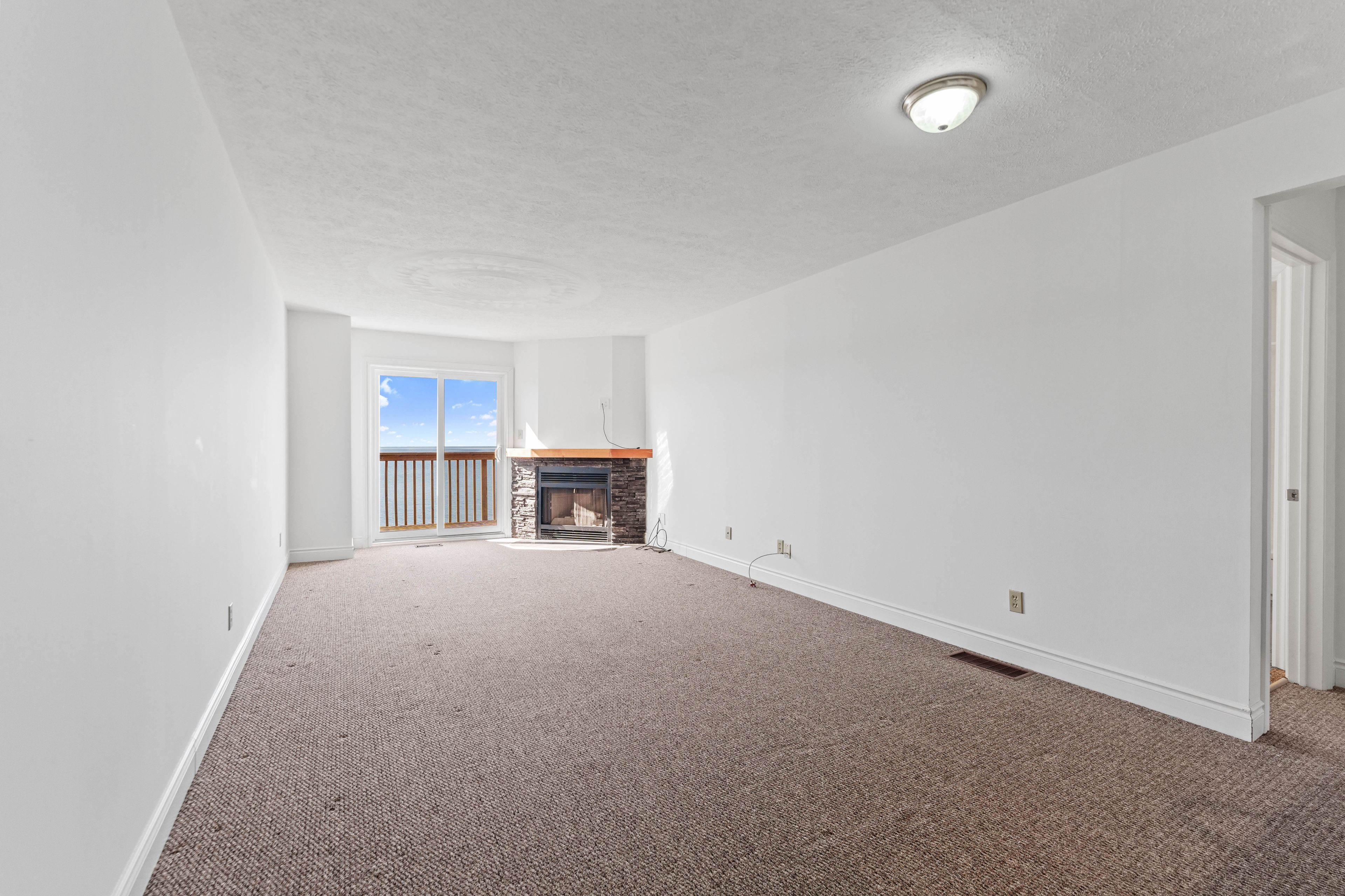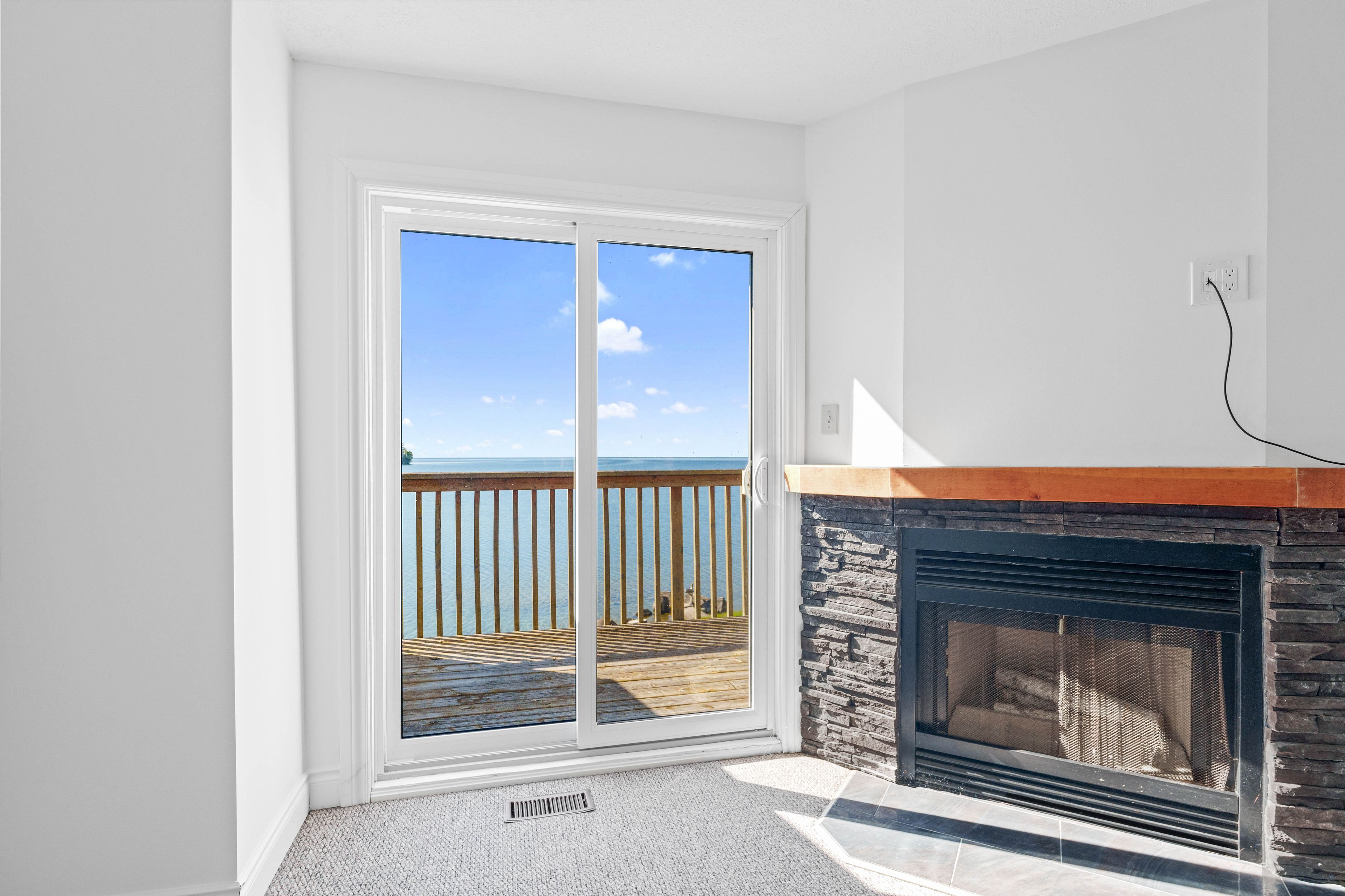 • Open-concept layout with a cozy wood-burning fireplace and deck access.