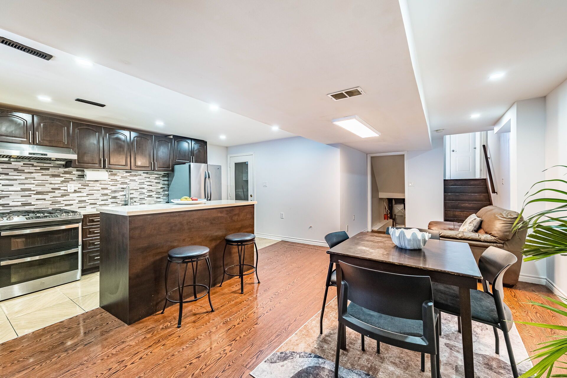 Welcome to this beautifully renovated all-brick home featuring a grand, high-ceiling foyer that makes an impressive first impression. This spacious residence offers 4 bedrooms, 3. 5 bathrooms, and 2 kitchens, making it ideal for families and investors alike. The bright, open-concept main floor showcases hardwood flooring throughout, upgraded countertops, modern window coverings, and an elegant hardwood staircase. Sun-filled living spaces feel fresh, stylish, and completely move-in ready. The home includes a fully finished, open-concept walk-out basement studio apartment with a separate entrance from both the garage and backyard, complete with its own kitchen and bathroom-perfect for in-laws, guests, or strong rental income potential. Step outside to a private backyard featuring a covered patio with vinyl roof, ideal for relaxing or entertaining. Additional highlights include 3 parking spaces, a new roof (2021), and a quiet, family-friendly neighborhood. Prime location! Conveniently close to major highways (401, 403 & 407), public transit, schools, parks, and all essential amenities.