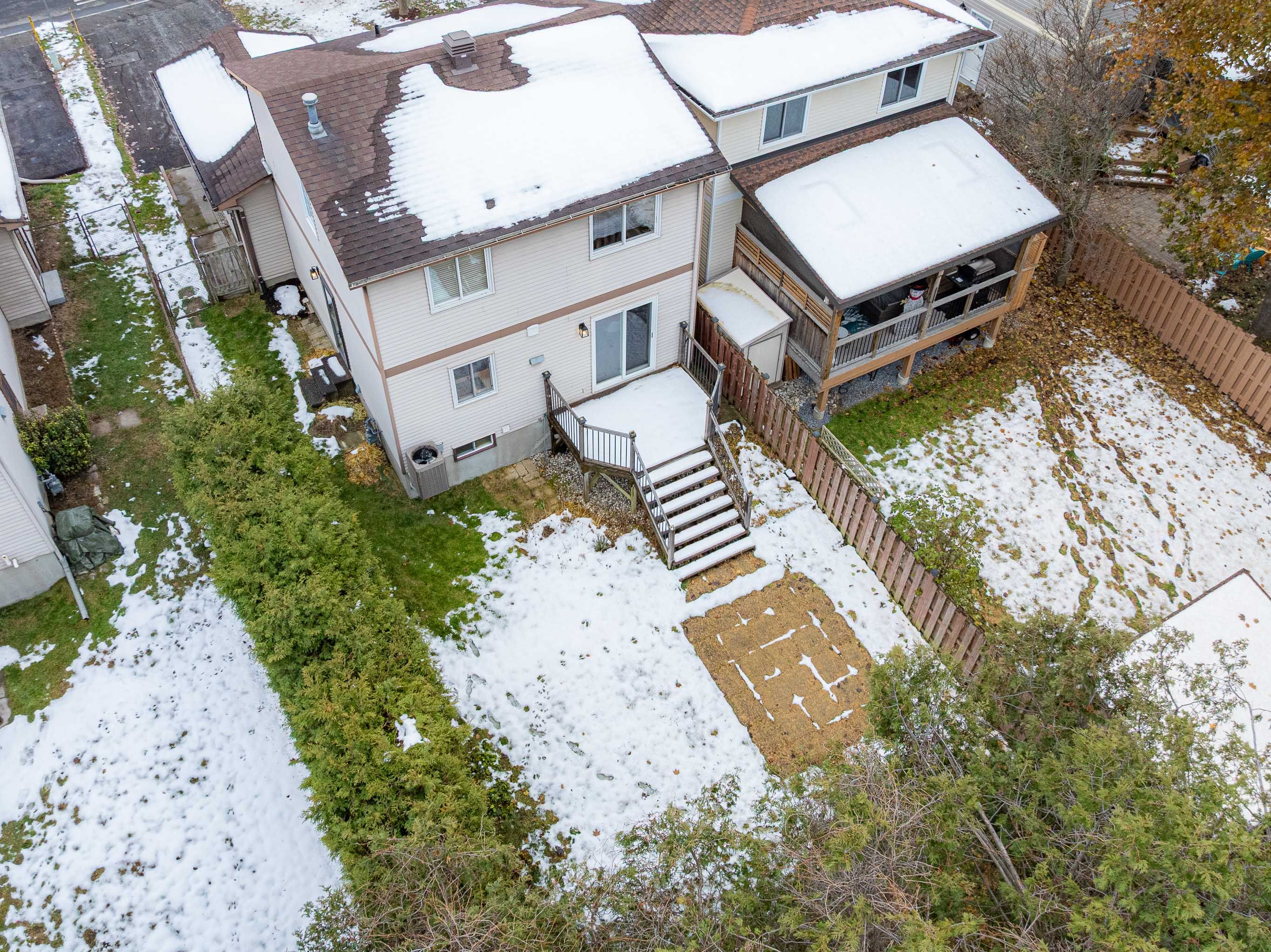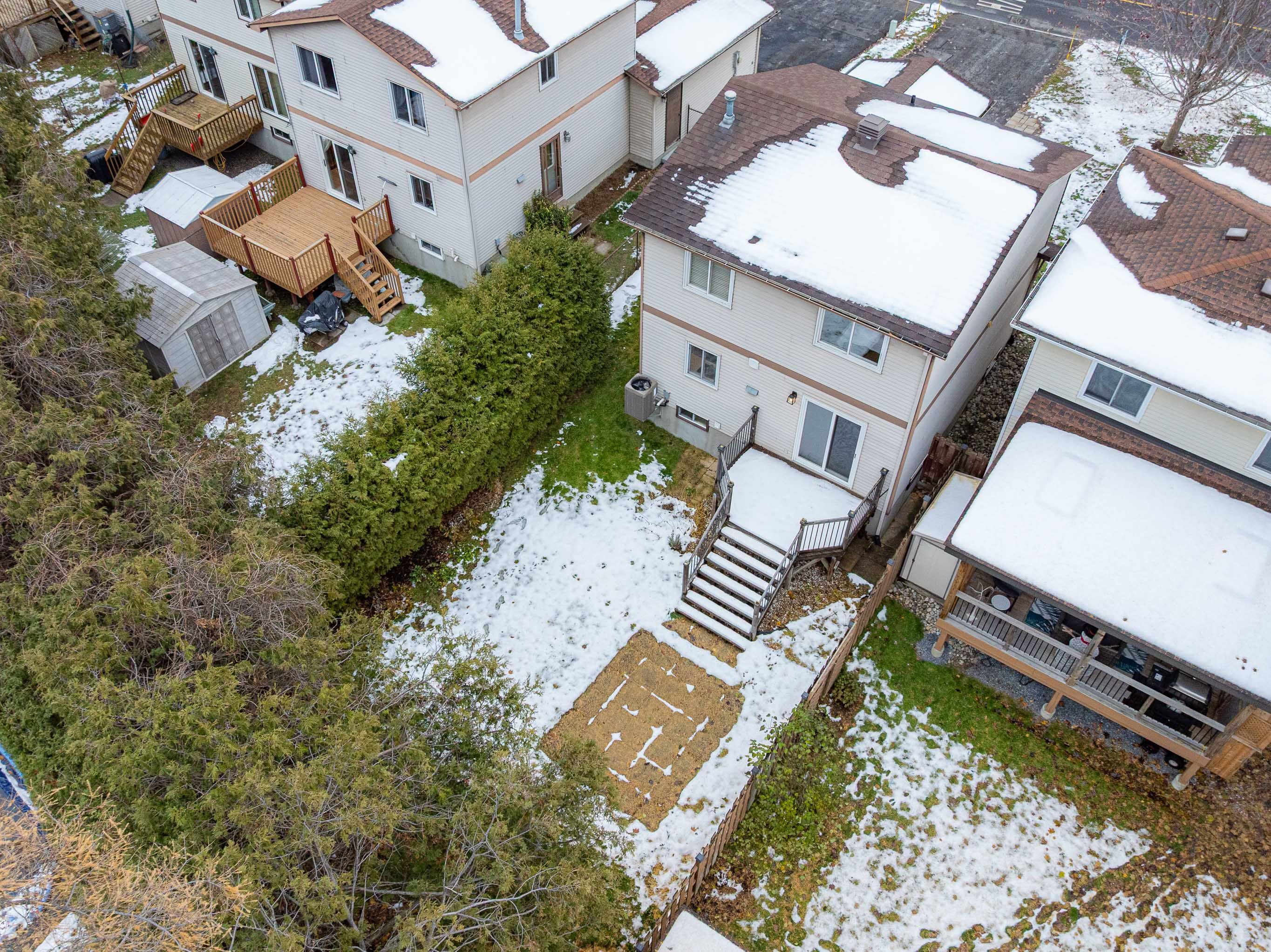 • Private fenced backyard with deck and storage shed for convenience.