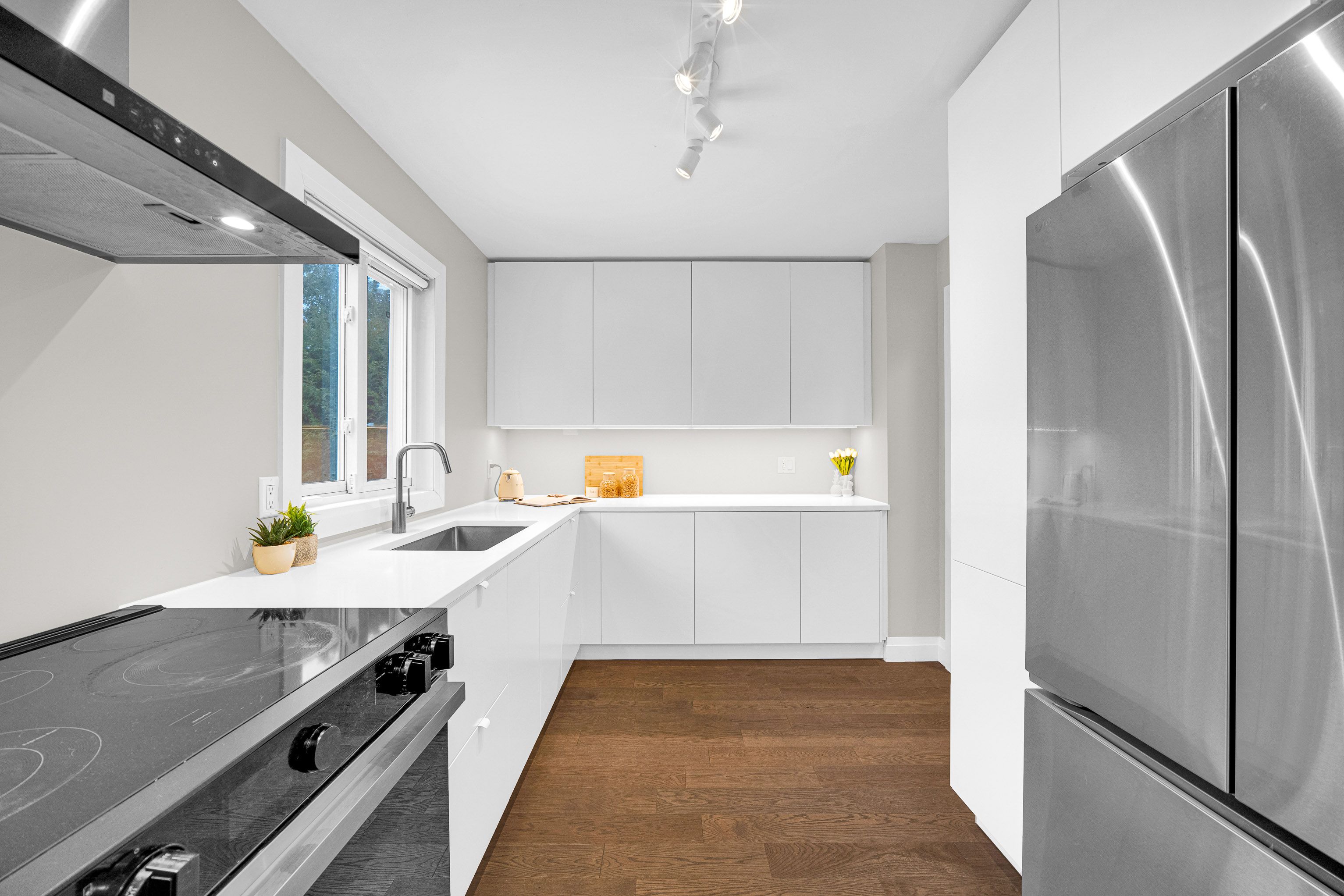 • Modern kitchen with stainless steel appliances and ample storage.