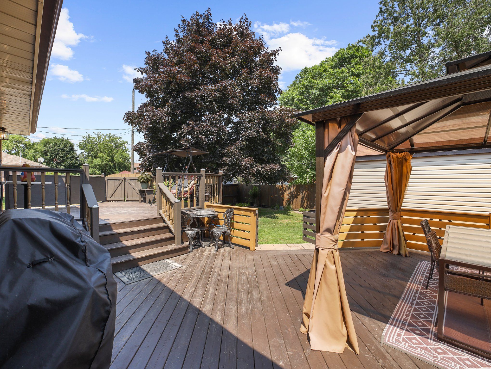 • Two-tier deck with outdoor dining area and shaded sitting space.
