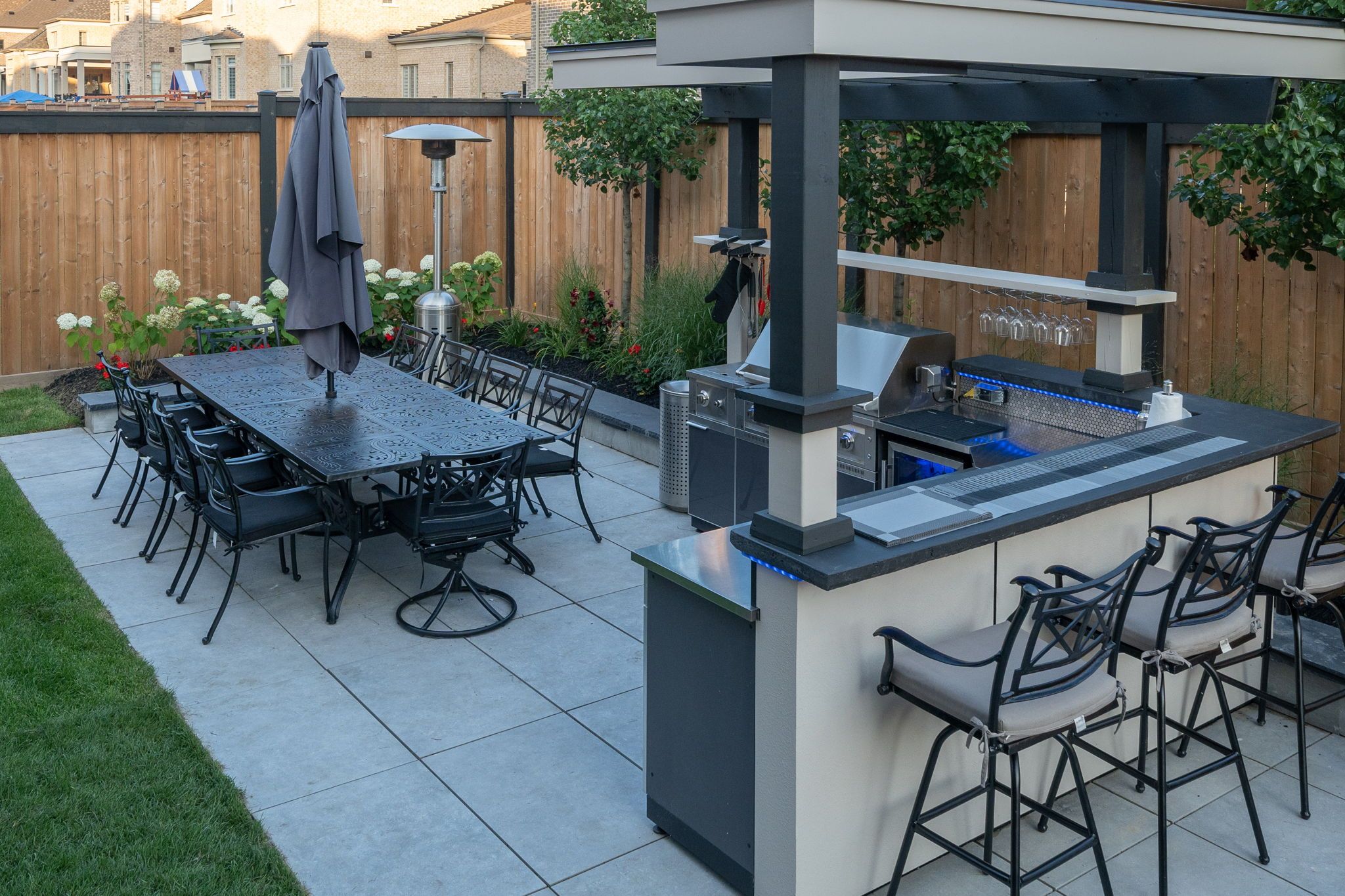 • Resort-style backyard with a pool, hot tub, and outdoor kitchen.