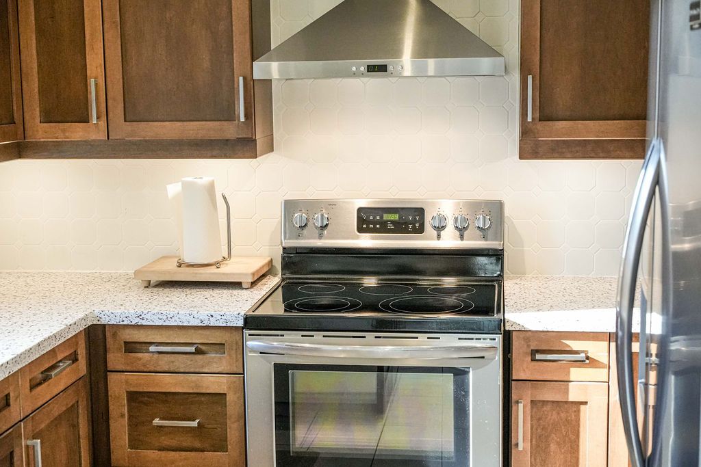 • Renovated eat-in kitchen with access to a spacious deck and backyard.