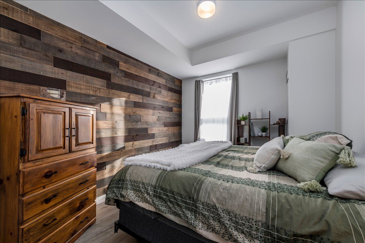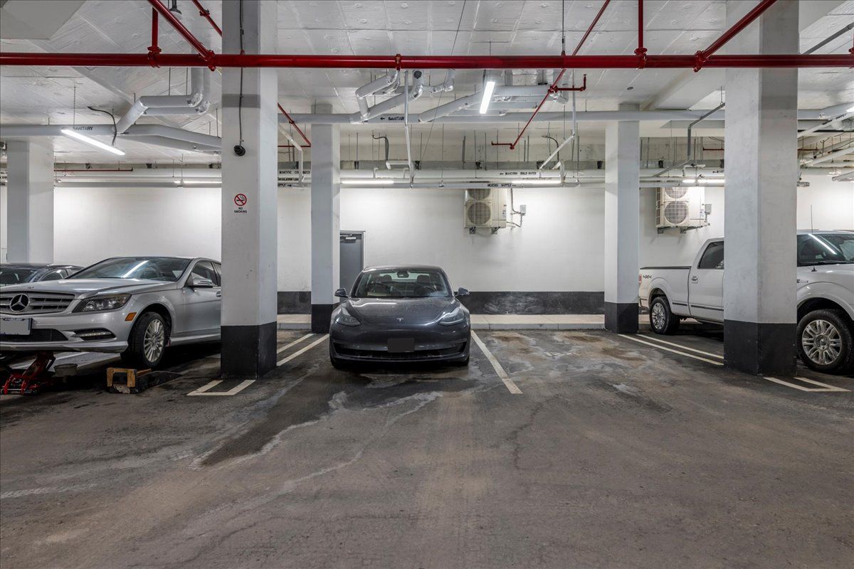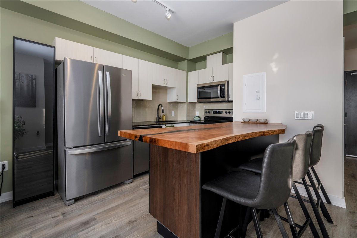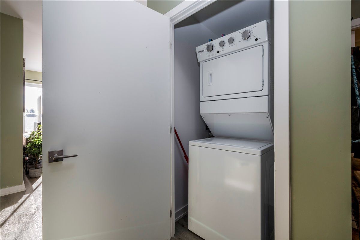 This beautifully designed one-bedroom plus den suite with two full bathrooms, offers modern comfort and thoughtful upgrades throughout. Enjoy a private 162 sq. Ft. Terrace style balcony and an open-concept layout featuring granite countertops, a striking live-edge island, laminate flooring, and stainless-steel appliances. Flat ceilings add a clean, contemporary feel, while the spacious bedroom includes a walk-in closet and a private four-piece ensuite. In-unit laundry adds everyday convenience, and the home is pet-friendly with low condo fees. The steel and concrete construction provides excellent soundproofing with no wood framing. The building offers outstanding amenities, including a fully equipped workout room, a party room available to lease for private events, and a large, shared terrace with barbecues for residents to enjoy. The unit comes with one underground parking space, a 6' x 4' storage locker, and access to an electric vehicle charger in the parking area.