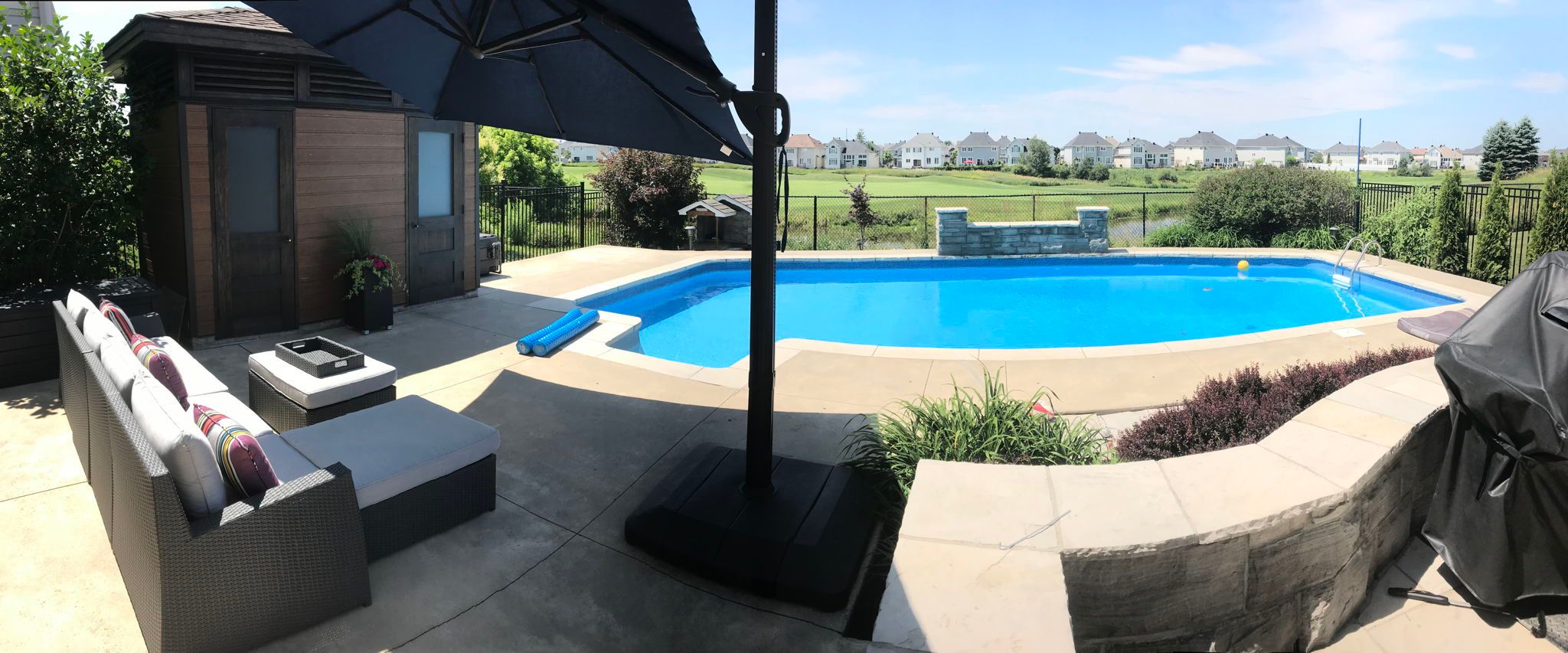 • Inviting backyard with a saltwater pool, waterfall, and equipped pool house.