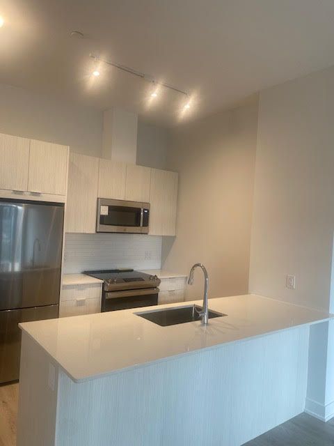 Welcome to avia your new home in the heart of the city. One-bedroom plus a large private den suite. This charming one-bedroom plus den condo offers a cozy and comfortable living space with all the essential amenities you need. The den is large enough to be used as 2nd bedroom. The open-concept design creates a seamless flow between the living, dining, and kitchen areas, providing a warm and inviting atmosphere for both relaxation and hosting friends. The kitchen features sleek stainless-steel appliances, including a fridge, stove, dishwasher, and microwave. Step out onto the extra large balcony and enjoy the fresh air while taking in the beautiful cityscape or organize a gathering of 15 people. Convenience of staying on the same floor as all the amenities enjoy easy access to highways 401, 403, and qew, the mississauga bus terminal, sheridan college, and mohawk college. You're also surrounded by restaurants, bars, and celebration square for endless entertainment options. Building amenities include a fitness center, party room, media room, outdoor patio, 24-hour concierge, and more. Whether you're starting your day with a cup of coffee or unwinding after a long day, this space offers a peaceful retreat. Nestled in a desirable neighborhood, you'll find all the amenities you need within reach. Included with the condo is one parking spot and a locker, providing ample storage options for your belongings.