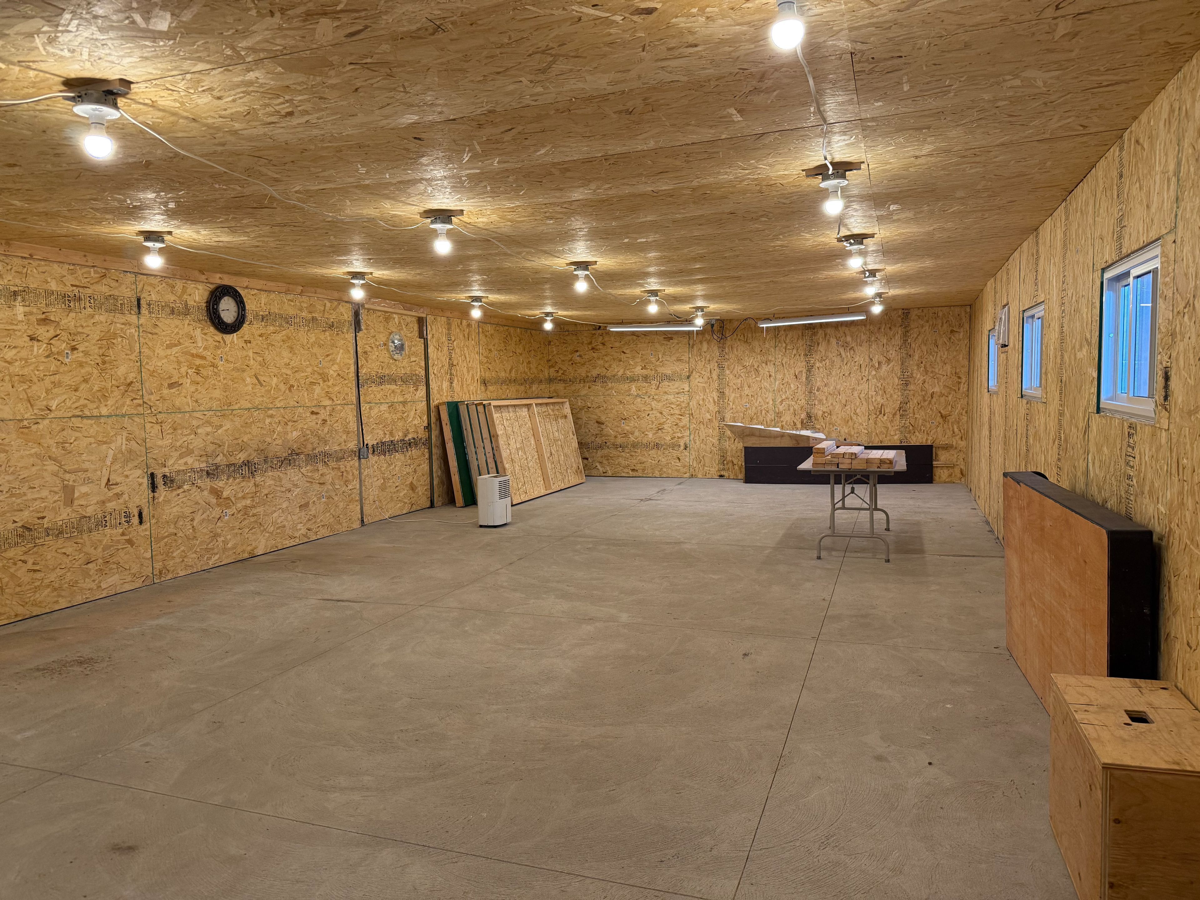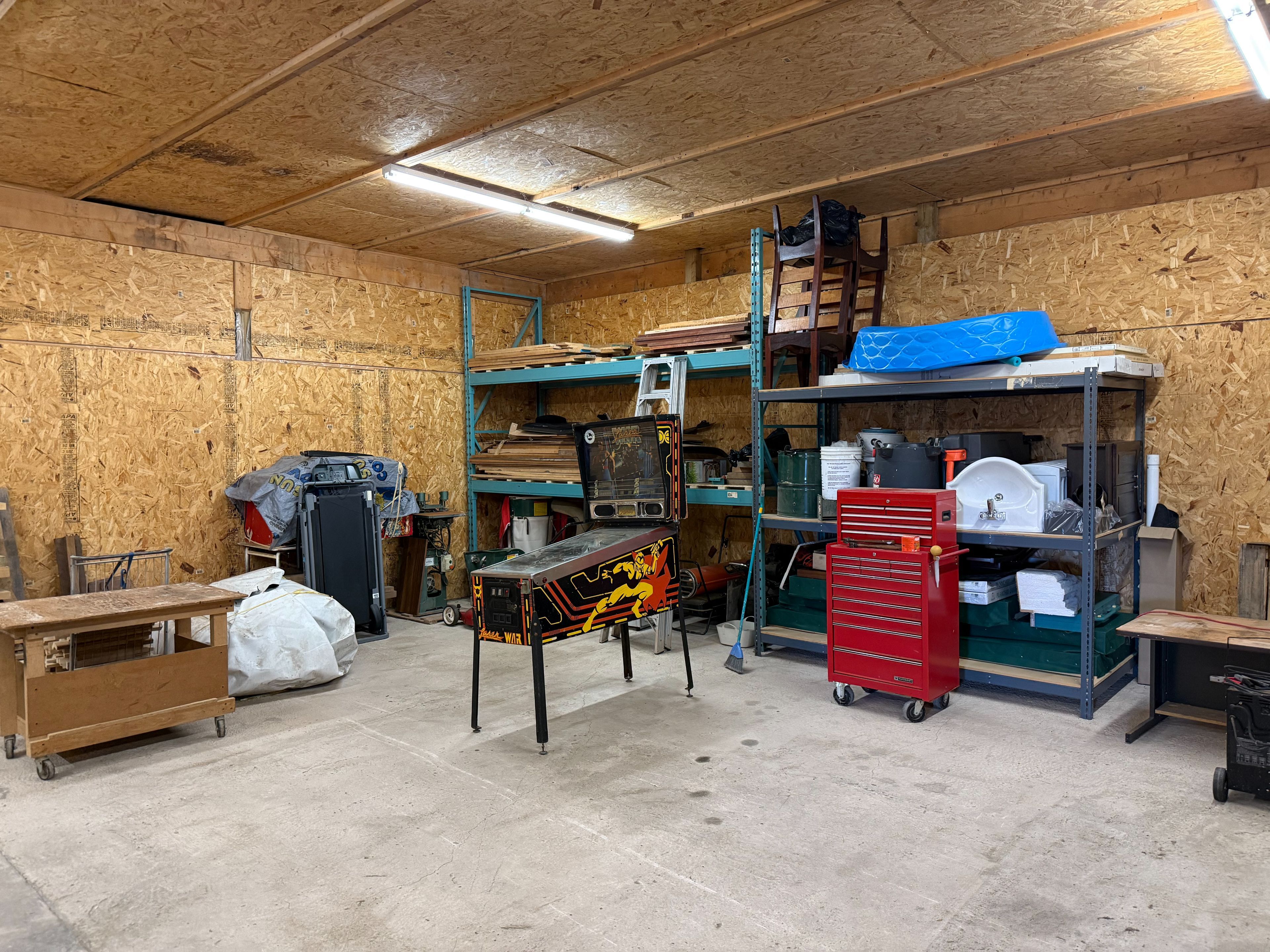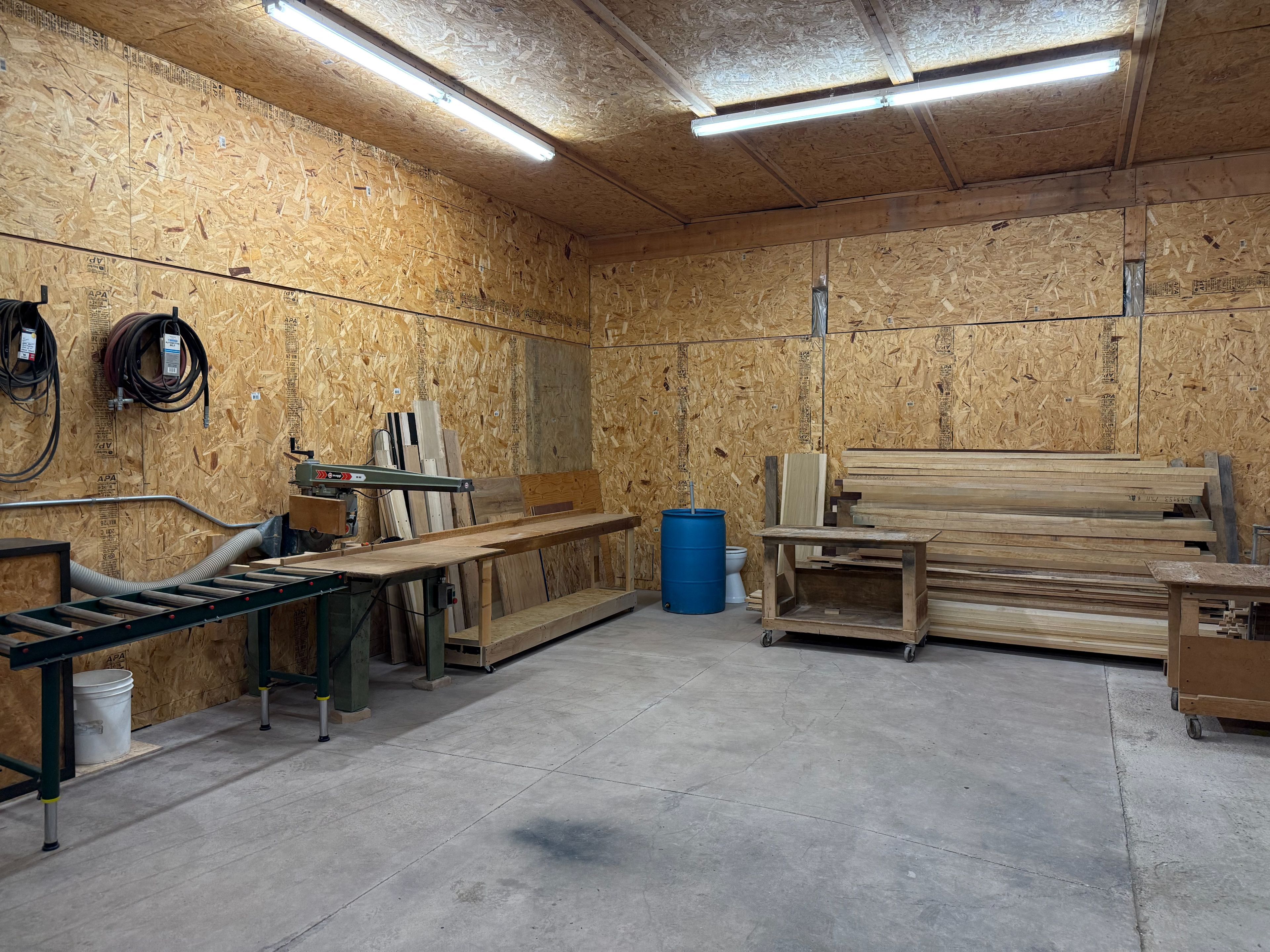 • Large workshop with high ceilings, ideal for various projects or storage.