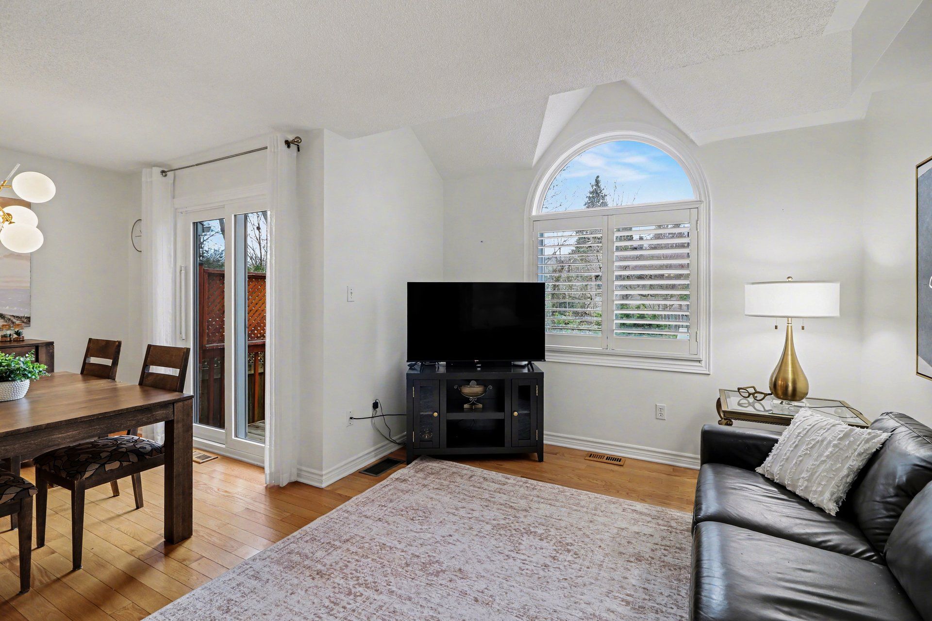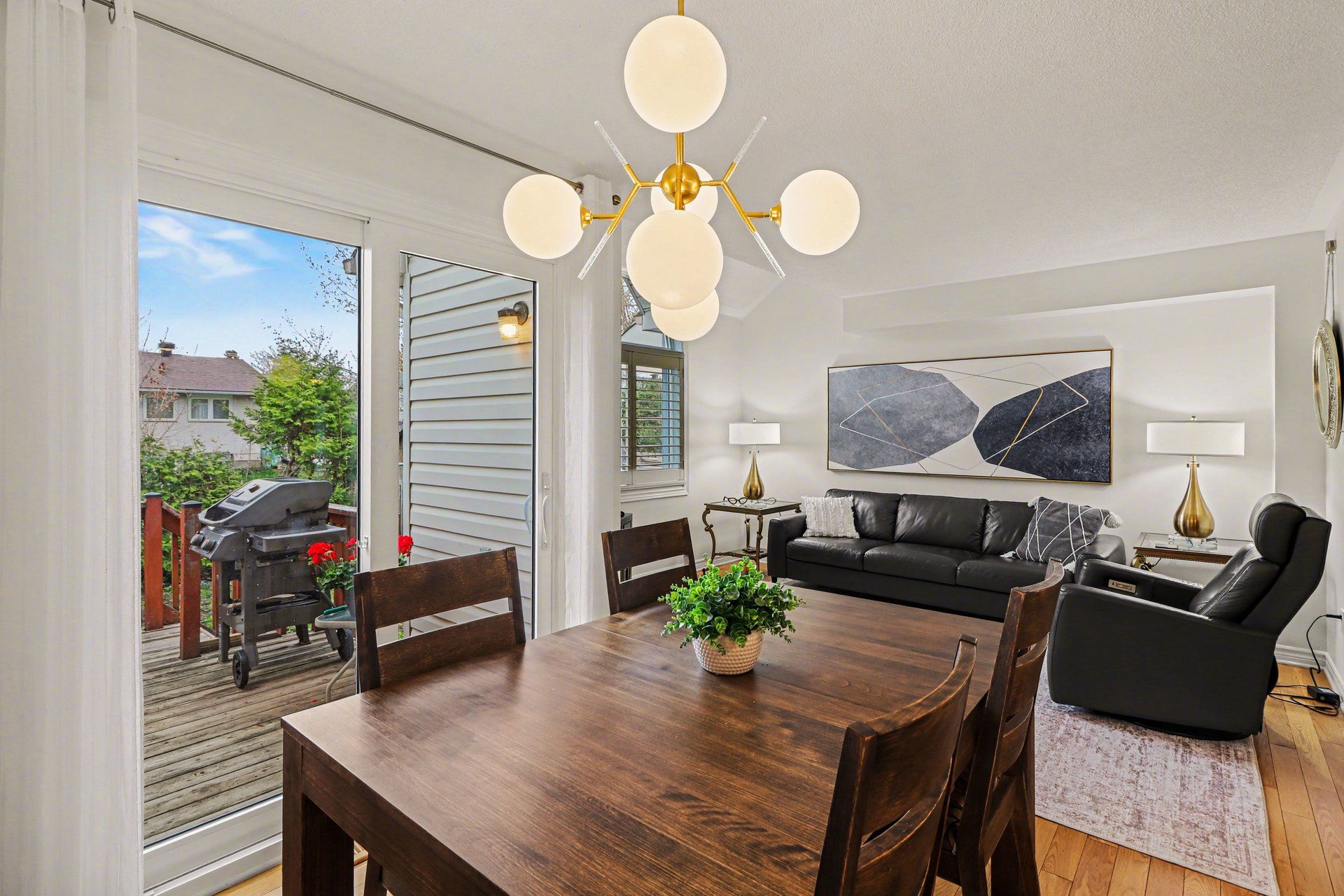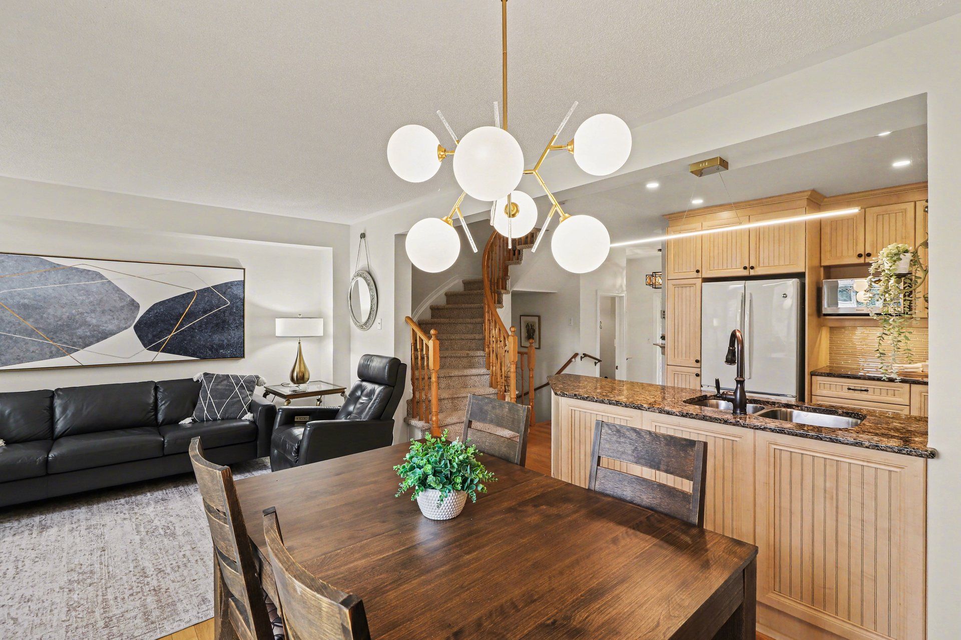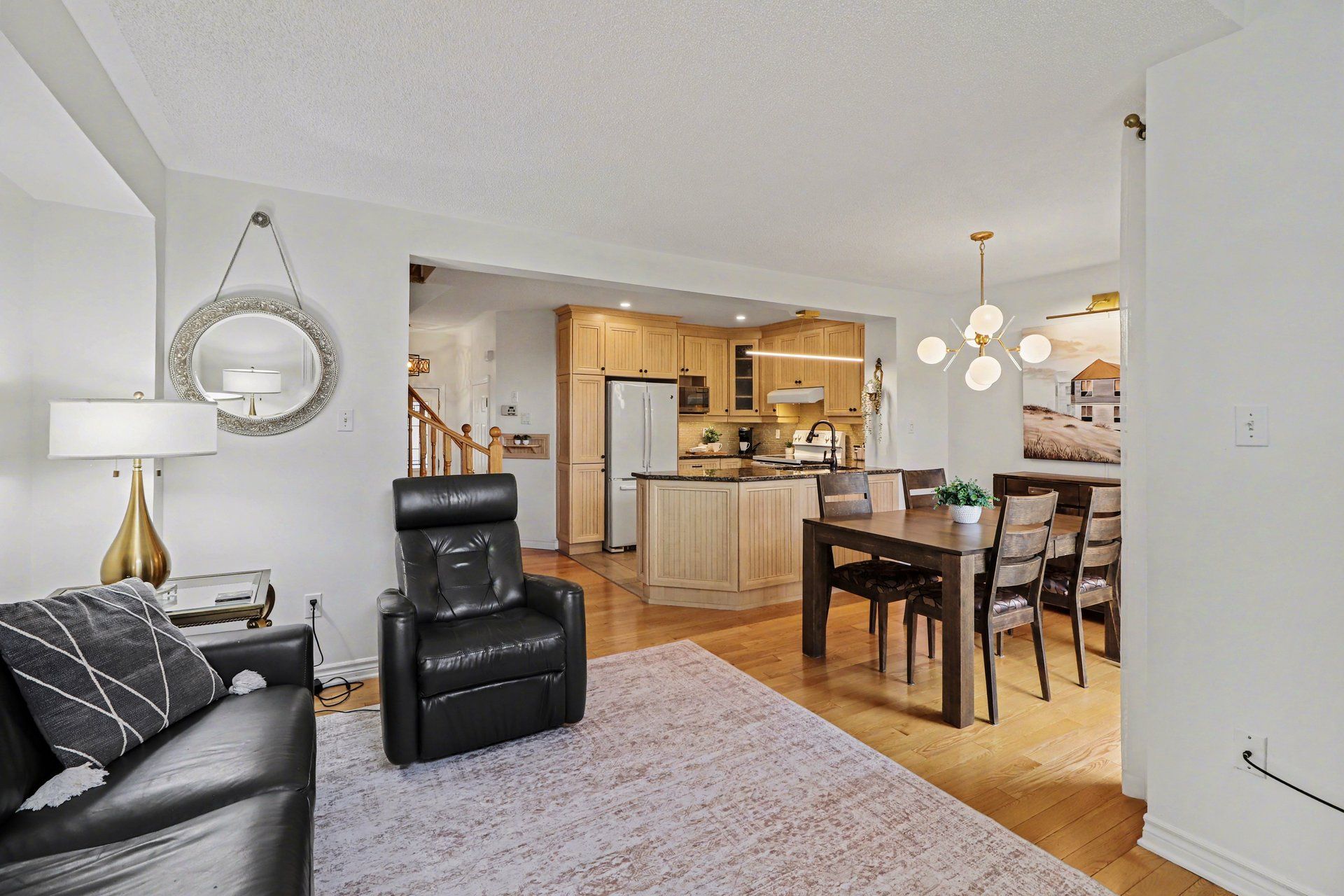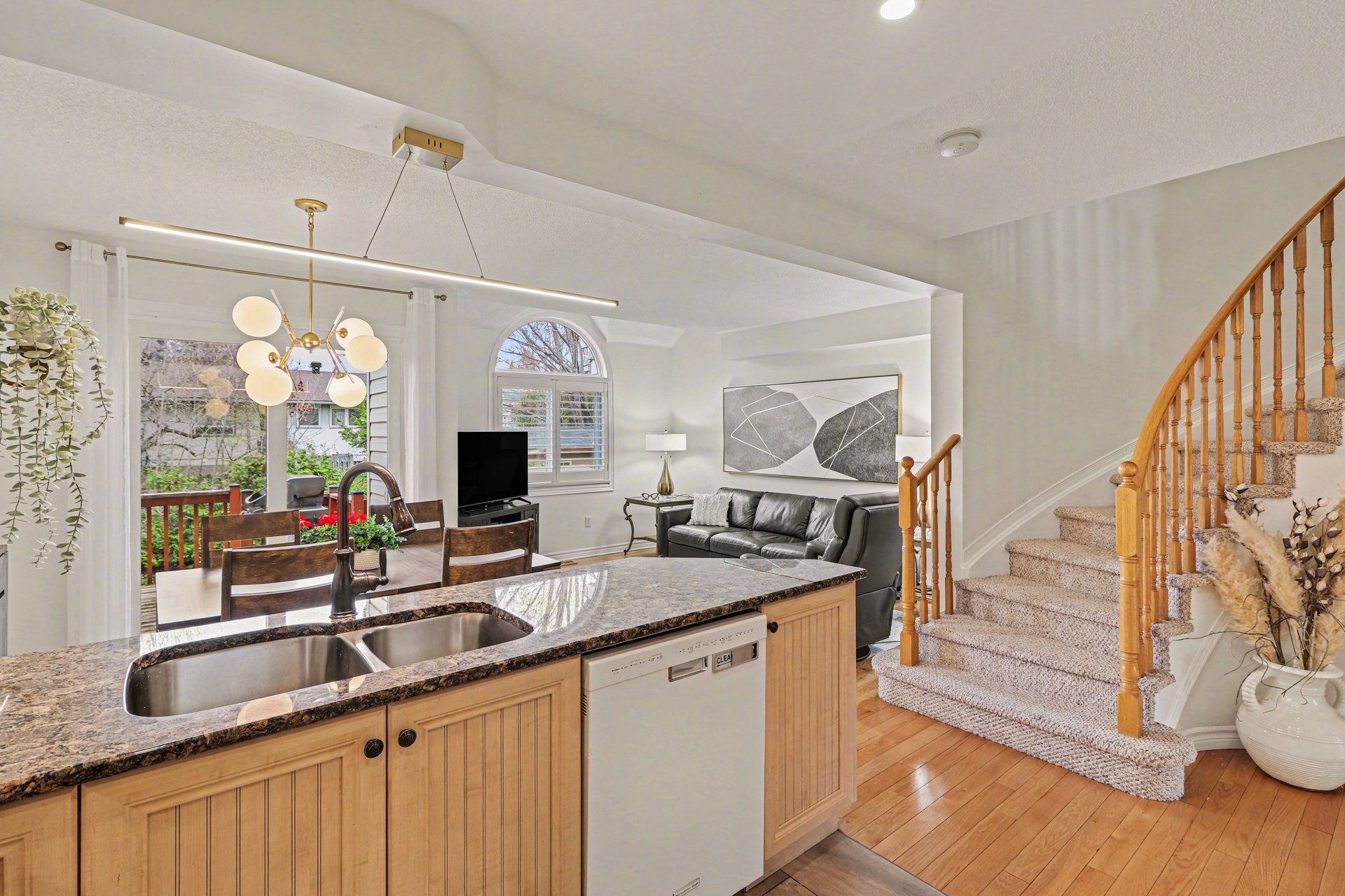 • Bright and open-concept main level with natural light and hardwood flooring.
