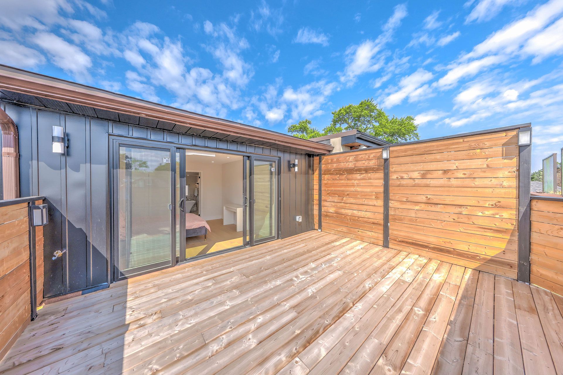 • Quiet backyard with a large deck, green area, and electric vehicle charger.